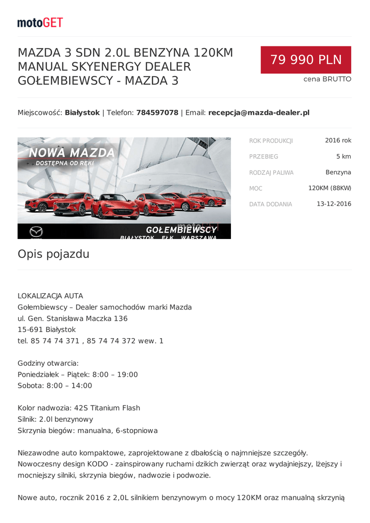 MAZDA 3 SDN 2.0L BENZYNA 120KM MANUAL SKYENERGY DEALER GOŁEMBIEWSCY - MAZDA 3 79 990 PLN cena BRUTTO Miejscowość: Białystok | Telefon: 784597078 | Email: [email protected] 2016 rok 5 km Benzyna 120KM (88KW) 13-12-2016 Opis pojazdu LOKALIZACJA AUTA Gołembiewscy – Dealer samochodów marki Mazda ul. Gen. Stanisława Maczka 136 15-691 Białystok tel. 85 74 74 371 , 85 74 74 372 wew. 1 Godziny otwarcia: Poniedziałek – Piątek: 8:00 – 19:00 Sobota: 8:00 – 14:00 Kolor nadwozia: 42S Titanium Flash Silnik: 2.0l benzynowy Skrzynia biegów: manualna, 6-stopniowa Niezawodne auto kompaktowe, zaprojektowane z dbałością o najmniejsze szczegóły. Nowoczesny design KODO - zainspirowany ruchami dzikich zwierząt oraz wydajniejszy, lżejszy i mocniejszy silniki, skrzynia biegów, nadwozie i podwozie. Nowe auto, rocznik 2016 z 2,0L silnikiem benzynowym o mocy 120KM oraz manualną skrzynią biegów. Bogata wersja wyposażeniowa SkyENERGY zawierająca między innymi: czujniki parkowania tylne, podgrzewane fotele, aluminiowe felgi 16" i wiele innych elementów w standardzie. AUTO DOSTĘPNE OD RĘKI!! Zapraszamy do odbycia jazdy testowej i skorzystania z naszej oferty! Zdjęcie przykładowe. W ofercie posiadamy również preferencyjne kredyty oraz ubezpieczenia Mazda nawet do 12-ego roku eksploatacji. Sprawdź ofertę – nie przepłacaj. Zastrzeżenie: Informacje zawarte na tej stronie nie stanowią oferty w rozumieniu przepisów ustawy z dnia 23 kwietnia 1964 r. Kodeks cywilny (Dz. U. Nr 16, poz. 93 z zm.) i nie mogą stanowić podstawy do dochodzenia roszczeń w rozumieniu przepisów ustawy z dnia 27 lipca 2002 r. o szczególnych warunkach sprzedaży konsumenckiej (Dz. U. Nr 141, poz. 1176 z zm.). Zastrzegamy sobie prawo do pomyłki lub błędu.