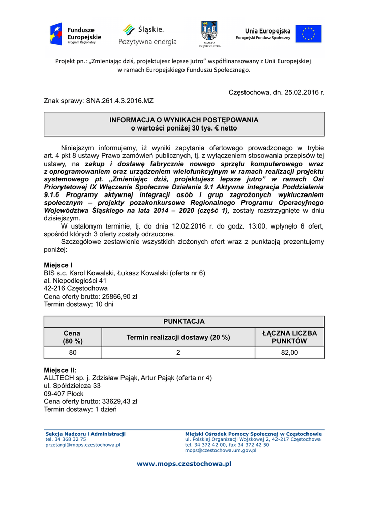 Projekt pn.: „Zmieniając dziś, projektujesz lepsze jutro” współfinansowany z Unii Europejskiej w ramach Europejskiego Funduszu Społecznego. Częstochowa, dn. 25.02.2016 r. Znak sprawy: SNA.261.4.3.2016.MZ INFORMACJA O WYNIKACH POSTĘPOWANIA o wartości poniżej 30 tys. € netto Niniejszym informujemy, iż wyniki zapytania ofertowego prowadzonego w trybie art. 4 pkt 8 ustawy Prawo zamówień publicznych, tj. z wyłączeniem stosowania przepisów tej ustawy, na zakup i dostawę fabrycznie nowego sprzętu komputerowego wraz z oprogramowaniem oraz urządzeniem wielofunkcyjnym w ramach realizacji projektu systemowego pt. „Zmieniając dziś, projektujesz lepsze jutro” w ramach Osi Priorytetowej IX Włączenie Społeczne Działania 9.1 Aktywna integracja Poddziałania 9.1.6 Programy aktywnej integracji osób i grup zagrożonych wykluczeniem społecznym – projekty pozakonkursowe Regionalnego Programu Operacyjnego Województwa Śląskiego na lata 2014 – 2020 (część 1), zostały rozstrzygnięte w dniu dzisiejszym. W ustalonym terminie, tj. do dnia 12.02.2016 r. do godz. 13:00, wpłynęło 6 ofert, spośród których 3 oferty zostały odrzucone. Szczegółowe zestawienie wszystkich złożonych ofert wraz z punktacją prezentujemy poniżej: Miejsce I BIS s.c. Karol Kowalski, Łukasz Kowalski (oferta nr 6) al. Niepodległości 41 42-216 Częstochowa Cena oferty brutto: 25866,90 zł Termin dostawy: 10 dni PUNKTACJA Cena (80 %) Termin realizacji dostawy (20 %) ŁĄCZNA LICZBA PUNKTÓW 80 2 82,00 Miejsce II: ALLTECH sp. j. Zdzisław Pająk, Artur Pająk (oferta nr 4) ul. Spółdzielcza 33 09-407 Płock Cena oferty brutto: 33629,43 zł Termin dostawy: 1 dzień Sekcja Nadzoru i Administracji tel. 34 368 32 75 [email protected] Miejski Ośrodek Pomocy Społecznej w Częstochowie ul. Polskiej Organizacji Wojskowej 2, 42-217 Częstochowa tel. 34 372 42 00, fax 34 372 42 50 [email protected] www.mops.czestochowa.pl PUNKTACJA Cena (80 %) Termin realizacji dostawy (20 %) ŁĄCZNA LICZBA PUNKTÓW 61,53 20 81,53 Miejsce III: Elblag.net Jarosław Przyłucki (oferta nr 3) ul. Góra Maślana 44 82-316 Milejewo Cena oferty brutto: 35380,95 zł Termin dostawy: 1 dzień PUNKTACJA Cena (80 %) Termin realizacji dostawy (20 %) ŁĄCZNA LICZBA PUNKTÓW 58,49 20 78,49 OFERTY ODRZUCONE: Oferta nr 1 MaN COMPLEX Grzywna Marek, Łapacz Norbert ul. W. Przyborowskiego 4/1 25-417 Kielce Cena oferty brutto: 35294,85 zł Termin dostawy: 10 dni Uzasadnienie: Brak dołączonego wielofunkcyjnego. do oferty wydruku Energy Star dla oferowanego urządzenia Oferta nr 2 SunTAR sp. z o.o. ul. Boya Żeleńskiego 5B 33-100 Tarnów Cena oferty brutto: 24911,19 zł Termin dostawy: 1 dzień Uzasadnienie: Nieuzupełnienie wymaganych dokumentów na wezwanie. Oferta nr 5 Komputer 3000 sp. z o.o. ul. Moniuszki 12 21-500 Biała Podlaska Cena oferty brutto: 23601,24 zł Termin dostawy: 5 dni Uzasadnienie: Nieuzupełnienie wymaganych dokumentów na wezwanie. Strona 2 z 3 Jako najkorzystniejszą wybrano ofertę firmy: BIS s.c. Karol Kowalski, Łukasz Kowalski al. Niepodległości 41 42-216 Częstochowa Dziękujemy za udział w postępowaniu. Strona 3 z 3