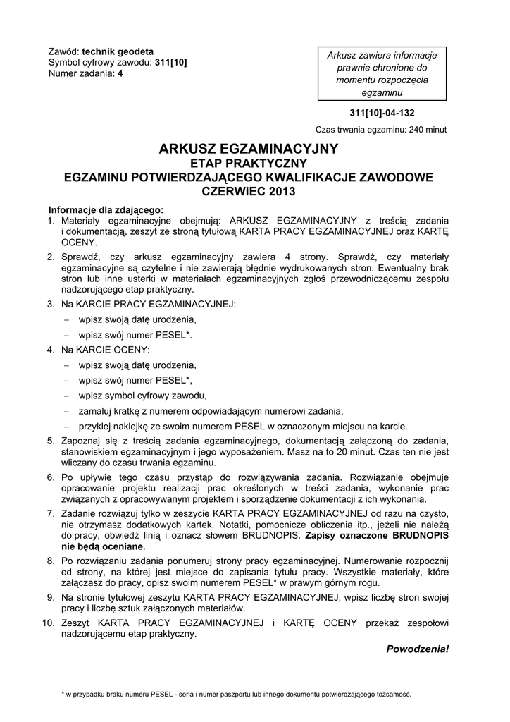 Zawód: technik geodeta Symbol cyfrowy zawodu: 311[10] Numer zadania: 4 Arkusz zawiera informacje prawnie chronione do momentu rozpoczCcia egzaminu 311[10]-04-152 Czas trwania egzaminu: 240 minut ARKUSZ EGZAMINACYJNY ETAP PRAKTYCZNY EGZAMINU POTWIERDZAJ=CEGO KWALIFIKACJE ZAWODOWE CZERWIEC 2015 Informacje dla zdaj>cego: 1. MateriaŽy egzaminacyjne obejmuj>: ARKUSZ EGZAMINACYJNY z treWci> zadania i dokumentacj>, zeszyt ze stron> tytuŽow> KARTA PRACY EGZAMINACYJNEJ oraz KARTB OCENY. 2. Sprawda, czy arkusz egzaminacyjny zawiera 4 strony. Sprawda, czy materiaŽy egzaminacyjne s> czytelne i nie zawieraj> bŽCdnie wydrukowanych stron. Ewentualny brak stron lub inne usterki w materiaŽach egzaminacyjnych zgŽoW przewodnicz>cemu zespoŽu nadzoruj>cego etap praktyczny. 3. Na KARCIE PRACY EGZAMINACYJNEJ: / wpisz swoj> datC urodzenia, / wpisz swój numer PESEL*. 4. Na KARCIE OCENY: / wpisz swoj> datC urodzenia, / wpisz swój numer PESEL*, / wpisz symbol cyfrowy zawodu, / zamaluj kratkC z numerem odpowiadaj>cym numerowi zadania, / przyklej naklejkC ze swoim numerem PESEL w oznaczonym miejscu na karcie. 5. Zapoznaj siC z treWci> zadania egzaminacyjnego, dokumentacj> zaŽ>czon> do zadania, stanowiskiem egzaminacyjnym i jego wyposaceniem. Masz na to 20 minut. Czas ten nie jest wliczany do czasu trwania egzaminu. 6. Po upŽywie tego czasu przyst>p do rozwi>zywania zadania. Rozwi>zanie obejmuje opracowanie projektu realizacji prac okreWlonych w treWci zadania, wykonanie prac zwi>zanych z opracowywanym projektem i sporz>dzenie dokumentacji z ich wykonania. 7. Zadanie rozwi>zuj tylko w zeszycie KARTA PRACY EGZAMINACYJNEJ od razu na czysto, nie otrzymasz dodatkowych kartek. Notatki, pomocnicze obliczenia itp., jeceli nie nalec> do pracy, obwieda lini> i oznacz sŽowem BRUDNOPIS. Zapisy oznaczone BRUDNOPIS nie bCd> oceniane. 8. Po rozwi>zaniu zadania ponumeruj strony pracy egzaminacyjnej. Numerowanie rozpocznij od strony, na której jest miejsce do zapisania tytuŽu pracy. Wszystkie materiaŽy, które zaŽ>czasz do pracy, opisz swoim numerem PESEL* w prawym górnym rogu. 9. Na stronie tytuŽowej zeszytu KARTA PRACY EGZAMINACYJNEJ, wpisz liczbC stron swojej pracy i liczbC sztuk zaŽ>czonych materiaŽów. 10. Zeszyt KARTA PRACY EGZAMINACYJNEJ i KARTB OCENY przekac zespoŽowi nadzoruj>cemu etap praktyczny. Powodzenia! * w przypadku braku numeru PESEL - seria i numer paszportu lub innego dokumentu potwierdzaj>cego tocsamoW5. Zadanie egzaminacyjne Firma „GEO-BIS” otrzymaŽa zadanie wytyczenia punktu kierunkowego M0, który ma lece5 na prostej P-K oraz wyznaczenia wysokoWci punktów P i K. Punkty P i K s> niedostCpne do pomiaru, ale mocna je zasygnalizowa5 lustrami. WysokoWci sygnaŽów (luster) s> jednakowe i wynosz>: sP = sK = 2,00 m. Punkty M1 i M2 s> stanowiskami pomiarowymi, nie lec>cymi na tej prostej P-K. WysokoWci punktów M1 i M2 s> jednakowe i wynosz>: HM1 = HM2 = 200,00 m. Opracuj projekt realizacji prac pomiarowych i obliczeniowych, maj>cych na celu wyznaczenie przesuniC5 d1 i d2 oraz okreWlenie wysokoWci punktów P i K. Wykonaj niezalecne obliczenie kontrolne wartoWci przesuniCcia d2. Dodatkowo zmierz ruletk> odcinek M1–M2 i porównaj go z wielkoWci> obliczon> ze wzoru: Wyniki podaj z dokŽadnoWci> do 0,01 m. Projekt realizacji prac powinien zawiera5: 1. TytuŽ pracy egzaminacyjnej wynikaj>cy z treWci zadania. 2. ZaŽocenia do projektu (dane), wynikaj>ce z treWci zadania oraz zaŽ>czników. 3. Wykaz prac geodezyjnych zwi>zanych z wykonaniem pomiarów terenowych z zachowaniem ich kolejnoWci. 4. Wykaz prac zwi>zanych z obliczeniem odlegŽoWci poziomych d1 i d2 oraz wysokoWci punktów P i K. 5. Wykaz instrumentów, sprzCtu geodezyjnego i dokumentacji pomiarowej niezbCdnej do wykonania zadania. 6. DokumentacjC z wykonania pomiarów geodezyjnych: /" dziennik pomiaru dŽugoWci – Tabela 1, /" dziennik pomiaru k>tów poziomych – Tabela 2, /" dziennik pomiaru k>tów pionowych – Tabela 3, 7. /" szkic polowy z wpisanymi pomierzonymi i obliczonymi wielkoWciami. DokumentacjC z wykonania prac kameralnych: /" obliczenie k>tów poziomych 1 i 2, /" obliczenie wartoWci przesuniC5 d1 i d2, /" obliczenia kontrolne, /" obliczenie rócnic wysokoWci pomiCdzy punktami M1 i P oraz M1 i K, /" obliczenie rócnic wysokoWci pomiCdzy punktami M2 i P oraz M2 i K, /" dwukrotne obliczenie wysokoWci punktów P i K, /" obliczenie Wrednich wysokoWci punktów P i K. Strona 2 z 4 Do wykonania zadania wykorzystaj: Szkic sytuacyjny poŽocenia punktów (rzut poziomy i pionowy)..................................ZaŽ>cznik 1. Wzory do rozwi>zania zadania .................................................................................ZaŽ>cznik 2. oraz zamieszczone w KARCIE PRACY EGZAMINACYJNEJ: /" Dziennik pomiaru dŽugoWci – Tabela 1, /" Dziennik pomiaru k>tów poziomych – Tabela 2, /" Dziennik pomiaru k>tów pionowych – Tabela 3, /" Szkic polowy wzajemnego poŽocenia punktów z danymi pomierzonymi i obliczonymi. Czas przeznaczony na wykonanie zadania wynosi 240 minut. Strona 3 z 4 ZaŽ>cznik 1. Szkic sytuacyjny poŽocenia punktów ZaŽ>cznik 2. Strona 4 z 4