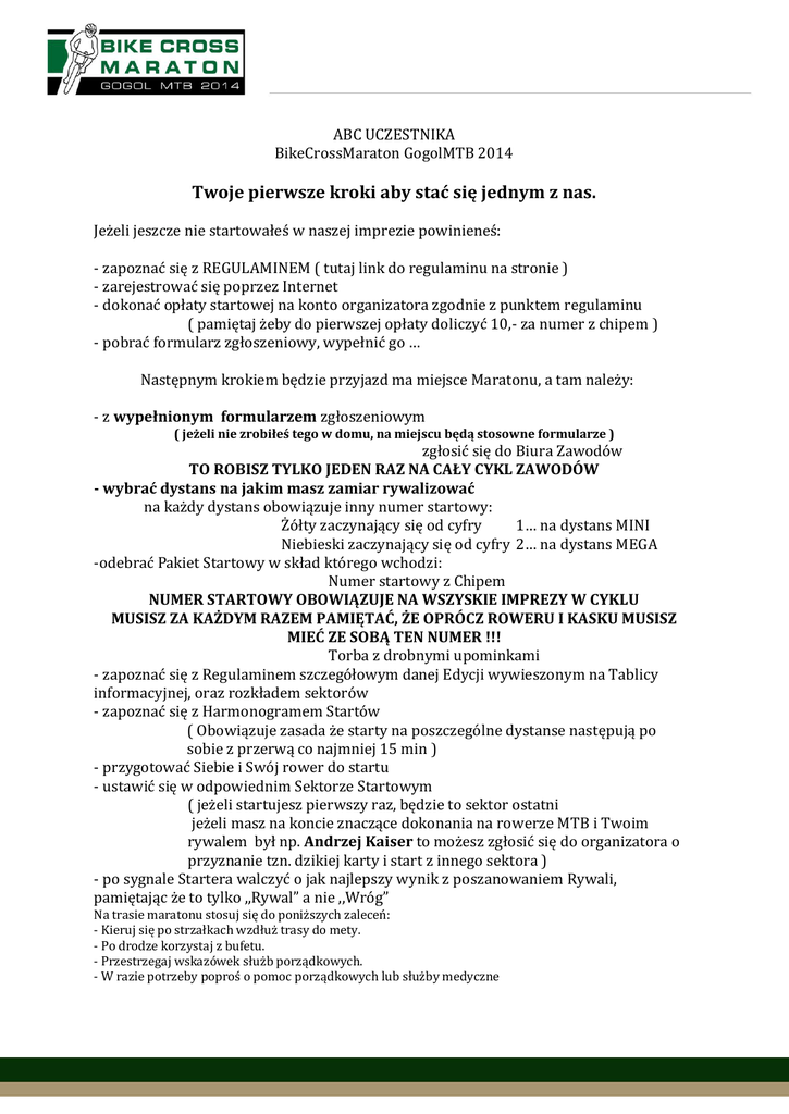 ABC UCZESTNIKA BikeCrossMaraton GogolMTB 2014 Twoje pierwsze kroki aby stać się jednym z nas. Jeżeli jeszcze nie startowałeś w naszej imprezie powinieneś: - zapoznać się z REGULAMINEM ( tutaj link do regulaminu na stronie ) - zarejestrować się poprzez Internet - dokonać opłaty startowej na konto organizatora zgodnie z punktem regulaminu ( pamiętaj żeby do pierwszej opłaty doliczyć 10,- za numer z chipem ) - pobrać formularz zgłoszeniowy, wypełnić go … Następnym krokiem będzie przyjazd ma miejsce Maratonu, a tam należy: - z wypełnionym formularzem zgłoszeniowym ( jeżeli nie zrobiłeś tego w domu, na miejscu będą stosowne formularze ) zgłosić się do Biura Zawodów TO ROBISZ TYLKO JEDEN RAZ NA CAŁY CYKL ZAWODÓW - wybrać dystans na jakim masz zamiar rywalizować na każdy dystans obowiązuje inny numer startowy: Żółty zaczynający się od cyfry 1… na dystans MINI Niebieski zaczynający się od cyfry 2… na dystans MEGA -odebrać Pakiet Startowy w skład którego wchodzi: Numer startowy z Chipem NUMER STARTOWY OBOWIĄZUJE NA WSZYSKIE IMPREZY W CYKLU MUSISZ ZA KAŻDYM RAZEM PAMIĘTAĆ, ŻE OPRÓCZ ROWERU I KASKU MUSISZ MIEĆ ZE SOBĄ TEN NUMER !!! Torba z drobnymi upominkami - zapoznać się z Regulaminem szczegółowym danej Edycji wywieszonym na Tablicy informacyjnej, oraz rozkładem sektorów - zapoznać się z Harmonogramem Startów ( Obowiązuje zasada że starty na poszczególne dystanse następują po sobie z przerwą co najmniej 15 min ) - przygotować Siebie i Swój rower do startu - ustawić się w odpowiednim Sektorze Startowym ( jeżeli startujesz pierwszy raz, będzie to sektor ostatni jeżeli masz na koncie znaczące dokonania na rowerze MTB i Twoim rywalem był np. Andrzej Kaiser to możesz zgłosić się do organizatora o przyznanie tzn. dzikiej karty i start z innego sektora ) - po sygnale Startera walczyć o jak najlepszy wynik z poszanowaniem Rywali, pamiętając że to tylko ,,Rywal” a nie ,,Wróg” Na trasie maratonu stosuj się do poniższych zaleceń: - Kieruj się po strzałkach wzdłuż trasy do mety. - Po drodze korzystaj z bufetu. - Przestrzegaj wskazówek służb porządkowych. - W razie potrzeby poproś o pomoc porządkowych lub służby medyczne - po przekroczeniu linii i Mety skorzystać z Bufetu gdzie będzie można uzupełnić płyny oraz skonsumować owoce przygotowane przez organizatora - doprowadzić do jako takiego porządku Siebie i swój rower - udać się w okolice Podium w oczekiwaniu na Dekorację oraz Tombolę w międzyczasie wymieniając na ,,gorąco” uwagi co do odbytego maratonu z innymi uczestnikami -bezpiecznie powrócić do domu, bo za jakiś czas trzeba będzie przyjechać na następną imprezę Jeżeli uważasz że Twój debiut w naszej imprezie był udany to spotykamy się na następnej Edycji Jeżeli jesteś w tym miejscu to znaczy że poprzednie imprezy były udane. Chcąc wystartować ponownie Twoje zadanie jest o wiele prostsze. Jedyne co musisz zrobić to: - dokonać rejestracji poprzez panel Zgłoszeniowy do aktualnej Edycji - wpłacić na znane Ci konto opłatę Startową - dojechać na miejsce Startu - jeżeli nie wpłaciłeś wcześniej przez Internet dokonać stosownej opłaty w biurze zawodów - jeśli zapomniałeś lub zgubiłeś swój numer startowy , zgłoś się w Biurze Zawodów w celu wykupienia nowego. Niestety opłata za kolejny numer startowy wynosi 20 zł. - sprawdzić na Liście Startowej do którego sektora zostałeś przypisany - jeżeli nie znalazłeś na liście startowej Swojego numery zgłosić uwagi do Biura Zawodów - ustawić się w odpowiednim Sektorze Startowym - postępować tak samo jak podczas Swojego pierwszego startu eliminując błędy jakie popełniłeś w poprzednim maratonie - dotrzeć na Metę i wspólnie z nowo poznanymi przyjaciółmi świętować Sukces