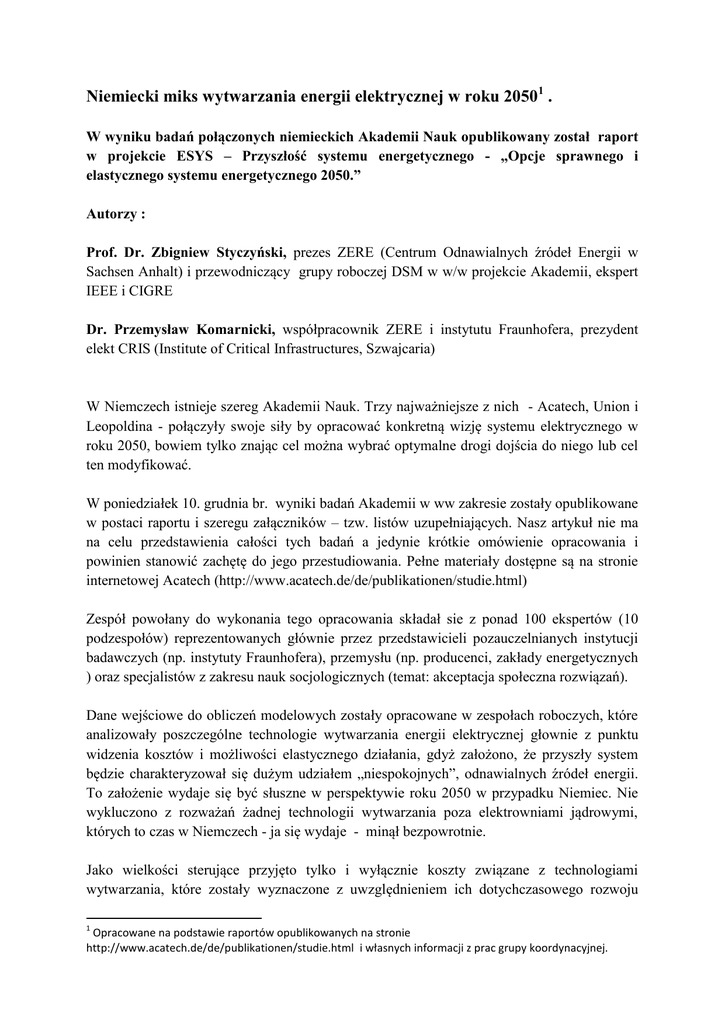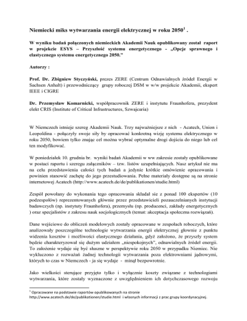 Niemiecki miks wytwarzania energii elektrycznej w roku 20501 . W wyniku badań połączonych niemieckich Akademii Nauk opublikowany został raport w projekcie ESYS – Przyszłość systemu energetycznego - „Opcje sprawnego i elastycznego systemu energetycznego 2050.” Autorzy : Prof. Dr. Zbigniew Styczyński, prezes ZERE (Centrum Odnawialnych źródeł Energii w Sachsen Anhalt) i przewodniczący grupy roboczej DSM w w/w projekcie Akademii, ekspert IEEE i CIGRE Dr. Przemysław Komarnicki, współpracownik ZERE i instytutu Fraunhofera, prezydent elekt CRIS (Institute of Critical Infrastructures, Szwajcaria) W Niemczech istnieje szereg Akademii Nauk. Trzy najważniejsze z nich - Acatech, Union i Leopoldina - połączyły swoje siły by opracować konkretną wizję systemu elektrycznego w roku 2050, bowiem tylko znając cel można wybrać optymalne drogi dojścia do niego lub cel ten modyfikować. W poniedziałek 10. grudnia br. wyniki badań Akademii w ww zakresie zostały opublikowane w postaci raportu i szeregu załączników – tzw. listów uzupełniających. Nasz artykuł nie ma na celu przedstawienia całości tych badań a jedynie krótkie omówienie opracowania i powinien stanowić zachętę do jego przestudiowania. Pełne materiały dostępne są na stronie internetowej Acatech (http://www.acatech.de/de/publikationen/studie.html) Zespół powołany do wykonania tego opracowania składał sie z ponad 100 ekspertów (10 podzespołów) reprezentowanych głównie przez przedstawicieli pozauczelnianych instytucji badawczych (np. instytuty Fraunhofera), przemysłu (np. producenci, zakłady energetycznych ) oraz specjalistów z zakresu nauk socjologicznych (temat: akceptacja społeczna rozwiązań). Dane wejściowe do obliczeń modelowych zostały opracowane w zespołach roboczych, które analizowały poszczególne technologie wytwarzania energii elektrycznej głownie z punktu widzenia kosztów i możliwości elastycznego działania, gdyż założono, że przyszły system będzie charakteryzował się dużym udziałem „niespokojnych”, odnawialnych źródeł energii. To założenie wydaje się być słuszne w perspektywie roku 2050 w przypadku Niemiec. Nie wykluczono z rozważań żadnej technologii wytwarzania poza elektrowniami jądrowymi, których to czas w Niemczech - ja się wydaje - minął bezpowrotnie. Jako wielkości sterujące przyjęto tylko i wyłącznie koszty związane z technologiami wytwarzania, które zostały wyznaczone z uwzględnieniem ich dotychczasowego rozwoju 1 Opracowane na podstawie raportów opublikowanych na stronie http://www.acatech.de/de/publikationen/studie.html i własnych informacji z prac grupy koordynacyjnej. technologicznego i wynikającej z niego aproksymacji przewidywanych kosztów wytwarzania energii na rok 2050. Ze względu na udział szerokiej bazy ekspertów wydaje się, że wielkości te można przyjąć za wiarygodne. Także inne ekonomiczne wielkości sterujące jak na przykład koszty certyfikatów CO2 zostały odpowiednio poddane aproksymacji. Niepewności w modelowaniu zostały uwzględnione poprzez dużą ilość wariantów (scenariuszów), które zostały przeanalizowane w ramach przeprowadzonych obliczeń. Jako metodologie w obliczeniach przyjęto metodę kosztów całkowitych co w pewnym stopniu ogranicza reprezentatywność wyników - z jednej strony, pozwala jednak z drugiej strony na uniezależnienie się od ścieżki dojścia do rozwiązania optymalnego (planowanie „green field”). Wyniki tego projektu przyniosły szereg interesujących rozwiązań częściowo nie oczekiwanych, które zgodnie z raportem projektu można podsumować w następujący sposób: 1. Prawie każda analizowana technologia może (z uwzględnieniem dodatkowych kosztów) znaleźć zastosowanie w końcowym miksie o ile wcześniej podjęte zostaną np. odpowiednie decyzje o preferowanych kierunkach rozwoju. 2. Ze względu na możliwą różnorodność w stosowaniu paliwa (bio gaz, gaz ziemny, H2 itd.) elektrownie gazowe stanowić będą "kręgosłup" przyszłego systemu energetyczne i gwarantować będą ciągłość zasilania nawet w wielotygodniowych okresach tzw "ciemnej ciszy" (pogoda bezwietrzna przy zachmurzonym niebie). 3. Operatywne i elastyczne sterowanie zapotrzebowaniem oraz zasobniki energii w gospodarstwach domowych i przemyśle stanowią najdogodniejszą i najtańszą możliwość wyrównywania chwilowych wahań zasilania (kilka minut do godziny). 4. Zasobniki energii dla dłuższego okresu czasu są atrakcyjne dopiero gdy system powinien oszczędzać więcej niż 80% CO2. W przypadku większych dopuszczalnych emisji bardziej opłacalne wydaje się być gromadzenie energii w postaci zamiany jej w ciepło lub ograniczenie produkcji energii z OZE. W pracy przy analizie kilkuset wariantów scenariuszy postawiono sobie kilka podstawowych pytań jak : Jaki wpływ na optymalny miks ma ograniczenie emisji CO2? Jak mógłby wyglądać system przy założeniu 100% wytwarzania energii z wykorzystaniem OZE? Jaką rolę odgrywać będą w przyszłym systemie zasobniki energii? Jakie będą systemy generacji w przyszłości: centralne czy rozproszone? Jak mogą być wykorzystywane nadwyżki produkowanej energii w OZE? Jakie są skutki tendencji uniezależnienia sie od importów energii? Pytania te pokazują rozległość badań jakie zostały wykonane w ramach tego projektu. Szczegółowe odpowiedzi na te pytania znajdziecie państwo w raporcie końcowym. Poniżej przedstawimy państwu trzy grafiki z raportu, które w sposób syntetyczny prezentują wynik obliczeń modelowych wykonanych przy wcześniej opisanych założeniach. Pierwsza (Rys. 1) przedstawia optymalne miksy generacji przy wspomnianych założeniach brzegowych dla wybranych 29 głównych scenariuszy z czego osiem z nich nosi charakter scenariuszy głównych (bazowych). Rys. 1. Produkcja energii elektrycznej brutto w 2050 roku dla różnych scenariuszy (na rysunku pozostawiono oryginalne na