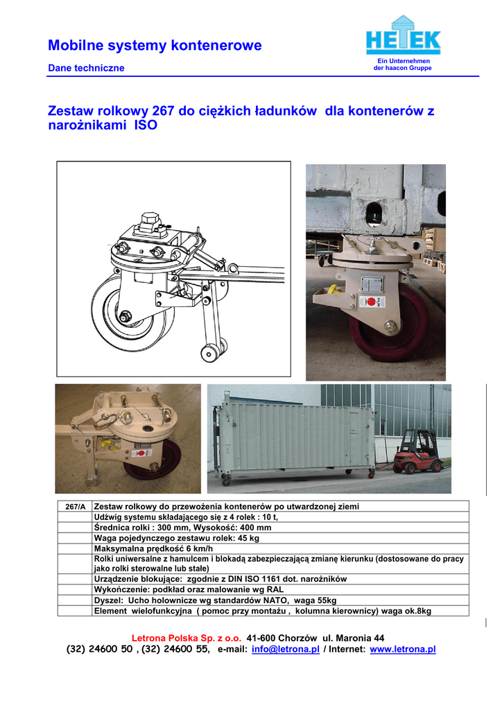 Mobilne systemy kontenerowe Dane techniczne Ein Unternehmen der haacon Gruppe Zestaw rolkowy 267 do ciężkich ładunków dla kontenerów z narożnikami ISO 267/A Zestaw rolkowy do przewożenia kontenerów po utwardzonej ziemi Udźwig systemu składającego się z 4 rolek : 10 t, Średnica rolki : 300 mm, Wysokość: 400 mm Waga pojedynczego zestawu rolek: 45 kg Maksymalna prędkość 6 km/h Rolki uniwersalne z hamulcem i blokadą zabezpieczającą zmianę kierunku (dostosowane do pracy jako rolki sterowalne lub stałe) Urządzenie blokujące: zgodnie z DIN ISO 1161 dot. narożników Wykończenie: podkład oraz malowanie wg RAL Dyszel: Ucho holownicze wg standardów NATO, waga 55kg Element wielofunkcyjna ( pomoc przy montażu , kolumna kierownicy) waga ok.8kg Letrona Polska Sp. z o.o. 41-600 Chorzów ul. Maronia 44 (32) 24600 50 , (32) 24600 55, e-mail: [email protected] / Internet: www.letrona.pl Mobilne systemy kontenerowe Dane techniczne Firma grupy HAACON Zestaw rolkowy 267/C do ciężkich ładunków dla kontenerów z narożnikami ISO 267/C Zestaw rolkowy do przemieszczania kontenerów po utwardzonej ziemi Udzwig systemu składającego się z 4 rolek : 10 t, Średnica rolki : 300 mm, Wysokość: 450 mm Waga pojedynczego zestawu rolek: 65 kg Maksymalna prędkość 6 km/h Rolki uniwersalne z hamulcem i blokadą zabezpieczającą zmianę kierunku (dostosowane do pracy jako rolki sterowalne lub stałe) Urządzenie blokujące: zgodnie z DIN ISO 1161 dot. narożników Wykończenie: podkład oraz malowanie wg RAL Dyszel: Ucho holownicze wg standardów NATO, waga 55kg, Element wielofunkcyjny ( pomoc przy montażu , kolumna kierownicy), waga ok. 8kg Letrona Polska Sp. z o.o. 41-600 Chorzów ul.Maronia 44 (32) 24600 50 , (32) 24600 55, e-mail: [email protected] / Internet: www.letrona.pl Mobilne systemy kontenerowe Dane techniczne Firma grupy HAACON Zestaw rolkowy 267/E do ciężkich ładunków dla kontenerów z narożnikami ISO 267/E+F Zestaw rolkowy do przemieszczania kontenerów po utwardzonej ziemi Udźwig systemu składającego się z 4 rolek : 11 t, Średnica rolki : 300 mm, Wysokość: 427 mm Waga pojedynczego zestawu rolek: 50 kg Maksymalna prędkość 6 km/h 2 rolki sterowalne (267/E), 2 stałe rolki (267/F) Urządzenie blokujące: zgodnie z DIN ISO 1161 dot. narożników Wykończenie: Ocynkowanie Dyszel, dwuczęściowy Letrona Polska Sp. z o.o. 41-600 Chorzów ul.Maronia 44 (32) 24600 50 , (32) 24600 55, e-mail: [email protected] / Internet: www.letrona.pl Podpory wyrównwcze Dane techniczne Firma grupy HAACON Uniwersalny adapter 269, 272/B z podporą wyrównawczą 248, 272/B Uniwersalny adapter dla podpory wyrównawczej 248 Nośność dla adaptera: 5 t Nośność systemu składającego się z 4 adapterów: 10 t Ocynkowanie ogniowe, malowanie proszkowe w RAL Urządzenie blokujące dla narożników ISO 1161 w wersji dla dłuższego i krótszego boku kontenera Całkowity ciężar adaptera 30 kg Wysokość konstrukcyjna : 2600 mm 272/B 720 Uniwersalny adapter dla podpory wyrównawczej 272/B Nośność dla adaptera 5,5 t Nośność systemu składającego się z 4 adapterów: 16 t System podpór do 24 t Ciężar adaptera bez podpory: 34 kg 269 Letrona Polska Sp. z o.o. 41-600 Chorzów ul.Maronia 44 (32) 24600 50 , (32) 24600 55, e-mail: [email protected] / Internet: www.letrona.pl