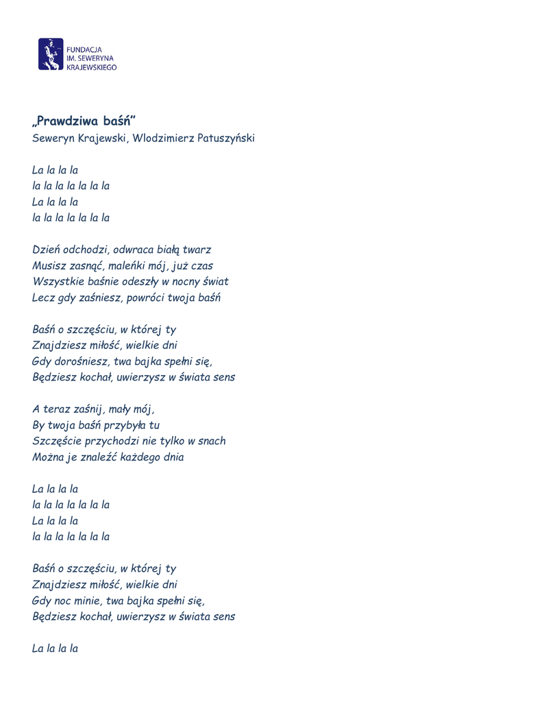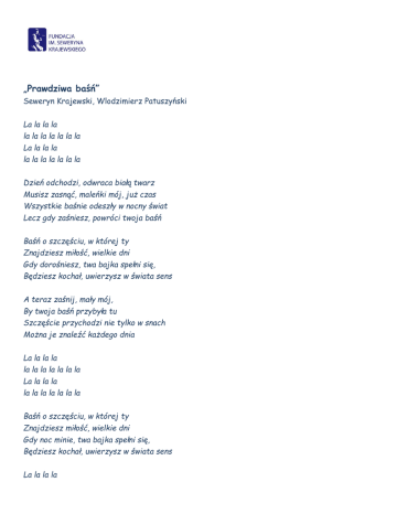 „Prawdziwa baśń” Seweryn Krajewski, Wlodzimierz Patuszyński La la la la la la la la la la la La la la la la la la la la la la Dzień odchodzi, odwraca białą twarz Musisz zasnąć, maleńki mój, już czas Wszystkie baśnie odeszły w nocny świat Lecz gdy zaśniesz, powróci twoja baśń Baśń o szczęściu, w której ty Znajdziesz miłość, wielkie dni Gdy dorośniesz, twa bajka spełni się, Będziesz kochał, uwierzysz w świata sens A teraz zaśnij, mały mój, By twoja baśń przybyła tu Szczęście przychodzi nie tylko w snach Można je znaleźć każdego dnia La la la la la la la la la la la La la la la la la la la la la la Baśń o szczęściu, w której ty Znajdziesz miłość, wielkie dni Gdy noc minie, twa bajka spełni się, Będziesz kochał, uwierzysz w świata sens La la la la la la la la la la la La la la la la la la la la la la