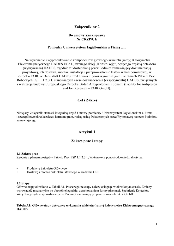 Załącznik nr 2 Do umowy Znak sprawy Nr CRZP/UJ/ Pomiędzy Uniwersytetem Jagiellońskim a Firmą ….. Na wykonanie i wyprodukowanie komponentów głównego szkieletu (ramy) Kalorymetru Elektromagnetycznego HADES ECAL, zwanego dalej „Konstrukcją”, będącego częścią detektora (wykrywacza) HADES, zgodnie z udostępnianą przez Podmiot zamawiający dokumentacją projektową, ich dostawa, montaż, instalacja i przeprowadzenie testów w hali pomiarowej, w ośrodku FAIR, w Darmstadt HADES ECAL wraz z poniższymi usługami, w ramach Pakietu Prac Roboczych PSP 1.1.2.3.1, stanowiących część doświadczenia (eksperymentu) HADES, związanych z realizacją budowy Europejskiego Ośrodka Badań Antyprotonami i Jonami (Facility for Antiproton and Ion Research – FAIR GmbH). Cel i Zakres Niniejszy Załącznik stanowi integralną część Umowy pomiędzy Uniwersytetem Jagiellońskim a Firmą….. i szczegółowo określa zakres, harmonogram, rodzaj usług świadczonych przez Wykonawcę na rzecz Podmiotu zamawiającego Artykuł 1 Zakres prac i etapy 1.1 Zakres prac Zgodnie z planem postępów Pakietu Prac PSP 1.1.2.3.1, Wykonawca ponosi odpowiedzialność za: • • Produkcję Szkieletu Głównego Dostawę i montaż Szkieletu Głównego w siedzibie GSI 1.2 Etapy Główne etapy określono w Tabeli A1. Poszczególne etapy należy osiągnąć w określonym czasie. Zmiany wprowadzić można tylko po obopólnej zgodzie, z zachowaniem formy pisemnej. Spełnienie Kryteriów Weryfikacji będzie sprawdzane przez Podmiot zamawiający i przedstawicieli FAIR GmbH. Tabela A1: Główne etapy dotyczące wykonania szkieletu (ramy) kalorymetru Elektromagnetycznego HADES 1 Numer etapu Etap Opis Kryterium Weryfikacji Data 1. Produkcja A1 Szkieletu Głównego - Zakup materiałów spełniających wymogi wynikające z dokumentacji projektowej wykonania konstrukcji szkieletu głównego Kalorymetru Elektromagnetycznego HADES ECAL oraz produkcja wszystkich sektorów konstrukcji szkieletu głównego Kalorymetru Elektromagnetycznego HADES ECAL i jego montaż w Polsce Przeprowadzenie kontroli 06/2017 konstrukcji (m.in. Test Odbioru Fabrycznego FAT) przez Podmiot zamawiający oraz reprezentantów FAIR GmbH. Pisemna akceptacja wykonania Konstrukcji 2. Instalacja w A2 docelowym miejscu przeznaczenia Transport i montaż w docelowym miejscu przeznaczenia Przeprowadzenie kontroli 07/2017 konstrukcji (m.in. Test Odbioru na miejscu) w docelowego miejsca przeznaczenia przez Podmiot zamawiający oraz reprezentantów FAIR GmbH 1.3 Harmonogram Data dostawy jest bezpośrednio związana z harmonogramami eksperymentu HADES oraz budowy Ośrodka Badań FAIR. W przypadku ich zmiany zatwierdzonej przez Podmiot zamawiający we współpracy z FAIR GmbH, zostanie dokonana ocena wpływu na harmonogram prac Wykonawcy i w razie konieczności, przy obopólnej zgodzie, zostaną wprowadzone niezbędne modyfikacje. Jeśli modyfikacje planu prac obejmują swym zasięgiem liczbę, typ lub datę zakończenia prac, wtedy takie modyfikacje wymagają sporządzenia aneksu do niniejszego Załącznika. W celu zagwarantowania odpowiedniej koordynacji procedur, podczas Fazy poprzedzającej konstrukcję Podmiot Zamawiający określi wspólnie z przedstawicielami FAIR GmbH szczegółowy i, w miarę możliwości, zaktualizowany harmonogram dostaw pozostałych elementów. Może to spowodować przesunięcie terminów dostaw w czasie. Artykuł 2 Struktura organizacyjna i zobowiązania W celu ułatwienia codziennych bezpośrednich kontaktów Wykonawca oraz Podmiot Zamawiający wyznaczą Kierowników projektu Każdy z nich zobowiązany jest odpowiadać na każde zapytanie kierowane przez Stronę Umowy z zachowaniem terminu trzech dni roboczych. Strony zastrzegają sobie prawo do zmiany wyżej wymienionych osób kontaktowych po uprzednim powiadomieniu pozostałych Stron, z zachowaniem formy pisemnej. 2.1 Zarządzanie Projektem przez Wykonawcę 2 2.1.1 Dostawa sprzętu produkowanego przez Wykonawcę jest koordynowana przez Kierownika Projektu: ……………………….. Email: ……………………….. Tel.: …………………... Kierownik Projektu z ramienia Wykonawcy ponosi odpowiedzialność za: • zapewnienie zgodności procesu produkcji szkieletu (ramy) Kalorymetru Elektromagnetycznego HADES ECAL ze specyfikacją techniczną oraz harmonogramem; • zapewnienie jakości i monitorowania zgodności wykonania przedmiotów dostawy z Planem Jakości; • regularne i terminowe przedkładanie raportów z postępów i napotkanych problemów; • transport i dostawę sprzętu na miejsce jego montażu (wszystkich części szkieletu (ramy) Kalorymetru Elektromagnetycznego HADES ECAL), zgodnie z harmonogramem określonym w Tabeli A1. • zapewnienie płynnej komunikacji pomiędzy Wykonawcą a Podmiotem zamawiającym i przedstawicielem FAIR GmbH; • koordynację pracy różnych działów w siedzibie Wykonawcy. 2.2 Zarządzanie Projektem przez Podmiot Zamawiający 2.2.1 Dostawa sprzętu produkowanego przez Wykonawcę jest monitorowany przez Kierownika Projektu Podmiotu Zamawiającego: Prof. Piotr Salabura Email: [email protected] Tel.: +48501716960 • terminowe przedkładanie niezbędnych specyfikacji; •dostarczanie Wykonawcy wszelkich niezbędnych informacji dotyczących zakresu jego zobowiązań wynikających z Umowy; • monitorowanie procesu produkcji w siedzibie Wykonawcy; • terminowe kontrole i zapewnianie wsparcia merytorycznego Wykonawcy; • sprawdzanie dostarczanej dokumentacji; • weryfikację osiągnięć w ramach poszczególnych etapów. Artykuł 3 Warunki realizacji dostaw 3.1 Ogólne cele Wykonawca jest odpowiedzialny za produkcję, proces kontroli jakości, przeprowadzenie testów i realizację dostawy szkieletu (ramy) Kalorymetru Elektromagnetycznego HADES ECAL do określonego miejsca dostawy w Niemczech, w tym wszystkich narzędzi niezbędnych do transportu, magazynowania i montażu na terenie Niemiec. Wykonawca ponosi odpowiedzialność za 