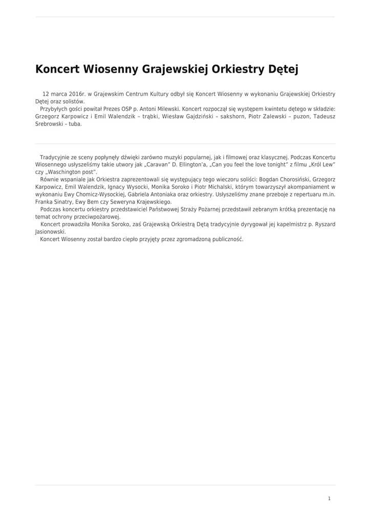 Koncert Wiosenny Grajewskiej Orkiestry Dętej 12 marca 2016r. w Grajewskim Centrum Kultury odbył się Koncert Wiosenny w wykonaniu Grajewskiej Orkiestry Dętej oraz solistów. Przybyłych gości powitał Prezes OSP p. Antoni Milewski. Koncert rozpoczął się występem kwintetu dętego w składzie: Grzegorz Karpowicz i Emil Walendzik – trąbki, Wiesław Gajdziński – sakshorn, Piotr Zalewski – puzon, Tadeusz Srebrowski – tuba. Tradycyjnie ze sceny popłynęły dźwięki zarówno muzyki popularnej, jak i filmowej oraz klasycznej. Podczas Koncertu Wiosennego usłyszeliśmy takie utwory jak „Caravan” D. Ellington’a, „Can you feel the love tonight” z filmu „Król Lew” czy „Waschington post”. Równie wspaniale jak Orkiestra zaprezentowali się występujący tego wieczoru soliści: Bogdan Chorosiński, Grzegorz Karpowicz, Emil Walendzik, Ignacy Wysocki, Monika Soroko i Piotr Michalski, którym towarzyszył akompaniament w wykonaniu Ewy Chomicz-Wysockiej, Gabriela Antoniaka oraz orkiestry. Usłyszeliśmy znane przeboje z repertuaru m.in. Franka Sinatry, Ewy Bem czy Seweryna Krajewskiego. Podczas koncertu orkiestry przedstawiciel Państwowej Straży Pożarnej przedstawił zebranym krótką prezentację na temat ochrony przeciwpożarowej. Koncert prowadziła Monika Soroko, zaś Grajewską Orkiestrą Dętą tradycyjnie dyrygował jej kapelmistrz p. Ryszard Jasionowski. Koncert Wiosenny został bardzo ciepło przyjęty przez zgromadzoną publiczność. 1