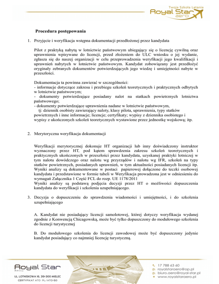 Procedura postępowania 1. Przyjęcie i weryfikacja wstępna dokumentacji przedłożonej przez kandydata Pilot z praktyką nabytą w lotnictwie państwowym ubiegający się o licencję cywilną oraz uprawnienia wpisywane do licencji, przed złożeniem do ULC wniosku o jej wydanie, zgłasza się do naszej organizacji w celu przeprowadzenia weryfikacji jego kwalifikacji i uprawnień nabytych w lotnictwie państwowym. Kandydat zobowiązany jest przedłożyć oryginały zebranych dokumentów potwierdzających jego wiedzę i umiejętności nabyte w przeszłości. Dokumentacja ta powinna zawierać w szczególności: - informacje dotyczące zakresu i przebiegu szkoleń teoretycznych i praktycznych odbytych w lotnictwie państwowym; - dokumenty potwierdzające posiadany nalot na statkach powietrznych lotnictwa państwowego; - dokumenty potwierdzające uprawnienia nadane w lotnictwie państwowym, tj: dziennik osobisty zawierający naloty, klasy pilota, uprawnienia, typy statków powietrznych i inne informacje; licencje; certyfikaty; wypisy z dziennika osobistego i wypisy z ukończonych szkoleń teoretycznych wystawione przez jednostkę wojskową; itp. 2. Merytoryczna weryfikacja dokumentacji Weryfikacji merytorycznej dokonuje HT organizacji lub inny doświadczony instruktor wyznaczony przez HT, pod kątem sprawdzenia zakresu szkoleń teoretycznych i praktycznych ukończonych w przeszłości przez kandydata, uzyskanej praktyki lotniczej w tym nalotu dowódczego oraz nalotu wg przyrządów i nalotu wg IFR, szkoleń na typy statków powietrznych, posiadanych uprawnień, w tym aktualności posiadanych licencji itp. Wyniki analizy są dokumentowane w postaci papierowej dołączone do teczki osobowej kandydata i przedstawione w formie tabeli w Weryfikacja prowadzona jest w odniesieniu do wymagań Załącznika 1 Część FCL do rozp. UE 1178/2011 Wyniki analizy są podstawą podjęcia decyzji przez HT o możliwości dopuszczenia kandydata do weryfikacji i szkolenia uzupełniającego. 3. Decyzja o dopuszczeniu do sprawdzenia wiadomości i umiejętności, i do szkolenia uzupełniającego A. Kandydat nie posiadający licencji samolotowej, której dotyczy weryfikacja wydanej zgodnie z Konwencją Chicagowską, może być tylko dopuszczony do modułowego szkolenia do licencji turystycznej B. Do modułowego szkolenia do licencji zawodowej może być dopuszczony jedynie kandydat posiadający co najmniej licencję turystyczną. HT kieruje kandydata do weryfikacji wiedzy teoretycznej z zakresu wnioskowanych przez niego licencji i uprawnień. Pilot posiadający zaliczone i ważne egzaminy w Lotniczej Komisji Egzaminacyjnej Urzędu Lotnictwa Cywilnego do licencji lub uprawnień możne być zwolniony od sprawdzenia wiedzy teoretycznej w tym zakresie. Szkolenie modułowe 1. Weryfikacja wiedzy teoretycznej Weryfikację wiedzy teoretycznej przeprowadza się pod kątem spełnienia przez kandydata wymagań Zał. 1 Część FCL do rozp. UE 1178/2011 w zakresie właściwym dla kategorii licencji, i uprawnień do szkolenia na które dopuszczony został kandydat. Na polecenie HT przeprowadza testy weryfikacyjne wiedzy teoretycznej z wszystkich przedmiotów wiedzy teoretycznej właściwych dla kategorii licencji i uprawnień do szkolenia na które dopuszczony został kandydat. Warunkiem zaliczenia testu z przedmiotu przez kandydata jest uzyskanie co najmniej 75 % pozytywnych odpowiedzi. Pozytywne zaliczenie testu zwalnia kandydata z konieczności uczestnictwa w szkoleniu teoretycznym z danego przedmiotu. W przypadku zaliczenia wszystkich przedmiotów wymaganych dla danej licencji lub uprawnienia wystawiane jest zaświadczenie. W przypadku niezaliczenia testu, CTKI w porozumieniu z HT określa zakres niezbędnego szkolenia w celu uzupełnienia wiedzy przez kandydata w danym przedmiocie. 2. Opracowanie i zatwierdzenie IPS na szkolenie teoretyczne Na podstawie wyników weryfikacji wiedzy teoretycznej i obowiązującej Instrukcji Szkolenia / Programu, CTKI opracowuje IPS, który następnie zatwierdza HT organizacji. IPS stanowi podsumowanie merytorycznej analizy dokumentacji w zakresie odbytych szkoleń teoretycznych oraz weryfikacji i zawiera program szkoleń z przedmiotów, z których kandydat nie zaliczył testu weryfikacyjnego. 3. Szkolenie teoretyczne według IPS Kandydat zobowiązany jest do uczestnictwa w szkoleniu teoretycznym zgodnie z Instrukcją Szkolenia ATO oraz z zatwierdzonym przez HT Indywidualnym Programem Szkolenia. Zgodnie z Instrukcją Szkolenia po zakończeniu szkolenia przeprowadzana jest wewnętrzna kontrola wyników nauczania w przedmiotach objętych IPS-em. Po uzyskaniu pozytywnego wyniku z kontroli możliwe jest wystawienie zaświadczenia o zakończeniu szkolenia teoretycznego. 4. Wydanie zaświadczenia W przypadku zwolnienia ze szkoleń teoretycznych po pozytywnym zaliczeniu wszystkich testów weryfikacyjnych lub po pozytywnie zakończonym etapie szkoleń teoretycznych, HT wystawia Zaświadczenie o ukończeniu szkolenia teoretycznego, które stanowi podstawę dopuszczenia kandydata do egzaminów teoretycznych w ULC, w przypadku gdy do uzyskania licencji lub uprawnienia taki egzamin jest wymagany. Kandydat po otrzymaniu zaświadczenia może przystąpić do egzaminów w ULC po złożeniu wniosku wraz z wymaganymi dokumentami na zasadach obowiązujących wszystkich przystępujących do egzaminów. 5. Weryfikacja umiejętności praktycznych Weryfikację umiejętności praktycznych można przeprowadzić bezpośrednio po weryfikacji wiadomości teoretycznych, w trakcie uzupełniającego szkolenia teoretycznego lub po jego zakończeniu – decyzję podejmuje HT Weryfikację umiejętności praktycznych przeprowadza się pod kątem spełnienia wymagań Zał. 1 Część FCL do rozp. UE 1178/2011 w zakresie właściwym dla kategorii licencji i uprawnień do szkolenia na które dopuszczony został kandydat. W zależności od wyników merytorycznej analizy dokumentacji w zakresie: szkoleń praktycznych, typów statk
