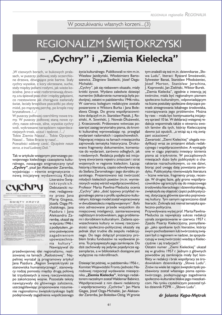 REGIONALIA regionalia REGIONALIA W poszukiwaniu własnych korzeni...(3) REGIONALIZM ŚWIĘTOKRZYSKI – „Cychry” i „Ziemia Kielecka” „W cisowych borach, w bukowych pralasach, w puszczy jodłowej stały oczerchlone drzewa, dźwigające pnie bartne. Stały cychry wysokie, z kory okrzesane, suche, stały między jedlami rosłymi, jak wieże kościelne. Jeno z wież rozbrzmiewają dzwony, a tu śpiewał ptasi chór i między gałęziami, co rozstawione jak chorągwie zasłaniały świat, leciały brzękliwe pszczółki po złoty miód, po mączystą perchę, po krople rosy kryształowe. /.../ W puszczy jodłowej czerchlimy nowe tramy. W puszczy jodłowej staną nowe cychry, nasze zdrowe, silne, wysokie cychry woli, wykrzesane narzędziem najserdeczniejszych trosk, uczuć i tęsknot. /.../ Tobie Ziemio Nasza!... Tobie Ojczyzno Nasza!... Tobie Bracie ty nasz!... Przeszłości oddamy cześć, Ojczyźnie nasze serca, a trud Ludowej Doli.” Tak w artykule wstępnym pierwszego powojennego kieleckiego czasopisma kulturalnego, noszącego enigmatyczny tytuł „Cychry”, pisał Jan Aleksander Zaremba, wyjaśniając – równie enigmatycznie – nową inicjatywę wydawniczą Klubu Literatów Świętokrzyskich. Debiutancki numer, redagowany przez Jana Marię Gisgesa, Józefa Ozgę-Michalskiego, Jana Pazdura i Jana Aleksandra Zarembę, ukazał się w styczniu 1946 r. z podtytułem „pismo poświęcone zagadnieniom upowszechniania kultury ”. Nawiązywał do przedwojennej idei regionalizmu, realizowanej na łamach „Radostowej”. Najpełniej wyrażał ją programowy artykuł Jana Pazdura „Region Świętokrzyski ze stanowiska humanistycznego”, stanowiący rodzaj pomostu między drugą połową lat trzydziestych a nową rzeczywistością po zakończonej wojnie. Pozostałe teksty nawiązywały do głównego założenia, uszczegóławiając proponowane rozumienie regionalizmu świętokrzyskiego bądź podejmowały zagadnienia współczesnego życia kulturalnego. Publikowali w nim m.in. Wiesław Jażdżyński, Włodzimierz Bartoszewicz, Zbigniew Siedlecki, Józef OzgaMichalski. „Cychry”, jak się niebawem okazało, miały krótki żywot. Wydano zaledwie dziesięć numerów (kilkakrotnie numeracja była podwójna), ostatni w październiku 1946 roku. W czerwcu kolegium redakcyjne zostało poszerzone o Wiktora Burka i Jana Bolesława Ożoga. Do grona współpracowników dołączyli m.in. Stanisław Piętak, J. Rosiński, A. Sowiński, J. Nowak-Dłużewski, J. Krzeczowski. Próbowano wówczas poszerzyć zasięg terytorialny pisma, do kroniki kulturalnej wprowadzając np. przegląd wydarzeń radomskich i częstochowskich. Najwięcej miejsca na łamach miesięcznika zajmowała tematyka historyczna. Drukowano fragmenty dokumentów, komentarze do wydarzeń, zarówno odległych, jak i niedawnych. Redakcja podjęła też inicjatywę stworzenia rejestru zniszczeń i strat wojennych w regionie kieleckim. Łącząc historię z literaturą, często odwoływano się do Stefana Żeromskiego i jego dorobku pisarskiego. Prezentowano też twórczość młodych kieleckich poetów (m.in. wymienionych wyżej wśród współpracowników). Profesor Marta Pawlina-Meducka ocenia „Cychry” jako „dość typowy przykład regionalnego pisma o profilu społeczno-kulturalnym, którego model został wypracowany w dwudziestoleciu międzywojennym”. Było ono adresowane przede wszystkim do miejscowej inteligencji, zainteresowanej najbliższym środowiskiem, jego problemami i dorobkiem kulturalnym. Zadania upowszechniania kultury w nowej rzeczywistości społeczno-politycznej okazały się jednak zbyt trudne dla zespołu redakcyjnego. Do tego dołączył prozaiczny problem braku funduszów na wydawanie pisma. To przyspieszyło jego zamknięcie. Do dziś zachowały się jedynie pojedyncze egzemplarze, a w bibliotekach dostępne jest wyłącznie na mikrofilmach. Dziesięć lat później, w październiku 1956 r., Komitet Wojewódzki Frontu Jedności Narodowej rozpoczął wydawanie miesięcznika „Ziemia Kielecka”, którego redaktorem naczelnym został Waldemar Babinicz. Współpracowali z nim dawni redaktorzy i współpracownicy „Cychrów”: Jan Maria Gisges, Józef Ozga-Michalski, Jan Aleksander Zaremba, Jan Bolesław Ożóg. W gronie 61 tym znaleźli się też m.in. dziennikarze „Słowa Ludu”, literaci: Ryszard Smożewski, Sylwester Banaś, Stanisław Młodożeniec, Józef Morton, Stanisław Jerschina, J. Koprowski, Jan Zieliński, Wiktor Burek. „Ziemia Kielecka”, zgodnie z intencją jej twórców, miała być regionalnym pismem społeczno-kulturalnym, odpowiadającym na liczne postulaty społeczne dotyczące potrzeb zintegrowania lokalnego środowiska, rozwiązywania jego problemów. Można by rzec – miała być kontynuatorką inicjatywy sprzed 10 lat. W deklaracji wstępnej redakcja wspominała także o otwarciu swoich łamów dla tych, którzy Kielecczyznę dawno już opuścili, „a wciąż są z nią związani uczuciowo”. Zawartość „Ziemi Kieleckiej” ulegała modyfikacji wraz ze zmianami składu redakcyjnego i współpracowników. A wystąpiły one w ciągu piętnastu miesięcy istnienia pisma aż trzykrotnie. W początkowych miesiącach dużo było publicystyki o charakterze rozrachunkowym, co nie dziwi, biorąc pod uwagę datę powstania periodyku. Publicystykę równoważyła literatura – liczne wiersze, fragmenty prozy, recenzje. W drugiej fazie, gdy grono współpracowników ograniczyło się do miejscowego środowiska literackiego i dziennikarskiego, zwiększyła się objętość części publicystycznej, dotyczącej głównie szeroko pojmowanej kultury. Tym samym ograniczono dział literacki. Zniknęła też niemal tematyka społeczno-polityczna. Przywoływana wyżej prof. Marta PawlinaMeducka za największy sukces redakcji uznała zorganizowanie w czerwcu 1957 r. Zjazdu Pisarzy Kielecczyzny, pomyślanego „jako spotkanie tych literatów, którzy swym pochodzeniem lub twórczo