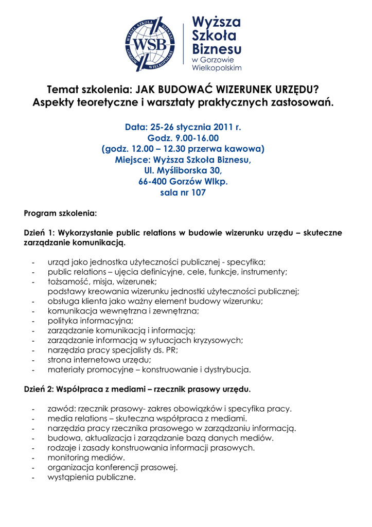 Temat szkolenia: JAK BUDOWAĆ WIZERUNEK URZĘDU? Aspekty teoretyczne i warsztaty praktycznych zastosowań. Data: 25-26 stycznia 2011 r. Godz. 9.00-16.00 (godz. 12.00 – 12.30 przerwa kawowa) Miejsce: Wyższa Szkoła Biznesu, Ul. Myśliborska 30, 66-400 Gorzów Wlkp. sala nr 107 Program szkolenia: Dzień 1: Wykorzystanie public relations w budowie wizerunku urzędu – skuteczne zarządzanie komunikacją. - urząd jako jednostka użyteczności publicznej - specyfika; public relations – ujęcia definicyjne, cele, funkcje, instrumenty; tożsamość, misja, wizerunek; podstawy kreowania wizerunku jednostki użyteczności publicznej; obsługa klienta jako ważny element budowy wizerunku; komunikacja wewnętrzna i zewnętrzna; polityka informacyjna; zarządzanie komunikacją i informacją; zarządzanie informacją w sytuacjach kryzysowych; narzędzia pracy specjalisty ds. PR; strona internetowa urzędu; materiały promocyjne – konstruowanie i dystrybucja. Dzień 2: Współpraca z mediami – rzecznik prasowy urzędu. - zawód: rzecznik prasowy- zakres obowiązków i specyfika pracy. media relations – skuteczna współpraca z mediami. narzędzia pracy rzecznika prasowego w zarządzaniu informacją. budowa, aktualizacja i zarządzanie bazą danych mediów. rodzaje i zasady konstruowania informacji prasowych. monitoring mediów. organizacja konferencji prasowej. wystąpienia publiczne. - wypowiedzi dla mediów przy uwzględnieniu ich specyfiki (radio, prasa, telewizja, portale internetowe) – teoria i praktyka; prawo prasowe i etyka w pracy rzecznika prasowego. Adresaci szkolenia: Pracownicy jednostek samorządu terytorialnego: urzędów miasta i gminy, starostw powiatowych, urzędów wojewódzkich i marszałkowskich, w szczególności osoby odpowiedzialne za promocję, public relations, komunikację, kontakty z mediami, wizerunek organizacji, rzecznicy prasowi, a także pracownicy organizacji typu non – profit. Szkolenie adresowane jest do osób, które chcą poszerzyć swą wiedzę i usprawnić umiejętności w zakresie budowania relacji z mediami, zarządzania informacją i komunikacją przy wykorzystaniu narzędzi z zakresu public relations. Cel szkolenia: Celem szkolenia jest usprawnienie i udoskonalenie warsztatu specjalisty ds. PR oraz rzecznika prasowego oraz wyposażenie jego uczestników w aktualną wiedzę teoretyczną i praktyczną niezbędną w pracy na stanowiskach odpowiedzialnych za wizerunek, kontakty z mediami i kierowanie komunikacją zewnętrzną i wewnętrzną urzędu/organizacji pożytku publicznego Uczestnicy szkolenia nabędą wiedzę z zakresu narzędzi wykorzystywanych w pracy specjalisty ds. PR i rzecznika prasowego, prawa prasowego oraz specyfiki współczesnych mediów. Jednocześnie przećwiczą w praktyce konstruowanie informacji prasowych różnego typu oraz organizowanie konferencji prasowych. Ponadto zostaną wyposażeni w praktyczny poradnik skutecznego i profesjonalnego wypowiadania się w mediach różnego typu. Szkolenie dostarczy też wiedzy z zakresu wystąpień publicznych i komunikacji werbalnej i niewerbalnej. Prowadząca: Ewa Pawlak, politolog, absolwentka Uniwersytetu im. A. Mickiewicza w Poznaniu, nauczyciel akademicki i trener, specjalizuje się w public relations, doktorantka w zakresie nauk ekonomicznych (specjalizacja: marketing i public relations), członek Stowarzyszenia Public Relations i Promocji Uczelni Polskich „PRom”; doświadczenie praktyczne na stanowisku rzecznika prasowego, koordynatora ds. PR i kanclerza szkoły wyższej. Cena: 750,00 brutto Zgłoszenia przyjmowane są do 18.01.2011 r. pod numerem tel. 95 733 66 68 lub na adres e-mail: [email protected]