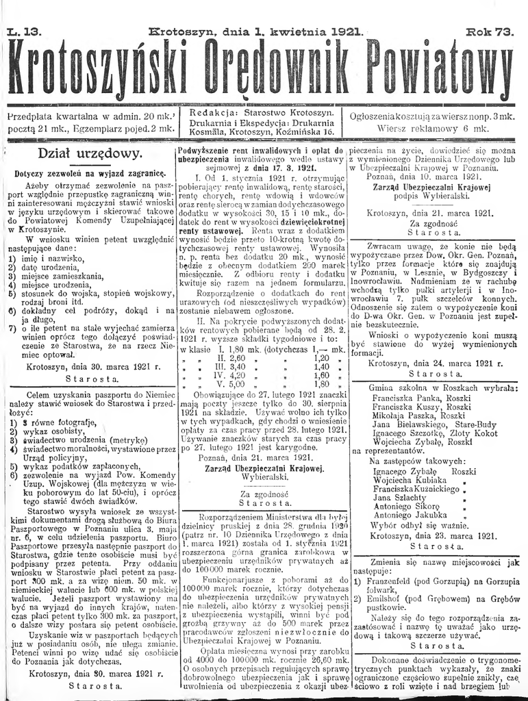 Xj. 13. Krotoszyn, dnia 1. kwietnia 1921. Przedpłata kwartalna w admin. 20 mk.’ pocztą 21 mk., Egzemplarz pojed.2 mk. R e d a k c j a : Starostw o Krotoszyn. Drukarnia i Eksped ycja : Drukarnia Kosmala, Krotoszyn, Koźm ińska 16. BłgfflgSŁ-.-.gMrri Kok 73. Ogłoszeniakosztująza wiersz nonp. 3mk. Wiersz reklamowy 6 mk. Podwyższenie rent inwalidowych i opłat do pieczenia na życie, dowiedzieć się można ubezpieczenia inwalidowego wedle ustawy z wymienionego Dziennika Urzędowego lub sejmowej z dnia 17. 3. 1921. w Ubezpieczalni Krajowej w Poznaniu. Dotyczy zezwoleń na wyjazd zagranicą. Poznań, dnia 10. marca 1921. I. Od 1. stycznia 1921 r. otrzymując Ażeby otrzymać zezwolenie na pasz pobierający rentę inwalidową, rentę starości, Zarząd Ubezpieczalni Krajowej port względnie przepustkę zagraniczną win rentę chorych, rentę wdowią i wdowców podpis Wybieralski. ni zainteresowani mężczyźni stawić wnioski oraz rentę sierocą w zamian dodychczasowego w języku urzędowym i skierować takowe dodatku w w ysokości 30, 15 i 10 mk., do Krotoszyn, dnia 21. marca 1921. do Powiatowej Komendy Uzupełniającej datek do rent w w ysokości dziewięciokrotnej Za zgodność w Krotoszynie. renty ustawowej. Renta wraz z dodatkiem Starosta. W wniosku winien petent uwzględnić wynosić będzie przeto 10-krotną kwotę do Zwracam uwagę, że konie nie będą tychczasowej renty ustawowej. Wynosiła następujące dane: n. p. renta bez dodatku 20 mk., wynosić wypożyczane przez Dow. Okr. Gen. Poznań, 1) imię i nazwisko, będzie z obecnym dodatkiem 200 marek tylko przez formacje które się znajdują 2) datę urodzenia, miesięcznie. Z odbioru renty i dodatku w Poznaniu, w Lesznie, w B ydgoszczy i 3) miejsce zamieszkania, kwituje się razem na jednem formularzu. Inowrocławiu. Nadmieniam że w rachubę 4) miejsce urodzenia, 5) stosunek do wojska, stopień w ojskow y, Rozporządzenie o dodatkach do rent wchodzą tylko pułki artyłerji i w Ino rodzaj broni itd. urazowych (od nieszczęśliwych wypadków) wrocławiu 7. pułk szczelców konnych. Odnoszenie się zatem o wypożyczenie koni 6) dokładny cel podróży, dokąd i na zostanie niebawem ogłoszone. do D-wa Okr. Gen. w Poznaniu jest zupeł ja długo, II. Na pokrycie podwyższonych dodat nie bezskutecznie. 7) o ile petent na stałe w yjechać zamierza ków rentowych pobierane będą od 28. 2. Wnioski o wypożyczenie koni muszą winien oprócz tego dołączyć poświad 1921 r. wyższe składki tygodniowe i to: b yć stawione do wyżej wymienionych czenie ze Starostwa, że na rzecz Nie w klasie I. 1,80 mk. (dotychczas 1,— mk. formacji. miec optował. „ » II. 2,60 , ' , 1,20 , Krotoszyn, dnia 24. marca 1921 r. „ . III. 3,40 . „ 1,40 , Krotoszyn, dnia 30. marca 1921 r. Starosta. „ „ IV. 4,20 „ 1,60 Starosta.6 5 4 3 2 1 * „ „ V. 5,00 „ 1,80 Gmina szkolna w Roszkach w ybrała: Obowiązujące do 27. lutego 1921 znaczki Celem uzyskania paszportu do Niemiec Franciszka Panka, Roszki należy stawić wniosek do Starostwa i przed mają poczty jeszcze tylko do 30. sierpnia Franciszka Kuszy, Roszki łoży ć: 1921 na składzie. Używać wolno ich tylko Mikołaja Paszka, Roszki w tych wypadkach, gdy chodzi o wniesienie 1) 8 równe fotografje, Jana Bielawskiego, Stare-Budy opłaty za czas pracy przed 28. lutego 1921. 2) wykaz osobisty, Ignacego Szczotkę, Zloty Kokot Używanie znaczków starych za czas pracy 3) świadectwo urodzenia (metrykę) Wojciecha Zybałę, Roszki 4) świadectwo moralności, wystawione przez po 27. lutego 1921 jest karygodne. na reprezentantów. Urząd policyjny, Poznań, dnia 21. marca 1921, Na zastępców takow ych: 5) wykaz podatków zapłaconych, Zarząd Ubezpieczalni Krajowej. Ignacego Zybałę Roszki 6) zezwolenie na wyjazd Pow. Komendy Wybieralski. W ojciecha Kubiaka , . Uzup. W ojskowej (dla mężczyzn w wie FranciszkaKuźnickiego , ku poborow ym do lat 50-ciu), i oprócz Za zgodność Jana Szlachty „ tego stawić dwóch świadków. Starosta.1 * Antoniego Sikorę „ Starostwo w ysyła wniosek ze wszyst Antoniego Jakubka „ Rozporządzeniem Ministerstwa dla byłej kimi dokumentami drogą służbową do Biura W ybór odbył się ważnie. Paszportowego w Poznaniu ulica 3. maja dzielnicy pruskiej z dnia 28. grudnia 1920 Krotoszyn, dnia 23. marca 1921. nr. 6, w celu udzielenia paszportu. Biuro (patrz nr. 10 Dziennika Urzędowego z dnia Paszportowe przesyła następnie paszport do 1. marca 1921) została od 1. stycznia 1921 S t a r o s t : a. Starostwa, gdzie tenże osobiście musi być rozszerzona górna granica zarobkowa w Zmienia się nazwę miejscowości jak podpisany przez petenta. Przy oddaniu ubezpieczeniu urzędników prywatnych aż następuje: wniosku w Starostwie płaci petent za pasz do 100000 marek rocznie. Funkcjonarjusze z poborami aż do 1) Franzenfeld (pod Gorzupią) na Gorzupia port 300 mk. a za wizę niem. 50 mk. w niemieckiej walucie lub 600 mk. w polskiej 100000 marek rocznie, którzy dotychczas folwark, walucie. Jeżeli paszport wystawiony ma do uhezpieczenia urzędników prywatnych 2) Emilshof (pod Grębowem) na Grębów b yć na wyjazd do innych krajów, naten nie należeli, albo którzy z w ysokiej pensji pustkowie. czas płaci petent tylko 300 mk. za paszport, z ubezpieczenia wystąpili, winni b yć pod Należy się do tego rozporządzenia zagroźbą grzyw ny aż do 500 marek przez o dalsze w izy postara się petent osobiście. zastósować i nazwę tę uważać jako urzę pracodawców zgłoszeni n ie z w ł o c z n i e , do Uzyskanie wiz w paszportach będących dową i takową szczerze używać. ; już w posiadaniu osób, nie ulega zmianie. Ubezpieczalni Krajowej w Poznaniu. Starosta. Opłata miesięczna wynosi przy zarobku Petenci winni po wizę udać się osobiście od 4000 do 100Ó00 mk. rocznie 26,60 mk. Dokonane doświadczenie o trygonome do Poznania jak dotychczas. O osobnych przepisach regulujących sprawę trycznych punktach w ykazały, że znaki Krotoszyn, dnia
