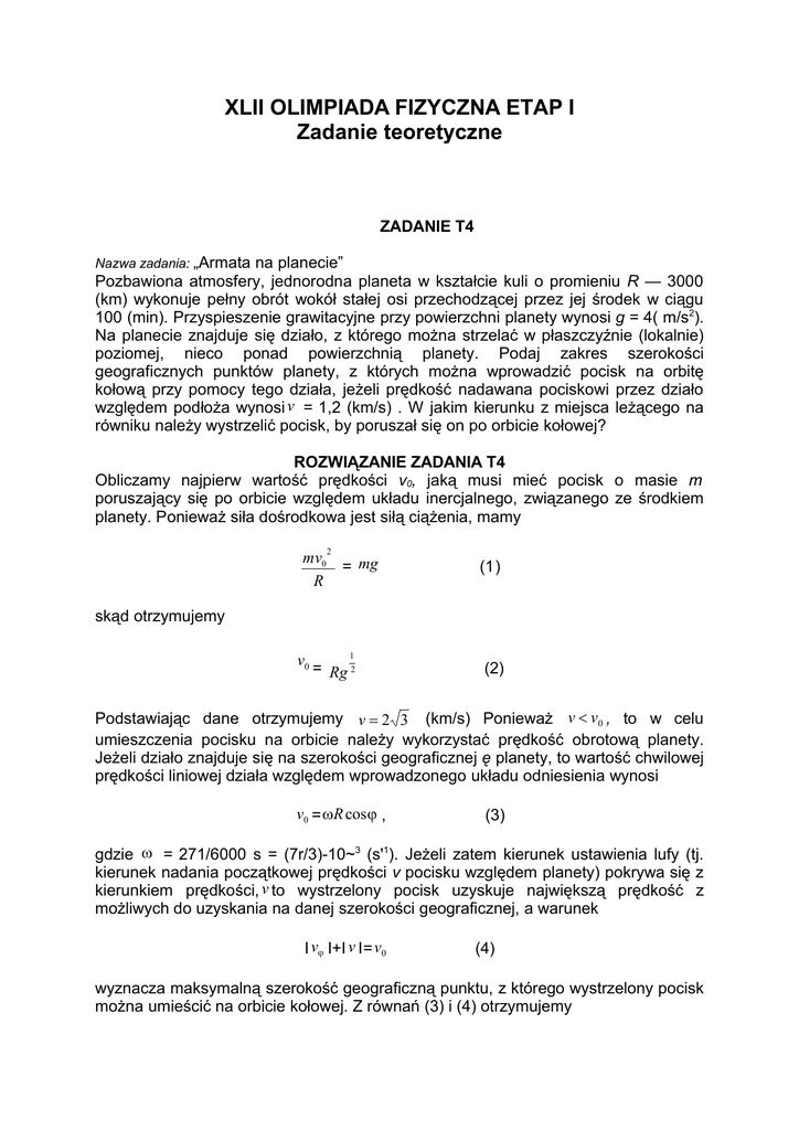 XLII OLIMPIADA FIZYCZNA ETAP I Zadanie teoretyczne ZADANIE T4 Nazwa zadania: „Armata na planecie” Pozbawiona atmosfery, jednorodna planeta w kształcie kuli o promieniu R — 3000 (km) wykonuje pełny obrót wokół stałej osi przechodzącej przez jej środek w ciągu 100 (min). Przyspieszenie grawitacyjne przy powierzchni planety wynosi g = 4( m/s2). Na planecie znajduje się działo, z którego można strzelać w płaszczyźnie (lokalnie) poziomej, nieco ponad powierzchnią planety. Podaj zakres szerokości geograficznych punktów planety, z których można wprowadzić pocisk na orbitę kołową przy pomocy tego działa, jeżeli prędkość nadawana pociskowi przez działo względem podłoża wynosi v = 1,2 (km/s) . W jakim kierunku z miejsca leżącego na równiku należy wystrzelić pocisk, by poruszał się on po orbicie kołowej? ROZWIĄZANIE ZADANIA T4 Obliczamy najpierw wartość prędkości v0, jaką musi mieć pocisk o masie m poruszający się po orbicie względem układu inercjalnego, związanego ze środkiem planety. Ponieważ siła dośrodkowa jest siłą ciążenia, mamy 2 mv0 = mg R (1) skąd otrzymujemy v0 = Rg 1 2 (2) Podstawiając dane otrzymujemy v = 2 3 (km/s) Ponieważ v < v0 , to w celu umieszczenia pocisku na orbicie należy wykorzystać prędkość obrotową planety. Jeżeli działo znajduje się na szerokości geograficznej ę planety, to wartość chwilowej prędkości liniowej działa względem wprowadzonego układu odniesienia wynosi v0 = ωR cos ϕ , (3) gdzie ω = 271/6000 s = (7r/3)-10~3 (s'1). Jeżeli zatem kierunek ustawienia lufy (tj. kierunek nadania początkowej prędkości v pocisku względem planety) pokrywa się z kierunkiem prędkości, v to wystrzelony pocisk uzyskuje największą prędkość z możliwych do uzyskania na danej szerokości geograficznej, a warunek І vϕ І+І v І= v0 (4) wyznacza maksymalną szerokość geograficzną punktu, z którego wystrzelony pocisk można umieścić na orbicie kołowej. Z równań (3) i (4) otrzymujemy cos ϕ = v0 - v 2 3 −1,2 = ≈ 0,72, ωR π (5) skąd wyznaczamy ϕ max ≈ 43,9°. (6) Aby pocisk wystrzelony z, punktu leżącego na równiku został umieszczony na orbicie kołowej, lufa armaty musi być skierowana pod takim kątem do kierunku chwilowej prędkości działa v φ=max stycznej do równika, by zachodziła równość ı vϕ = v0 + v ı = v0 (7) Kąt a jaki tworzą wektory vϕ =0( vϕ =0 = ωR ) i v wyznaczamy korzystając z twierdzenia kosinusów 2 2 cos α = v0 − v − (ωR) 2vωR 2 12 − 1,44 − π 2 = ≈ 0,09156, 2 ⋅1, 2 ⋅ π (8) co odpowiada wartości kąta równej α ≈ 84,7° Punktacja: Wzór (2) Wzór (3) Wzór (4) Wzory (5—6) łącznie Wzór(7) Wzory (8—9) łącznie (9) do 1pktu. do1pktu. do 3 pktów. do 1 pktu. do 3 pktów. do 1 pktu. Źródło: Zadanie pochodzi z „Druk OF” Komitet Okręgowy Olimpiady Fizycznej w Szczecinie www.of.szc.pl