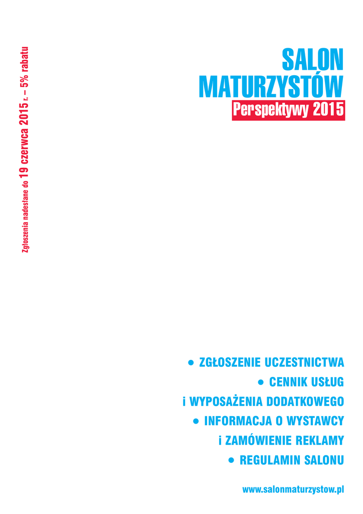 czerwca 2015 r. – 5% rabatu SALON MATURZYSTÓW Zgłoszenia nadesłane do 19 Perspektywy 2015 ZGŁOSZENIE UCZESTNICTWA CENNIK USŁUG i WYPOSAŻENIA DODATKOWEGO INFORMACJA O WYSTAWCY i ZAMÓWIENIE REKLAMY REGULAMIN SALONU www.salonmaturzystow.pl SALON MATURZYSTÓW Perspektywy 2015 pieczątka Uczelni ZGŁOSZENIE UCZESTNICTWA Nazwa Uczelni: Adres: Telefon: Fax: www: Osoba do kontaktu: Telefon: E-mail: Telefon kom.: Dane do faktury: NIP: Zamawiamy Nazwa Salonu Maturzystów stoisko powierzchnię* ceny (netto) 4 m2 6 m2 8 m2 12 m2 16 m2 Szczeciński, Szczecin, USz, 7-8 września 3100 zł 4600 zł 5100 zł 6400 zł 6900 zł . . . . . . m2 ............. Krakowski, Kraków, UJ, 9-10 września 3400 zł 4900 zł 6100 zł 8000 zł 9200 zł . . . . . . m2 ............. Warszawski, Warszawa, PW, 10-11 września 3400 zł** 4900 zł** 6100 zł** 8000 zł** 9200 zł** . . . . . . m2 ** ............. Białostocki, Białystok, UwB, 14-15 września 2600 zł 3400 zł 3700 zł 4300 zł 4700 zł . . . . . . m2 ............ Kujawsko-Pomorski, UTP, 14-15 września 3100 zł 4600 zł 5100 zł 6400 zł 6900 zł . . . . . . m2 ............. Lubelski, Lublin, UP, 15-16 września 3100 zł 4600 zł 5100 zł 6400 zł 6900 zł . . . . . . m2 ............. Olsztyński, Olsztyn, UWM, 16 września 2600 zł 3400 zł 3700 zł 4300 zł 4700 zł . . . . . . m2 ............. Poznański, Poznań, PP, 21-22 września 3400 zł 4900 zł 6100 zł 8000 zł 9200 zł . . . . . .m2 ............. Rzeszowski, Rzeszów, PRz, 21-22 września 3100 zł 4600 zł 5100 zł 6400 zł 6900 zł . . . . . . m2 ............. Kielecki, Kielce, PŚw., 22 września 2600 zł 3400 zł 3700 zł 4300 zł 4700 zł . . . . . . m2 ............. 6900 zł ...... m2 ............. ...... m2 ............. ...... m2 ............. m2 ............. Śląski, Gliwice, PŚl., 23 września Śląski, Katowice, UŚl., 24 września Gdański, Gdańsk, UG, 24-25 września 3100 zł 3100 zł 3100 zł 4600 zł 5100 zł 4600 zł 5100 zł 4600 zł 5100 zł 6400 zł 6400 zł 6400 zł 6900 zł 6900 zł Opolski, Opole, PO, 25 września 2600 zł 3400 zł 3700 zł 4300 zł 4700 zł ...... Łódzki, Łódź, PŁ, 28-29 września Wrocławski, Wrocław, PWr, 28-29 września 3100 zł 4600 zł 5100 zł 6400 zł 6900 zł . . . . . . m2 ............. 3400 zł 4900 zł 6100 zł 8000 zł 9200 zł . . . . . . m2 ............. * Należy wykupić min. 4 m2 powierzchni niezabudowanej, cena powierzchni = kwota stoiska minus 70 zł netto za każdy 1 m2. ** Dopłata 25% od podanej ceny za lokalizację stoiska w strefie Premium Obowiązkowy wpis do katalogu i e-katalogu (300 zł netto) W cenie powierzchni jest zawarte 1 gniazdko elektryczne. .............. 300 zł x ................ (liczba zamówionych stoisk) Uwaga! Przy uczestnictwie w dwóch salonach — 5% rabatu, trzech i czterech — 10% rabatu, pięciu i więcej — 15% Zgłoszenie nadesłane do 19 czerwca 2015 r. — 5% rabatu RAZEM: ............. Oświadczam, że należność w kwocie . . . . . . . . . . . . . . . . . . . . . zł + VAT, słownie złotych . . . . . . . . . . . . . . . . . . . . . . . . . . . . . . . . . . . . . . . . . . . . . . . . . . . . . . . . . . . . . . . . . . . . . . . . . . . . . . . . . . . . . . . . . . . . . . . . . . . . . . . . . . . . . . . . . . . . . . . . . . . . . . . . . . . . . . . . . . . . . . . . . . . . . . . . . . . . . . . . . . . . . . . . . . . . . . . ureguluję przelewem (na konto: Perspektywy Press — Bank PEKAO SA Oddział w Warszawie 68 1240 6218 1111 0000 4622 3881) w ciągu 7 dni od daty otrzymania faktury. Oświadczam, że jestem płatnikiem VAT, nr NIP . . . . . . . . . . . . . . . . . . . . . . . . i upoważniam Perspektywy Press Sp. z o.o. do wystawienia faktury VAT z 7-dniowym terminem płatności, bez mojego podpisu. Podpisanie i przesłanie zgłoszenia uczestnictwa jest równoznaczne z zawarciem umowy oraz akceptacją Regulaminu Salonu Maturzystów PERSPEKTYWY 2015. Prosimy od uważne zapoznanie się z tym regulaminem (w rozdz. II dodano pkt. 4). .................................................... data, miejscowość ................................................. pieczęć i podpis zlecającego Ostateczny termin nadsyłania zgłoszeń: do 31 lipca 2015 r., fax 22 629 16 17 Dodatkowe informacje: Anna Szkutnik — [email protected]; tel. 22 628 58 62, Bożena Kieruzalska ([email protected]), Magdalena Chróstna-Puchta ([email protected]), Andrzej Fornal ([email protected]), Edyta Tarnowska-Piotrowska ([email protected]), tel. 22 621 75 26, [email protected] Dokumenty do pobrania na stronie — www.salonmaturzystow.pl SALON MATURZYSTÓW Perspektywy 2015 pieczątka Uczelni WYPOSAŻENIE I USŁUGI DODATKOWE Wyposażenie stoiska standardowego obejmuje: 4 m2 (2m x 2m): lada informacyjna, 1 krzesło, napis na fryzie, 1 punkt świetlny, 1 gniazdko elektryczne, kosz na śmieci 6 m2 (2m x 3m): lada informacyjna, stół, 2 krzesła, 1 półka ścienna, napis na fryzie, 1 punkt świetlny, 1 gniazdko elektryczne, kosz na śmieci 8 m2 (2m x 4m): lada informacyjna, stół, 2 krzesła, 2 półki ścienne, napis na fryzie, 2 punkty świetlne, 1 gniazdko elektryczne, kosz na śmieci 12 m2 (3m x 4m): lada informacyjna, stół, 2 krzesła, 3 półki ścienne, napis na fryzie, 3 punkty świetlne, 2 gniazdka elektryczne, kosz na śmieci 16 m2 (4m x 4m): lada informacyjna, stół, 3 krzesła, 4 półki ścienne, napis na fryzie, 4 punkty świetlne, 2 gniazdka elektryczne, kosz na śmieci Zamawiam wyposażenie/usługi dodatkowe podczas Salonu Maturzystów w: .......................................................................... (Uwaga: jeśli Wystawca zamawia wyposażenie/usługi dodatkowe na 2 lub więcej Salonów – prosimy o wypełnienie oddzielnych zamówień dla każdego Salonu) WYPOSAŻENIE DODATKOWE 1. półka prosta (100 cm x 25 cm x 1,5 cm) 2. gablota na prospekty/stojak na ulotki Cena jednostkowa Kwota 55 zł 200/160 zł 3. stół (średnica 70 cm) 80 zł 4. krzesło składane 45 zł 5. krz