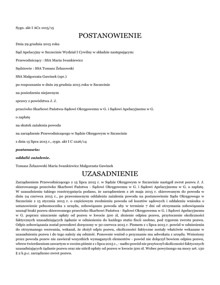 Sygn. akt I ACz 1015/15 POSTANOWIENIE Dnia 29 grudnia 2015 roku Sąd Apelacyjny w Szczecinie Wydział I Cywilny w składzie następującym: Przewodniczący : SSA Maria Iwankiewicz Sędziowie : SSA Tomasz Żelazowski SSA Małgorzata Gawinek (spr.) po rozpoznaniu w dniu 29 grudnia 2015 roku w Szczecinie na posiedzeniu niejawnym sprawy z powództwa J. J. przeciwko Skarbowi Państwa-Sądowi Okręgowemu w G. i Sądowi Apelacyjnemu w G. o zapłatę na skutek zażalenia powoda na zarządzenie Przewodniczącego w Sądzie Okręgowym w Szczecinie z dnia 15 lipca 2015 r., sygn. akt I C 1226/14 postanawia: oddalić zażalenie. Tomasz Żelazowski Maria Iwankiewicz Małgorzata Gawinek UZASADNIENIE Zarządzeniem Przewodniczącego z 15 lipca 2015 r. w Sądzie Okręgowym w Szczecinie nastąpił zwrot pozwu J. J. skierowanego przeciwko Skarbowi Państwa - Sądowi Okręgowemu w G. i Sądowi Apelacyjnemu w G. o zapłatę. W uzasadnieniu takiego rozstrzygnięcia podano, że zarządzeniem z 26 maja 2015 r. skierowanym do powoda w dniu 24 czerwca 2015 r., po prawomocnym oddaleniu zażalenia powoda na postanowienie Sądu Okręgowego w Szczecinie z 15 stycznia 2015 r. o częściowym zwolnieniu powoda od kosztów sądowych i oddaleniu wniosku o ustanowienie pełnomocnika z urzędu, zobowiązano powoda aby w terminie 7 dni od otrzymania zobowiązania usunął braki pozwu skierowanego przeciwko Skarbowi Państwa - Sądowi Okręgowemu w G. i Sądowi Apelacyjnemu w G. poprzez uiszczenie opłaty od pozwu w kwocie 500 zł, złożenie odpisu pozwu, przytoczenie okoliczności faktycznych uzasadniających żądanie w odniesieniu do każdego statio fiscii osobno, pod rygorem zwrotu pozwu. Odpis zobowiązania został powodowi doręczony w 30 czerwca 2015 r. Pismem z 1 lipca 2015 r. powód w odniesieniu do otrzymanego wezwania, wskazał, że złożył odpis pozwu, okoliczności faktyczne zostały właściwie wskazane w uzasadnieniu pozwu i do tego należy się odnieść. Ponownie wniósł o przyznanie mu adwokata z urzędu. Wniesiony przez powoda pozew nie zawierał wszystkich wymaganych elementów - powód nie dołączył bowiem odpisu pozwu, wbrew twierdzeniom zawartym w swoim piśmie z 1 lipca 2015 r., - nadto powód nie przytoczył okoliczności faktycznych uzasadniających żądanie pozwu oraz nie uiścił opłaty od pozwu w kwocie 500 zł. Wobec powyższego na mocy art. 130 § 2 k.p.c. zarządzono zwrot pozwu. Zażalenie na powyższe zarządzenie złożył powód, który zaskarżył je w całości i wniósł o jego uchylenie, zarzucając naruszenie art. 130 § 1 k.p.c. Wskazał, że pismo, o jakim nadmienia Sąd, nie odbiega od powagi pisma procesowego i można mu nadać prawidłowy bieg. Skarżący wskazał również, że przed wydaniem zaskarżonego zarządzenia Sąd I instancji powinien rozpoznać jego wniosek o przyznanie adwokata z urzędu. Sąd Apelacyjny zważył, co następuje: Zażalenie okazało się bezzasadne. Skarżący nie powołał żadnych argumentów mogących skutkować uwzględnieniem wywiedzionego środka zaskarżenia. W pierwszej kolejności należy wskazać, że wniosek powoda o ustanowienie pełnomocnika z urzędu w osobie adwokata, zawarty w piśmie z 1 lipca 2015 r. stanowił ponowny wniosek powoda w tym przedmiocie i został odrzucony postanowieniem z 15 lipca 2015 r. (k. 59) na podstawie przepisu art.1172 § 2 kpc, które zostało doręczone powodowi w dniu 29 lipca 2015 r. (k. 65). W dalszej kolejności należy wskazać, że zgodnie z art. 130 § 1 k.p.c. jeżeli pismo procesowe nie może otrzymać prawidłowego biegu wskutek niezachowania warunków formalnych lub jeżeli od pisma nie uiszczono należnej opłaty, przewodniczący wzywa stronę, pod rygorem zwrócenia pisma, do poprawienia, uzupełnienia lub opłacenia go w terminie tygodniowym. Mylne oznaczenie pisma procesowego lub inne oczywiste niedokładności nie stanowią przeszkody do nadania pismu biegu i rozpoznania go w trybie właściwym. Stosownie do treści § 2 wskazanego przepisu po bezskutecznym upływie terminu przewodniczący zwraca pismo stronie. Pismo zwrócone nie wywołuje żadnych skutków, jakie ustawa wiąże z wniesieniem pisma procesowego do sądu. Przepis z art. 128 § 1 k.p.c. stanowi z kolei, że do pisma procesowego należy dołączyć jego odpisy i odpisy załączników dla doręczenia ich uczestniczącym w sprawie osobom, a ponadto, jeżeli w sądzie nie złożono załączników w oryginale, po jednym odpisie każdego załącznika do akt sądowych. Przez odpis pisma należy rozumieć kopię oryginału tego pisma. Niedołączenie do pisma procesowego odpisów w liczbie wymaganej stanowi brak formalny, podlegający usunięciu przez wnoszącego pismo zgodnie z przepisami art. 130 k.p.c. pod sankcją w nim określoną. Tymczasem, powód poza gołosłownym stwierdzeniem, w żadnym zakresie nie uprawdopodobnił aby złożył faktycznie odpis pozwu zgodny z wymogami powyższego przepisu. Ponadto, zgodnie z art. 1262 § 1 k.p.c. sąd nie podejmie żadnej czynności na skutek pisma, od którego nie została uiszczona należna opłata. Opłacie podlega w szczególności pozew - art. 3 ust 2 pkt 1 ustawy z dnia 28 lipca 2005 r. o kosztach sądowych w sprawach cywilnych (Dz.U. Nr 167, poz. 1398). W niniejszej sprawie, postanowieniem Sądu Okręgowego w Szczecinie z 15 stycznia 2015 r., powód był zwolniony od kosztów sądowych, a mianowicie ponad kwotę 500 zł, tytułem opłaty od pozwu (k. 29). Zażalenie powoda na powyższe postanowienie zostało oddalone postanowieniem Sądu Apelacyjnego w Szczecinie z 31 marca 2015 r. (k.43). Wobec tego powód w niniejszej sprawie zobowiązany był do uiszczenia opłaty od pozwu w wysokości 500 zł. Tymczasem, skarżący nie kwestionował, że nie uzupełnił opłaty od pozwu, do której uiszczenia był zobowiązany w wyznaczonym terminie. Już zatem tylko w kontekście powyższych okoliczności, należało uznać, że zażalenie powoda nie zasługuje na uwzględnienie. Dodatkowo 