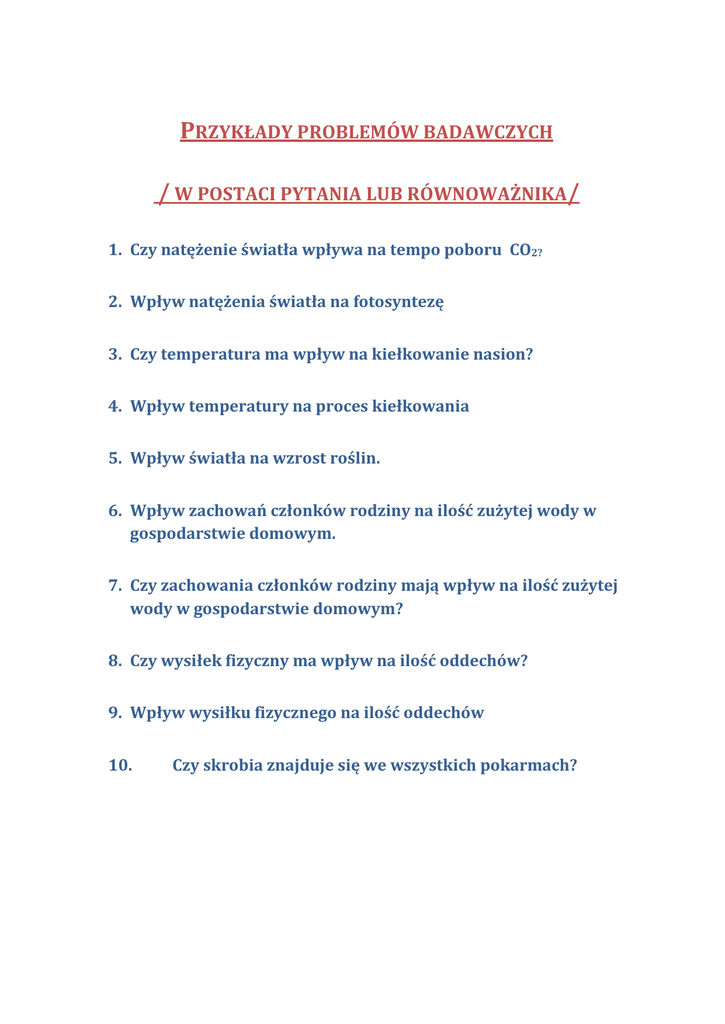 przykłady problemów badawczych /w postaci pytania lub