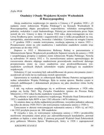 Zofia Wilk Osadnicy i Osady Wojskowe Kresów Wschodnich II Rzeczypospolitej Akcją osadnictwa wojskowego (w oparciu o Ustawę z l7 grudnia 1920 r „O nadaniu ziemi żołnierzom Wojska Polskiego”) na Kresach Wschodnich II Rzeczypospolitej objęto początkowo województwa: wileńskie nowogródzkie, poleskie, wołyńskie i część białostockiego. Później po zatwierdzeniu przez Sejm noweli do ww. Ustawy w dniu 14 marca 1932 roku, akcję rozciągnięto na tzw. Litwę Środkową (pow. suwalski i augustowski) oraz w kilku przypadkach na woj. tarnopolskie, stanisławowskie, lwowskie i lubelskie. Cytowana na wstępie Ustawa z 17 grudnia 1920 r została wstrzymana, rezolucją sejmową w marcu 1923 r. Przejmowanie ziemi na cele osadnictwa i nadzielanie osadników zostało więc przerwane aż do roku 1932. Dopiero w 1932 r Ministerstwo Reformy Rolnej w porozumieniu z Ministerstwem Spraw Wojskowych przedłożyło Sejmowi nowelę do ustawy z 1920 r uzupełniającą przepisy o nadaniu ziemi żołnierzom Wojska Polskiego. Nowelę tę uchwalono 14 marca 1932 r. Ta znowelizowana ustawa upoważniająca do rozszerzenia obszaru objętego osadnictwem przewidywała możliwość dalszego przejmowania ziemi na rzecz osadnictwa oraz przekwalifikowania tzw. osadników cywilnych (byłych ochotników wojska polskiego) na osadników wojskowych. Ochotnicy Ci już wcześniej byli zakwalifikowani do prawa otrzymania ziemi i oczekiwali od wielu lat na realizację swoich uprawnień. Uprawnienia te wynikały ze zobowiązań Rady Obrony Państwa zaciągniętych wobec ochotników Wojska Polskiego. Była to ważna sprawa. Bardzo często w różnych publikacjach i dokumentach przytacza się jako docelowe różne liczby osadników. I tak: wg wykazu znajdującego się w archiwum wojskowym z 1928 roku podaje się liczbę 7662. Wg Związku Osadników (pismo do Prezesa Rady Ministrów z 1932 roku) liczba osadników wynosiła 7918. Wg referatu w sprawie osadnictwa wojskowego, Wydziału Osad Żołnierskich z 1932 r osadników było 8059 w tym 1383 oficerów i 6676 żołnierzy. Te ostatnie dane są chyba najbardziej przybliżone, wszystkie jednakże odnoszą się tylko do okresu 1920-1923 r (do wstrzymania wykonania ustawy z 1920 r). Tymczasem w okresie wstrzymującym wykonanie ustawy z 1920 r tj. od 1923 r do 1932 przybyło jeszcze ok. 300 osadników. W związku z tym, że wstrzymanie wykonania ustawy z 1920 r przekreśliło możliwość otrzymania ziemi przez już zakwalifikowanych kandydatów, powstał problem co będzie z nimi dalej. Z pomocą przyszedł Wydział Osad Żołnierskich przy gabinecie Ministra Spraw Wojskowych, który w 1928 r zaproponował KRESOWE STANICE 59 Ministerstwu Reform Rolnych umożliwienie im kupna ziemi z reformy rolnej na warunkach ulgowych (5% gotówką a 95% długoterminowe raty). Ministerstwo Reform Rolnych wyraziło na to zgodę wydając w tym zakresie specjalne zarządzenie Urzędom Ziemskim. W rezultacie tych poczynań zakwalifikowano ogółem 18440 kandydatów zgłoszonych do 248 Powiatowych Urzędów Ziemskich. Jak wynika ze sprawozdania za 1929 r na tych ulgowych warunkach ziemię zakupiło tylko ok. 200 kandydatów. Poza tym WOŻ nawiązał rozmowy z Powiatowym Bankiem Rolnym, który w wyniku zawartego porozumienia zaoferował dla kandydatów na osadników 10% nadziałów powstałych z parcelacji przeprowadzonej we własnym zakresie (działki o obszarze od 10-20 ha). Jednakże nabywców było niewielu z uwagi na ciężkie warunki nabycia (50% gotówką) oraz powolne tempo przeprowadzania parcelacji. Do 1930 r ziemię nabyło zaledwie kilkudziesięciu kandydatów. Czekano również na ustawę zapowiedzianą przez Ministerstwo Reform Rolnych o dodatkowym przekazaniu 600 działek na rzecz osadników wojskowych z przeznaczeniem dla kandydatów miejscowego pochodzenia. Ponadto Rozporządzenie Prezydenta Rzeczypospolitej z dnia 24 listopada 1930 r „O uregulowaniu niektórych spraw z zakresu osadnictwa wojskowego” wprowadziło możliwość zwolnienia ze spłaty reszty należności. tych żołnierzy, którzy zostali zakwalifikowani do nadziału ziemi bezpłatnie ale jej nie otrzymali a nabyli działki ziemi prywatnej i państwowej. Ci żołnierze powiększyli również szeregi osadnicze. Wreszcie w 1932 roku uchwalono cytowaną już wcześniej nowelę do ustawy z 1920 roku. W jej wyniku nadzielono w latach 1932-1935 ok. 900 kandydatów w 9 województwach: w woj. wileńskim 133 osoby w woj. nowogródzkim 198 w woj. białostockim 324 w woj. poleskim 29 w woj. wołyńskim 216 w woj. tarnopolskim 4 w woj. stanisławowskim 2 w woj. lwowskim 1 w woj. lubelskim 1 Z powyższego wynika, że ilość osadników przed 1939 r oscylowała wokół liczby 9.500 biorąc pod uwagę, że do 1939 r wzrosła jeszcze liczba osadników którzy zakupili ziemię z reformy rolnej i Państwowego Banku Rolnego oraz prywatnie. Bliższe ustalenia będą możliwe po zakończeniu analizy indeksu nazwisk osadników, uzyskanego z archiwum wojskowego a będącego aktualnie przedmiotem naszych prac. 60 KRESOWE STANICE Osadnicy byli rozmieszczeni głównie w 5 województwach: wileńskim, nowogródzkim, białostockim, poleskim i wołyńskim oraz sporadycznie po 1 lub kilka osad w woj. tarnoposkim, stanisławowskim, lwowskim i lubelskim. Według sprawozdania Wydziału Osad Żołnierskich z 1929 r liczba osad żołnierskich wynosiła 1400. Po wznowieniu nadań osadniczych w 1932 r przybyło tych osad ok. 220. Należy jeszcze uwzględnić osady powstałe w wyniku zakupów ziemi z reformy rolnej, przez pośrednictwo Państwowego Banku Rolnego oraz prywatnie. Niestety dokładnej liczby nie da się ustalić z powodu braku dokumentów. Ewentualnej korekty spodziewamy się po analizie spisu osadników, w którym podane są nazwy osad. Według dostępnych materiałów archiwalnych udało się wynotować nazwy 1361 osad, co przedstawia poniższe zestawienie: Wykaz Osad wojskowych na Kresach Wschodnich II Rzeczypospolitej odtworzony na pods