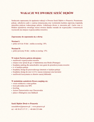 WAKACJE WE DWORZE SZEŚĆ DĘBÓW Serdecznie zapraszamy do spędzenia wakacji w Dworze Sześć Dębów w Prusewie. Przestronne pokoje, zabytkowy park z częścią restauracyjną oraz wyśmienita kuchnia zapewnią wspaniałą atmosferę podczas wakacyjnego pobytu. Lokalizacja dworu w otoczeniu pól i lasów oraz w bliskim sąsiedztwie otwartego morza stwarza idealne warunki do wypoczynku i rowerowych wycieczek (na miejscu wypożyczalnia rowerów). Zapraszamy do zapoznania się z ofertą: Wariant I: • pobyt od 6 do 10 dni - zniżka za nocleg: 10% Wariant II: • pobyt powyżej 10 dni - zniżka za nocleg: 15% W trakcie Państwa pobytu oferujemy: • możliwość wypożyczenia rowerów • miejsce oraz sprzęt do gry w badmintona oraz Boule (Petanque) • bezpłatny parking dla samochodów oraz garaż do przechowywania rowerów • tv w każdym pokoju • bezpłatny dostęp do przewodowego internetu w każdym pokoju • bezpłatny dostęp do sieci wi-fi w naszej restauracji oraz kawiarni • możliwość korzystania ze zbiorów naszej biblioteki W niedalekim sąsiedztwie Dworu znajdują się: • wieża widokowa z mini-golfem • kryta pływalnia oraz SPA • bowling • Jezioro Żarnowieckie oraz Choczewskie • plaża w Białogórze oraz Dębkach Sześć Dębów Dwór w Prusewie [email protected] | www.prusewo.pl tel: +48 58 673 57 37 | +48 604 553 606