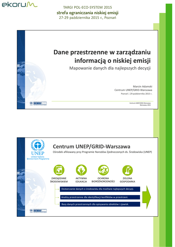 TARGI POL-ECO-SYSTEM 2015 strefa ograniczania niskiej emisji 27-29 października 2015 r., Poznań Dane przestrzenne w zarządzaniu informacją o niskiej emisji Mapowanie danych dla najlepszych decyzji Marcin Adamski Centrum UNEP/GRID-Warszawa Poznań | 29 października 2015 r. Centrum UNEP/GRID-Warszawa Warszawa, 2015 Centrum UNEP/GRID-Warszawa Ośrodek afiliowany przy Programie Narodów Zjednoczonych ds. Środowiska (UNEP) ZARZĄDZANIE ŚRODOWISKIEM AKTYWNA EDUKACJA OCHRONA BIORÓŻNORODNOŚCI ZIELONA GOSPODARKA Dostarczanie danych o środowisku dla możliwie najlepszych decyzji. Analizy przestrzenne dla identyfikacji konfliktów w przestrzeni. Bazy danych przestrzennych dla opisywania obiektów i zjawisk. TARGI POL-ECO-SYSTEM 2015 strefa ograniczania niskiej emisji 27-29 października 2015 r., Poznań Gmina jako przestrzeń Ponad 80% informacji istotnych dla administracji, można oznaczyć w przestrzeni Środowisko naturalne Mieszkańcy i ich sprawy MAPA Infrastruktura Przestrzeń publiczna Inwestycje Zdarzenia Moc dyrektywy INSPIRE Infrastruktura Informacji Przestrzennej w Europie Dyrektywa 2007/2/WE Ustawa o infrastrukturze informacji przestrzennej (Dz.U. 2010 nr 76 poz. 489) Dane pozyskiwane są tylko jeden raz. Dane pozostają przy właścicielu. Dane zarządzane na najbardziej efektywnym poziomie administracji. Dane są powszechnie dostępne dla użytkowników. STANDARDY BAZY DANYCH GEOPORTAL.GOV.PL GEOPORTALE BRANŻOWE GIS W ADM. Dane opisane są metadanymi. Więcej o INSPIRE: www.akademiainspire.pl TARGI POL-ECO-SYSTEM 2015 strefa ograniczania niskiej emisji 27-29 października 2015 r., Poznań Zastosowania geoinformacji #1 Różne cele, różne narzędzia POZYSKIWANIE DANYCH Aplikacje mobilne, pozycjonowanie (GPS) PRZETWARZANIE DANYCH Oprogramowanie narzędziowe GIS (desktop) UDOSTĘPNIANIE INFORMACJI Aplikacje mapowe, geoportale (GIS online), usługi sieciowe (WMS, WFS) Zastosowania geoinformacji #2 Gminna mapa emitorów: BAZA DANYCH Charakterystyka obiektów gromadzona w bazie danych: sektor komunalno-bytowy Lokalizacja budynku – adres Powierzchnia budynku Status własności budynku Funkcja budynku Informacja o termomodernizacji Rodzaj instalacji CO Rodzaj kotła Rodzaj spalanego paliwa Planowanie termomodernizacji Inwestycje w OZE Możliwość wizualizacji danych ilościowych i jakościowych TARGI POL-ECO-SYSTEM 2015 strefa ograniczania niskiej emisji 27-29 października 2015 r., Poznań Zastosowania geoinformacji #3 Gminna mapa emitorów: WIZUALIZACJA Zastosowania geoinformacji #4 Gminna mapa emitorów: PRZYKŁAD Źródło: http://krakow.wyborcza.pl TARGI POL-ECO-SYSTEM 2015 strefa ograniczania niskiej emisji 27-29 października 2015 r., Poznań Wartości zastosowania GIS Dlaczego warto wykorzystać GIS w zarządzaniu ograniczaniem niskiej emisji 1. Tworzenie, skuteczniejsza realizacja i korekta Planów Gospodarki Niskoemisyjnej. 2. Integracja danych, optymalizacja kosztów zarządzania procesem. 3. Interoperacyjność systemów, możliwość wykorzystania informacji przestrzennej przez różne podmioty. Dziękuję za uwagę Zapraszamy do współpracy ZARZĄDZANIE ŚRODOWISKIEM KONTAKT: www.gridw.pl [email protected] • • • • • SZKOLENIA INSPIRE + USTAWA IIP SZKOLENIA Z ZASTOSOWAŃ GIS WDRAŻANIE GIS DO PRACY URZĘDÓW OPRACOWANIA MAPOWE GEOPORTALE