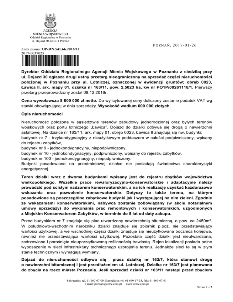 AGENCJA MIENIAWOJSKOWEGO Oddział Regionalny w Poznaniu ul. Dojazd 30, 60-631 Poznań Znak pisma: OP-DN.541.66.2016/11 2017-0037025 P O Z N A Ń , 2 0 1 7 -0 1 -2 6 Dyrektor Oddziału Regionalnego Agencji Mienia Wojskowego w Poznaniu z siedzibą przy ul. Dojazd 30 ogłasza drugi ustny przetarg nieograniczony na sprzedaż części nieruchomości położonej w Poznaniu przy ul. Lotniczej, oznaczonej w ewidencji gruntów; obręb 0023, Ławica II, ark. mapy 01, działka nr 163/11, pow. 2,5023 ha, kw nr PO1P/00261118/1. Pierwszy przetarg przeprowadzony został 08.12.2016r. Cena wywoławcza 8 000 000 zł netto. Do wylicytowanej ceny doliczony zostanie podatek VAT wg stawki obowiązującej w dniu sprzedaży. Wysokość wadium 600 000 złotych. Opis nieruchomości Nieruchomość położona w sąsiedztwie terenów zabudowy jednorodzinnej oraz byłych terenów wojskowych oraz portu lotniczego „Ławica”. Dojazd do działki odbywa się drogą o nawierzchni asfaltowej. Na działce nr 163/11, ark. mapy 01, obręb 0023, Ławica II znajdują się nw. budynki: budynek nr 7 - trzykondygnacyjny z nieużytkowym poddaszem w całości podpiwniczony, wpisany do rejestru zabytków, budynek nr 9 - jednokondygnacyjny, niepodpiwniczony, budynek nr 10 - jednokondygnacyjny, podpiwniczony, wpisany do rejestru zabytków, budynek nr 100 - jednokondygnacyjny, niepodpiwniczony. Budynki posadowione na przedmiotowej działce nie posiadają świadectwa charakterystyki energetycznej. Teren działki wraz z dwoma budynkami wpisany jest do rejestru zbytków województwa wielkopolskiego. Wszelkie prace rewaloryzacyjno-konserwatorskie i adaptacyjne należy prowadzić pod ścisłym nadzorem konserwatorskim, a na ich realizację uzyskać każdorazowo wskazania oraz pozwolenie konserwatorskie. Dotyczy to także terenu, na którym posadowione są poszczególne zabytkowe budynki jak i występującej na nim zieleni. Zgodnie ze wskazaniami konserwatorskimi, nabywca zostanie zobowiązany (w akcie notarialnym umowy sprzedaży) do wykonania prac remontowych i konserwatorskich, uzgodnionych z Miejskim Konserwatorem Zabytków, w terminie do 5 lat od daty zakupu. Przed budynkiem nr 7 znajduje się plac utwardzony nawierzchnią bitumiczną, o pow. ca 2450m². W południowo-wschodnim narożniku działki znajduje się zbiornik p.poż, nie przedstawiający wartości użytkowej, a we wschodniej części działki znajduje się nieużytkowana bocznica kolejowa, również nie przedstawiająca wartości użytkowej. Pozostała część działki jest nieutwardzona, zadrzewiona i porośnięta nieuporządkowaną roślinnością trawiastą. Rejon lokalizacji posiada pełne wyposażenie w sieci infrastruktury technicznego uzbrojenia terenu. Jednakże sieci te są w złym stanie technicznym i wymagają wymiany. Dojazd do nieruchomości odbywa się przez działkę nr 163/7, która stanowi drogę o nawierzchni bitumicznej i jest przedłużeniem ul. Lotniczej. Działka nr 163/7 jest planowana do zbycia na rzecz miasta Poznania. Jeśli sprzedaż działki nr 163/11 nastąpi przed zbyciem Sekretariat: tel. 61 660-67-00, Kancelaria: tel. 61 660-67-33, faks 61 660-67-01 e-mail: [email protected] www.amw.com.pl Strona 1 z 2 działki nr 163/7 na rzecz Miasta Poznania to działka nr 163/7 obciążona zostanie służebnością przejazdu i przechodu na rzecz każdoczesnego właściciela działki nr 163/11. W Studium uwarunkowań i kierunków zagospodarowania przestrzennego miasta Poznania przedmiotowe działki znajdują się na terenie oznaczonym symbolem U-tereny zabudowy usługowej. Działki znajdują się w Obszarze Ograniczonego Użytkowania lotniska Poznań-Ławica, dla którego obowiązuje Uchwała nr XVIII/302/12 Sejmiku Województwa Wielkopolskiego z 30.01.2012r. Przetarg przeprowadzony zostanie 07.04.2017r. o godz. 10:00 w siedzibie Agencji, pok. 101. Wadium należy wpłacić do 03.04.2017 r. na konto Agencji BGK 41 1130 1088 0001 3115 8520 0008. Za datę wpłaty uznaje się datę wpływu na rachunek bankowy Agencji. Osoby uprawnione do zaliczenia na poczet ceny sprzedaży nieruchomości Skarbu Państwa wartości nieruchomości pozostawionych poza obecnymi granicami państwa polskiego zwalnia się z obowiązku wniesienia wadium do wysokości kwoty nieprzekraczającej wysokości potwierdzonego prawa do rekompensaty, jeżeli w terminie co najmniej dwóch tygodni przed dniem przeprowadzenia przetargu zgłoszą uczestnictwo w przetargu, przedstawią oryginał zaświadczenia lub ostatecznej decyzji potwierdzających prawo do zaliczenia wartości nieruchomości pozostawionych poza obecnymi granicami państwa polskiego oraz złożą pisemne zobowiązanie do uiszczenia kwoty równej wysokości niewniesionego wadium w przypadku uchylenia się od zawarcia umowy. Przed przystąpieniem do przetargu konieczne jest przedłożenie komisji przetargowej dokumentu potwierdzającego tożsamości, a w przypadku pełnomocnika, dokumentu potwierdzającego tożsamość i pełnomocnictwa udzielonego w formie aktu notarialnego bądź z notarialnie poświadczonym podpisem mocodawcy. W przypadku osób prawnych, okazanie dokumentu potwierdzającego tożsamość przedstawiciela oraz aktualnego odpisu z Krajowego Rejestru Sądowego oraz dokumentu, z którego wynika upoważnienie dla uczestnika przetargu do reprezentowania tej osoby prawnej. Wadium wniesione przez uczestnika, który wygrał przetarg, zalicza się na poczet ceny nabycia nieruchomości. Koszty związane z zawarciem umowy ponosi nabywca. Okazanie granic działek staraniem i na koszt nabywcy. W razie uchylenia się oferenta, który wygrał przetarg, od zawarcia umowy sprzedaży wpłacone wadium ulega przepadkowi. Wylicytowana cena nabycia musi być odnotowana na rachunku bankowym OR AMW w Poznaniu najpóźniej w przeddzień podpisania aktu notarialnego. Dyrektor OR AMW w Poznaniu zastrzega sobie prawo odwołania przetargu z ważnych przyczyn. W sprawach przetargu informacje udzielane są w siedzibie Oddziału Regionalnego AMW