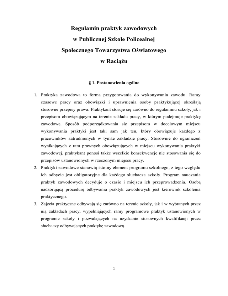 Regulamin praktyk zawodowych w Publicznej Szkole Policealnej Społecznego Towarzystwa Oświatowego w Raciążu § 1. Postanowienia ogólne 1. Praktyka zawodowa to forma przygotowania do wykonywania zawodu. Ramy czasowe pracy oraz obowiązki i uprawnienia osoby praktykującej określają stosowne przepisy prawa. Praktykant stosuje się zarówno do regulaminu szkoły, jak i przepisom obowiązującym na terenie zakładu pracy, w którym podejmuje praktykę zawodową. Sposób podporządkowania się przepisom w docelowym miejscu wykonywania praktyki jest taki sam jak ten, który obowiązuje każdego z pracowników zatrudnionych w tymże zakładzie pracy. Stosownie do ograniczeń wynikających z ram prawnych obowiązujących w miejscu wykonywania praktyki zawodowej, praktykant ponosi także wszelkie konsekwencje nie stosowania się do przepisów ustanowionych w rzeczonym miejscu pracy. 2. Praktyki zawodowe stanowią istotny element programu szkolnego, z tego względu ich odbycie jest obligatoryjne dla każdego słuchacza szkoły. Program nauczania praktyk zawodowych decyduje o czasie i miejscu ich przeprowadzenia. Osobą nadzorującą procedurę odbywania praktyk zawodowych jest kierownik szkolenia praktycznego. 3. Zajęcia praktyczne odbywają się zarówno na terenie szkoły, jak i w wybranych przez nią zakładach pracy, wypełniających ramy programowe praktyk ustanowionych w programie szkoły i pozwalających na uzyskanie stosownych kwalifikacji przez słuchaczy odbywających praktykę zawodową. 1 § 2. Podstawa prawna 1. Regulamin praktyk zawodowych ustanawia się zgodnie z zasadami prawa, wyrażanego w: - Ustawie z dnia 7 września 1991 r. o systemie oświaty (Dz. U. z 2004 r. Nr 256, poz. 2572, z późn. zm.), - Statucie Publicznej Szkoły Policealnej Społecznego Towarzystwa Oświatowego w Raciążu, - Rozporządzeniu Ministra Edukacji Narodowej z dnia 15 grudnia 2010 r. w sprawie praktycznej nauki zawodu (Dz. U. 2010 nr 244 poz. 1626 z późn. zm.), - Rozporządzeniu Ministra Edukacji Narodowej z dnia 7 lutego 2012 r. w sprawie podstawy programowej kształcenia w zawodach (Dz. U. 2012 nr 0 poz. 184); § 3. Cel praktyki zawodowej 1. Ogólne cele praktyki zawodowej. Celem praktyki zawodowej jest doskonalenie i ugruntowywanie umiejętności praktycznych w konkretnym zawodzie. Proces doskonalenia obejmuje: - poszerzenie wiedzy zdobytej w ramach edukacji szkolnej, - praktyczne ugruntowywanie umiejętności na wybranych stanowiskach, - budowanie umiejętności pracy zespołowej, - poszerzanie kompetencji zawodowych w zakresie umiejętności interpersonalnych, - budowanie odpowiedniego podejścia do pracy, ze szczególnym uwzględnieniem jakości wykonywanej pracy i traktowania wykonywanych obowiązków pracowniczych; 2. Działania podejmowane przez słuchacza w ramach praktyki zawodowej. Słuchacz odbywający praktykę zawodową: - zapoznaje się z zasadami funkcjonowania zakładu pracy, w tym kolejnych działów 2 przedsiębiorstwa, - uczy się obsługi podstawowych urządzeń, znajdujących się na wyposażeniu zakładu pracy, - stosuje się do zespołowych ram pracy, - wykazuje zdyscyplinowanie niezbędne w miejscu wykonywania praktyki zawodowej, - dba o własne miejsce pracy zgodnie z zasadami odnoszącymi się do porządku w miejscu pracy, - ocenia jakość własnej pracy w miejscu odbywania praktyki zawodowej, - przestrzenia norm bezpieczeństwa, w tym regulaminu BHP i stosownych przepisów dotyczących ochrony przeciwpożarowej. § 4. Zadania kierownika szkolenia praktycznego 1. Kierownik szkolenia praktycznego zajmuje się planowaniem, organizacją i nadzorem czynności obejmujących naukę zawodu. Ma obowiązek dbać o właściwy przebieg zajęć praktycznych w miejscu pracy. 2. Kierownik szkolenia praktycznego zajmuje się opracowywaniem harmonogramów szkoleń praktycznych. 3. Kierownik szkolenia praktycznego zajmuje się przygotowywaniem umów z zakładami pracy, w których prowadzone będą zajęcia praktyki zawodowej. 4. Kierownik szkolenia praktycznego zajmuje się opracowywaniem wytycznych, decydujących o podziale zadań wśród opiekunów praktyk zawodowych. 5. Zajmuje się planowaniem i organizacją szkoleń BHP w docelowych miejscach szkoleń zawodowych. 6. Zapoznaje słuchaczy z regulaminem praktyk zawodowych. 7. Uczestniczy w ustaleniach dotyczących zadań szkoły w odniesieniu do zajęć praktycznych w ramach praktyk zawodowych uczniów placówki szkolnej. 3 § 5. Obowiązki osoby przystępującej do praktyk zawodowych 1. Przygotowanie do podjęcia praktyki zawodowej Obowiązkiem słuchacza podejmującego praktykę zawodową jest przygotowanie się do niej w odpowiedni sposób. Każdy praktykant musi: - odbyć szkolenie BHP we wskazanym do tego terminie, - odebrać stosowny dokument rejestrujący proces odbywania praktyki zawodowej (tzw. „dzienniczek praktyk”), - wypełnić pismo - prośbę o odbycie praktyki oraz zawrzeć stosowną umowę dotyczącą podjęcia praktyki zawodowej; 2. Zdyscyplinowanie praktykanta Praktykant przystępujący do zajęć zobowiązany jest do zachowania stosownej dyscypliny a więc: - odpowiedniej postawy i kultury osobistej, - właściwego sposobu ubierania się, - zachowania odpowiedniego wyglądu, - punktualności – przestrzegania wyznaczonych godzin pracy oraz stawiania się o odpowiedniej porze w miejscu wykonywania praktyki, - dostosowania się do harmonogramu dnia pracy, - rzetelności w trakcie wykonywania powierzonych obowiązków, - skrupulatnego prowadzenia dzienniczka praktyk poprzez bieżące uzupełnianie wpisów dotyczących przebiegu praktyki zawodowej, - udostępnianie dzienniczka praktyk celem jego skontrolowania przez opiekuna praktyk, - terminowe przekazanie dzienniczka praktyk opiekunowi wystawiającego ocenę i zaliczającego praktykę zawodową; 3. Usprawiedliwienie nieobecności słuchacza 4 Brak obecności w trakcie zajęć należy usprawiedliwić. Podstawą usprawiedliwienia może być: - zwolnienie lekars