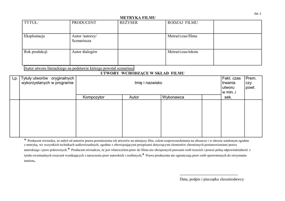 Zał. 3 METRYKA FILMU REŻYSER TYTUŁ: PRODUCENT Eksploatacja Autor /autorzy/ Scenariusza Metraż/czas/filmu Rok produkcji Autor dialogów Metraż/czas/tekstu RODZAJ FILMU Autor utworu literackiego na podstawie którego powstał scenariusz UTWORY WCHODZĄCE W SKŁAD FILMU Lp. Tytuły utworów oryginalnych wykorzystanych w programie Imię i nazwisko Kompozytor Autor Wykonawca Fakt. czas trwania utworu w min..i sek. Prem. czy powt. * Producent stwierdza, że nabył od autorów prawa przeniesienia ich utworów na niniejszy film, celem rozpowszechniania na obszarze i w okresie ustalonym zgodnie z metryką, we wszystkich technikach audiowizualnych, zgodnie z obowiązującymi przepisami dotyczącymi elementów chronionych postanowieniami prawa autorskiego i praw pokrewnych.* Producent oświadcza, że jest właścicielem praw do filmu nie obciążonych prawami osób trzecich i ponosi pełną odpowiedzialność z tytułu ewentualnych roszczeń wynikających z naruszenia praw autorskich i osobistych.* Prawa producenta nie ograniczają praw osób uprawnionych do otrzymania tantiem. ------------------------------------------Data, podpis i pieczątka zleceniodawcy