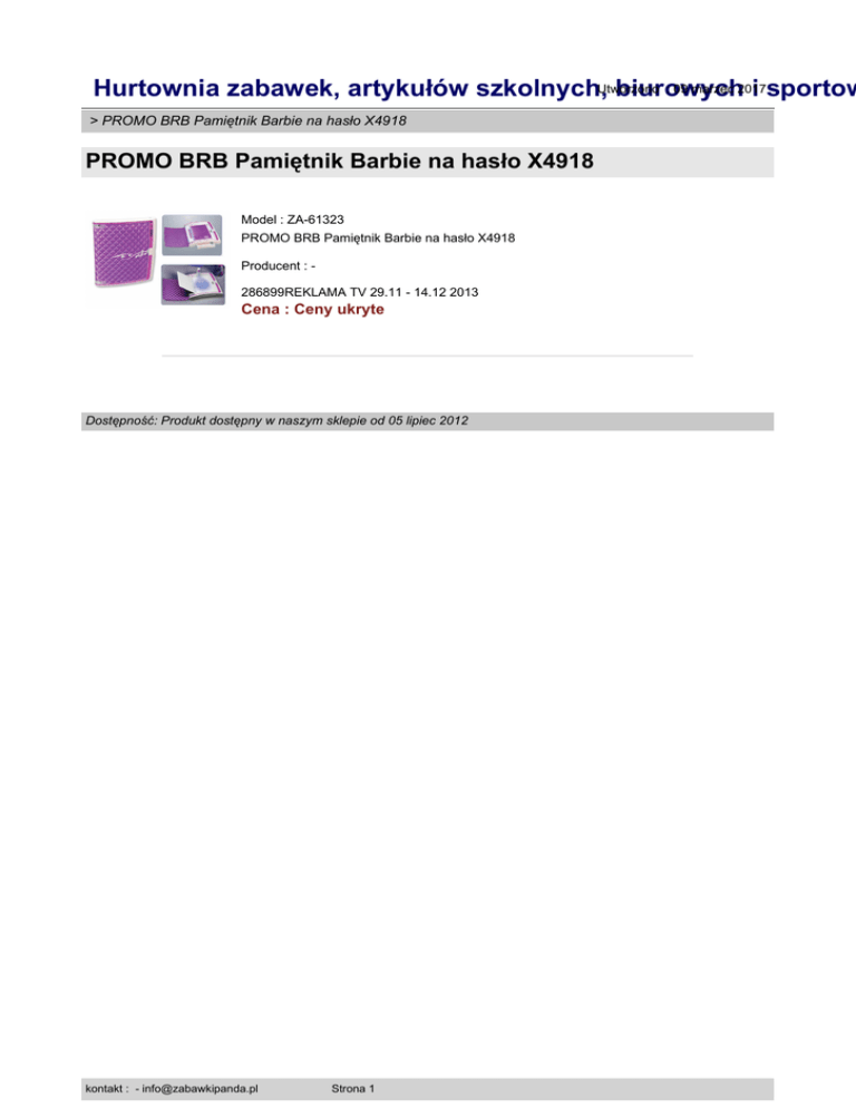 : 09 marzec 2017 Hurtownia zabawek, artykułów szkolnych,Utworzono biurowych i sportow > PROMO BRB Pamiętnik Barbie na hasło X4918 PROMO BRB Pamiętnik Barbie na hasło X4918 Model : ZA-61323 PROMO BRB Pamiętnik Barbie na hasło X4918 Producent : 286899REKLAMA TV 29.11 - 14.12 2013 Cena : Ceny ukryte Dostępność: Produkt dostępny w naszym sklepie od 05 lipiec 2012 kontakt : - [email protected] Strona 1
