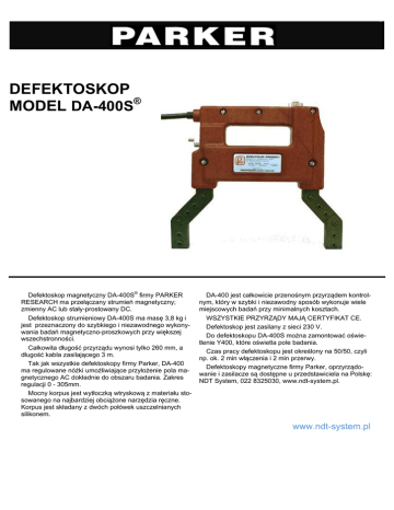 DEFEKTOSKOP MODEL DA-400S® Defektoskop magnetyczny DA-400S® firmy PARKER RESEARCH ma przełączany strumień magnetyczny; zmienny AC lub stały-prostowany DC. Defektoskop strumieniowy DA-400S ma masę 3,8 kg i jest przeznaczony do szybkiego i niezawodnego wykonywania badań magnetyczno-proszkowych przy większej wszechstronności. Całkowita długość przyrządu wynosi tylko 260 mm, a długość kabla zasilającego 3 m. Tak jak wszystkie defektoskopy firmy Parker, DA-400 ma regulowane nóżki umożliwiające przyłożenie pola magnetycznego AC dokładnie do obszaru badania. Zakres regulacji 0 - 305mm. Mocny korpus jest wytłoczką wtryskową z materiału stosowanego na najbardziej obciążone narzędzia ręczne. Korpus jest składany z dwóch połówek uszczelnianych silikonem. DA-400 jest całkowicie przenośnym przyrządem kontrolnym, który w szybki i niezawodny sposób wykonuje wiele miejscowych badań przy minimalnych kosztach. WSZYSTKIE PRZYRZĄDY MAJĄ CERTYFIKAT CE. Defektoskop jest zasilany z sieci 230 V. Do defektoskopu DA-400S można zamontować oświetlenie Y400, które oświetla pole badania. Czas pracy defektoskopu jest określony na 50/50, czyli np. ok. 2 min włączenia i 2 min przerwy. Defektoskopy magnetyczne firmy Parker, oprzyrządowanie i zasilacze są dostępne u przedstawiciela na Polskę: NDT System, 022 8325030, www.ndt-system.pl. www.ndt-system.pl