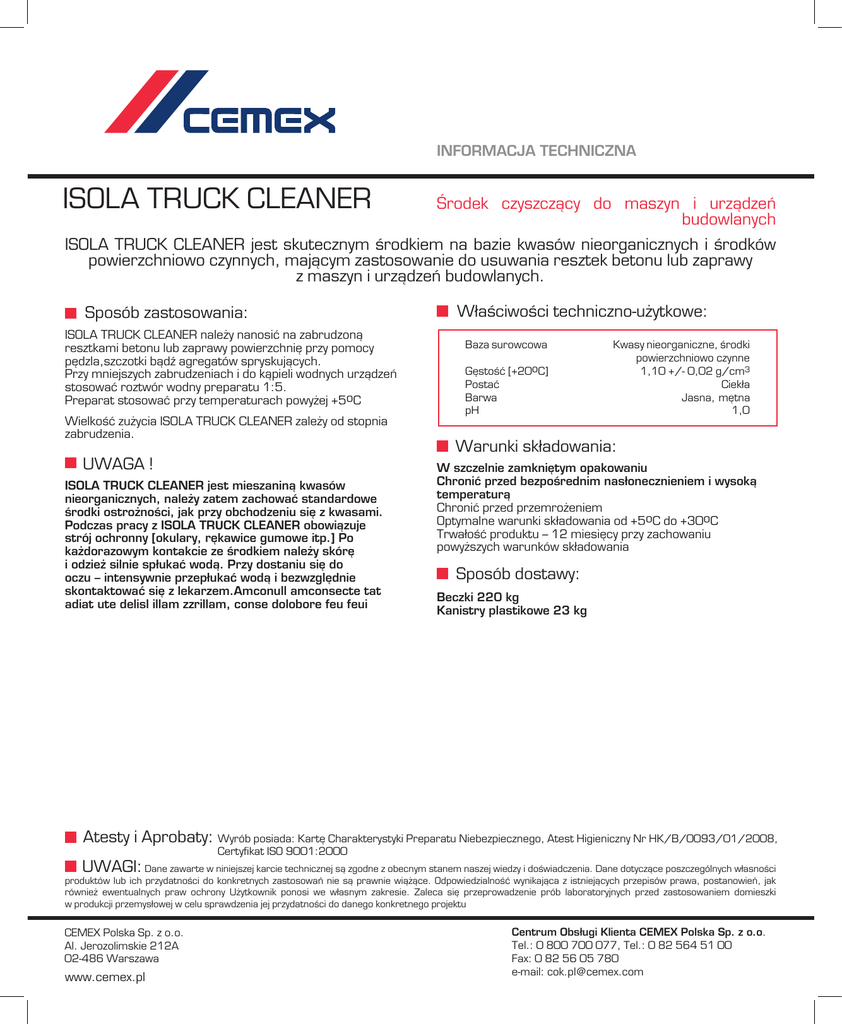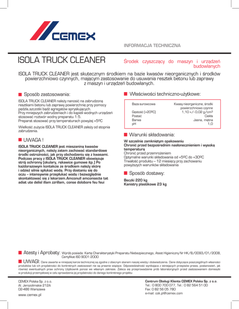 informacja techniczna ISOLA TRUCK CLEANER Środek czyszczący do maszyn i urządzeń budowlanych ISOLA TRUCK CLEANER jest skutecznym środkiem na bazie kwasów nieorganicznych i środków powierzchniowo czynnych, mającym zastosowanie do usuwania resztek betonu lub zaprawy z maszyn i urządzeń budowlanych. Sposób zastosowania: ISOLA TRUCK CLEANER należy nanosić na zabrudzoną resztkami betonu lub zaprawy powierzchnię przy pomocy pędzla,szczotki bądź agregatów spryskujących. Przy mniejszych zabrudzeniach i do kąpieli wodnych urządzeń stosować roztwór wodny preparatu 1:5. Preparat stosować przy temperaturach powyżej +5oC Wielkość zużycia ISOLA TRUCK CLEANER zależy od stopnia zabrudzenia. UWAGA ! ISOLA TRUCK CLEANER jest mieszaniną kwasów nieorganicznych, należy zatem zachować standardowe środki ostrożności, jak przy obchodzeniu się z kwasami. Podczas pracy z ISOLA TRUCK CLEANER obowiązuje strój ochronny [okulary, rękawice gumowe itp.] Po każdorazowym kontakcie ze środkiem należy skórę i odzież silnie spłukać wodą. Przy dostaniu się do oczu – intensywnie przepłukać wodą i bezwzględnie skontaktować się z lekarzem.Amconull amconsecte tat adiat ute delisl illam zzrillam, conse dolobore feu feui Właściwości techniczno-użytkowe: Baza surowcowa Gęstość [+20oC] Postać Barwa pH Kwasy nieorganiczne, środki powierzchniowo czynne 1,10 +/- 0,02 g/cm3 Ciekła Jasna, mętna 1,0 Warunki składowania: W szczelnie zamkniętym opakowaniu Chronić przed bezpośrednim nasłonecznieniem i wysoką temperaturą Chronić przed przemrożeniem Optymalne warunki składowania od +5oC do +30oC Trwałość produktu – 12 miesięcy przy zachowaniu powyższych warunków składowania Sposób dostawy: Beczki 220 kg Kanistry plastikowe 23 kg Atesty i Aprobaty: Wyrób posiada: Kartę Charakterystyki Preparatu Niebezpiecznego, Atest Higieniczny Nr HK/B/0093/01/2008, Certyfikat ISO 9001:2000 UWAGI: Dane zawarte w niniejszej karcie technicznej są zgodne z obecnym stanem naszej wiedzy i doświadczenia. Dane dotyczące poszczególnych własności produktów lub ich przydatności do konkretnych zastosowań nie są prawnie wiążące. Odpowiedzialność wynikająca z istniejących przepisów prawa, postanowień, jak również ewentualnych praw ochrony Użytkownik ponosi we własnym zakresie. Zaleca się przeprowadzenie prób laboratoryjnych przed zastosowaniem domieszki w produkcji przemysłowej w celu sprawdzenia jej przydatności do danego konkretnego projektu CEMEX Polska Sp. z o.o. Al. Jerozolimskie 212A 02-486 Warszawa www.cemex.pl Centrum Obsługi Klienta CEMEX Polska Sp. z o.o. Tel.: 0 800 700 077, Tel.: 0 82 564 51 00 Fax: 0 82 56 05 780 e-mail: [email protected]