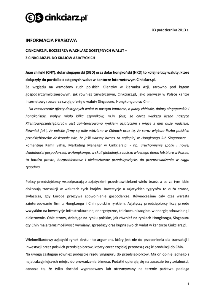 03 października 2013 r. INFORMACJA PRASOWA CINKCIARZ.PL ROZSZERZA WACHLARZ DOSTĘPNYCH WALUT – Z CINKCIARZ.PL DO KRAJÓW AZJATYCKICH Juan chiński (CNY), dolar singapurski (SGD) oraz dolar hongkoński (HKD) to kolejne trzy waluty, które dołączyły do portfolio dostępnych walut w kantorze internetowym Cinkciarz.pl. Ze względu na wzmożony ruch polskich Klientów w kierunku Azji, zarówno pod kątem gospodarczym/biznesowym, jak również turystycznym, Cinkciarz.pl, jako pierwszy w Polsce kantor internetowy rozszerza swoją ofertę o waluty Singapuru, Hongkongu oraz Chin. – Na rozszerzenie oferty dostępnych walut w naszym kantorze, o juany chińskie, dolary singapurskie i hongkońskie, wpływ miało kilka czynników, m.in. fakt, że coraz większa liczba naszych Klientów/przedsiębiorców jest zainteresowana rynkiem azjatyckim i wiąże z nim duże nadzieje. Również fakt, że polskie firmy są mile widziane w Chinach oraz to, że coraz większa liczba polskich przedsiębiorców doskonale wie, że jeśli własny biznes to najlepiej w Hongkongu lub Singapurze – komentuje Kamil Sahaj, Marketing Manager w Cinkciarz.pl - np. uruchomienie spółki i nowej działalności gospodarczej, w Hongkongu, w skali globalnej, z zacisza własnego domu lub biura w Polsce, to bardzo proste, bezproblemowe i niekosztowne przedsięwzięcie, do przeprowadzenia w ciągu tygodnia. Polscy przedsiębiorcy współpracują z azjatyckimi przedstawicielami wielu branż, a co za tym idzie dokonują transakcji w walutach tych krajów. Inwestycje u azjatyckich tygrysów to duża szansa, zwłaszcza, gdy Europa przeżywa spowolnienie gospodarcze. Równocześnie cały czas wzrasta zainteresowanie firm z Hongkongu i Chin polskim rynkiem. Azjatyccy przedsiębiorcy liczą przede wszystkim na inwestycje infrastrukturalne, energetyczne, telekomunikacyjne, w energię odnawialną i elektrownie. Obie strony, działając na rynku polskim, jak również na rynkach Hongkongu, Singapuru czy Chin mają teraz możliwość wymiany, sprzedaży oraz kupna swoich walut w kantorze Cinkciarz.pl. Wielomiliardowy azjatycki rynek zbytu - to argument, który jest nie do przecenienia dla transakcji i inwestycji przez polskich przedsiębiorców, którzy coraz częściej przenoszą część produkcji do Chin. Na uwagę zasługuje również podejście rządu Singapuru do przedsiębiorców. Ma on opinię jednego z najatrakcyjniejszych miejsc do prowadzenia biznesu. Podatki opierają się na zasadzie terytorialności, oznacza to, że tylko dochód wypracowany lub otrzymywany na terenie państwa podlega 1 03 października 2013 r. INFORMACJA PRASOWA opodatkowaniu. Nie ma żadnych ograniczeń związanych z reinwestowaniem zysków, ich transferem za granicę oraz z przeprowadzaniem transakcji na zagranicznych rynkach i giełdach. Dywidendy są zwolnione od podatku. Do tej pory dolary singapurskie bardzo trudno było zdobyć w Polsce. Dzięki ofercie kantoru Cinkciarz.pl przedsiębiorcy chcący dokonywać transakcji w walucie Singapuru mają taką możliwość. - Polscy przedsiębiorcy wiedzą, że np. Singapur ma bardzo przyjazną biznesowi legislację i wyjątkowo niskie podatki. Dlatego chętnie prowadzą tam swoje interesy i są zainteresowani realizacją transakcji handlowych i inwestycyjnych w walucie tego kraju. Podobnie jest w przypadku Hongkongu, czy Chin, do których coraz częściej przenoszą swoje produkcje lub zwyczajnie udają się w celach turystycznych. Stąd wprowadzenie w naszym kantorze walut tych krajów – podsumowuje Kamil Sahaj. ***** Od teraz wszystkie 26 walut – dolar amerykański (USD), dolar australijski (AUD), dolar hongkoński (HKD), dolar kanadyjski (CAD), dolar nowozelandzki (NZD), dolar singapurski (SGD), euro (EUR), forint węgierski (HUF), frank szwajcarski (CHF), funt brytyjski (GBP), jen japoński (JPY), korona czeska (CZK), korona duńska (DKK), korona norweska(NOK), korona szwedzka (SEK), kuna chorwacka (HRK), lej rumuński (RON), lew bułgarski (BGN), lira turecka (TRY), lit litewski (LTL), łat łotewski (ŁAT), peso meksykańskie (MXN), rand RPA (ZAR), rubel rosyjski (RUB), juan chiński (CNY), złoty polski (PLN) – dostępne są online, w cenach konkurencyjnych dla banków i kantorów. - Każdy właściciel firmy wie, że czas to pieniądz. Dlatego coraz większa liczba przedsiębiorców prowadzących biznes na rynkach międzynarodowych korzysta z usług, jakie oferuje Cinkciarz.pl. Dla przedsiębiorcy kluczowe jest bezpieczeństwo wymiany walut oraz wygoda i szybkość transakcji. Wychodząc im naprzeciw, zwłaszcza tym, którzy prowadzą swój biznes z krajami azjatyckimi (Chiny, Hongkong, Singapur), z krajami bałkańskimi (Bułgaria, Rumunia, Chorwacja) czy równie odległymi, jak RPA, Nowa Zelandia czy Meksyk – kantor wprowadził do swego portfolio 11 nowych walut, którymi przedsiębiorcy mogą dokonywać transakcji z partnerami/kontrahentami biznesowymi – wyjaśnia Kamil Sahaj. 2 03 października 2013 r. INFORMACJA PRASOWA Nowe możliwości dotyczą zarówno przedsiębiorców, jak i osób fizycznych, np.: studenci sinologii, przygotowując się do wyjazdu na stypendium do Chin, czy też nowożeńcy, przed podróżą poślubną na plaże Cancun bez problemu mają teraz dostęp do juanów chińskich czy meksykańskich peso. Tym samym Cinkciarz.pl znosi kolejne granice dla swoich klientów. Dzięki tym walutom zarówno przedsiębiorcy, jak i podróżujący będą mogli swobodnie dokonywać transakcji w 96 krajach świata. – Zakup walut powszechnie używanych, takich jak dolar amerykański, funt brytyjski czy euro, nie stanowi wyzwania. Gorzej bywa, gdy ktoś chciałby nabyć waluty mniej popularne, np. chcą wybrać się do Chin, na Łotwę, do RPA czy do Singapuru – komentuje Sahaj – Cinkciarz.pl wie doskonale, że Polacy podróżują w różne zakątki świata, z różnych powodów: wakacyjnych, biznesowych, zarobkowych – rozszerzamy ofertę, ułatwiając naszym klientom życie. IN