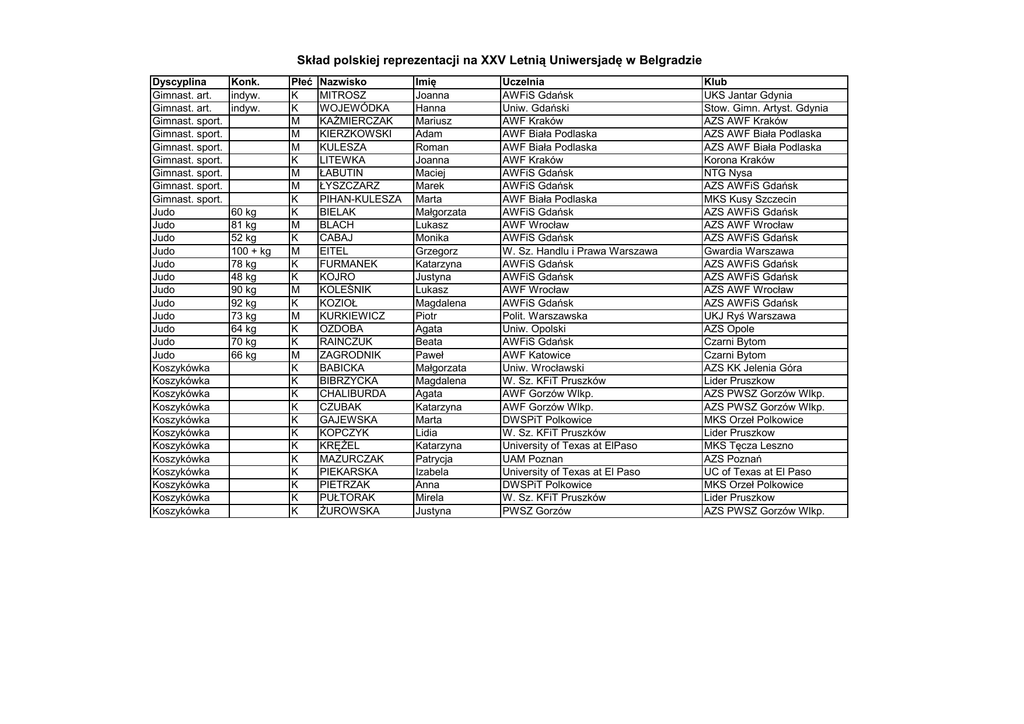 Skład polskiej reprezentacji na XXV Letnią Uniwersjadę w Belgradzie Dyscyplina Gimnast. art. Gimnast. art. Gimnast. sport. Gimnast. sport. Gimnast. sport. Gimnast. sport. Gimnast. sport. Gimnast. sport. Gimnast. sport. Judo Judo Judo Judo Judo Judo Judo Judo Judo Judo Judo Judo Koszykówka Koszykówka Koszykówka Koszykówka Koszykówka Koszykówka Koszykówka Koszykówka Koszykówka Koszykówka Koszykówka Koszykówka Konk. indyw. indyw. 60 kg 81 kg 52 kg 100 + kg 78 kg 48 kg 90 kg 92 kg 73 kg 64 kg 70 kg 66 kg Płeć K K M M M K M M K K M K M K K M K M K K M K K K K K K K K K K K K Nazwisko MITROSZ WOJEWÓDKA KAŹMIERCZAK KIERZKOWSKI KULESZA LITEWKA ŁABUTIN ŁYSZCZARZ PIHAN-KULESZA BIELAK BLACH CABAJ EITEL FURMANEK KOJRO KOLEŚNIK KOZIOŁ KURKIEWICZ OZDOBA RAINCZUK ZAGRODNIK BABICKA BIBRZYCKA CHALIBURDA CZUBAK GAJEWSKA KOPCZYK KRĘśEL MAZURCZAK PIEKARSKA PIETRZAK PUŁTORAK śUROWSKA Imię Joanna Hanna Mariusz Adam Roman Joanna Maciej Marek Marta Małgorzata Lukasz Monika Grzegorz Katarzyna Justyna Lukasz Magdalena Piotr Agata Beata Paweł Małgorzata Magdalena Agata Katarzyna Marta Lidia Katarzyna Patrycja Izabela Anna Mirela Justyna Uczelnia AWFiS Gdańsk Uniw. Gdański AWF Kraków AWF Biała Podlaska AWF Biała Podlaska AWF Kraków AWFiS Gdańsk AWFiS Gdańsk AWF Biała Podlaska AWFiS Gdańsk AWF Wrocław AWFiS Gdańsk W. Sz. Handlu i Prawa Warszawa AWFiS Gdańsk AWFiS Gdańsk AWF Wrocław AWFiS Gdańsk Polit. Warszawska Uniw. Opolski AWFiS Gdańsk AWF Katowice Uniw. Wrocławski W. Sz. KFiT Pruszków AWF Gorzów Wlkp. AWF Gorzów Wlkp. DWSPiT Polkowice W. Sz. KFiT Pruszków University of Texas at ElPaso UAM Poznan University of Texas at El Paso DWSPiT Polkowice W. Sz. KFiT Pruszków PWSZ Gorzów Klub UKS Jantar Gdynia Stow. Gimn. Artyst. Gdynia AZS AWF Kraków AZS AWF Biała Podlaska AZS AWF Biała Podlaska Korona Kraków NTG Nysa AZS AWFiS Gdańsk MKS Kusy Szczecin AZS AWFiS Gdańsk AZS AWF Wrocław AZS AWFiS Gdańsk Gwardia Warszawa AZS AWFiS Gdańsk AZS AWFiS Gdańsk AZS AWF Wrocław AZS AWFiS Gdańsk UKJ Ryś Warszawa AZS Opole Czarni Bytom Czarni Bytom AZS KK Jelenia Góra Lider Pruszkow AZS PWSZ Gorzów Wlkp. AZS PWSZ Gorzów Wlkp. MKS Orzeł Polkowice Lider Pruszkow MKS Tęcza Leszno AZS Poznań UC of Texas at El Paso MKS Orzeł Polkowice Lider Pruszkow AZS PWSZ Gorzów Wlkp. LA LA LA LA LA LA LA LA LA LA LA LA LA LA LA LA LA LA LA LA LA LA LA LA LA LA LA LA LA LA LA LA Łucznictwo Łucznictwo Łucznictwo Łucznictwo Łucznictwo Łucznictwo m chód m 400 k 100, 200 k w dal k chód m kula k dysk m oszczep k dysk m chód k 200 k 100 m 400 m 400 m trójskok m kula m 200 m 100 m 200 k tyczka k 4x100 k 4x100 m oszczep m 4x100 k kula m w dal k wzwyŜ m 400 m 400 m 400 m 100 k młot Klas. Klas. Klas. Klas. Klas. Klas. M M K K K M K M K M K K M M M M M M M K K K M M K M K M M M M K K M K K M M AUGUSTYN BAŃKA BRZEZIŃSKA DOBIJA DYGACZ GIśA GLANC JANIK JARMUśEK JELONEK JESCHKE JĘDRUSIŃSKA KĘDZIA KOZŁOWSKI KRUHLIK KRZYWOSZ KUBACZYK KUĆ MASZTAK PIWOWARSKA POPOWICZ PTAK RAKOCZY ROSZKO SOBIESZEK STARZAK STEPANIUK WASIAK WIADEREK WIERUSZEWSKI ZACZEK ZADURA ĆWIENCZEK DOBROWOLSKI MOSPINEK MYSZOR PROĆ PRZEPIÓRA Rafał Witold Iwona Teresa Agnieszka Jakub śaneta Igor Agnieszka Jakub Marta Dorota Piotr Kacper Paweł Krzysztof Robert Dariusz Kamil Joanna Marika Ewelina Paweł Jacek Magdalena Marcin Kamila Jarosław Piotr Rafał Artur Małgorzata Małgorzata Rafał Justyna Wioleta Jacek Tomasz AWF Kraków Uniw. Śląski Katowice SGGW Warszawa Polit. Łódzka AWF Katowice Uniw. Rzeszowski W. Sz. NHiD Poznań AWFiS Gdańsk AWF Biała Podlaska AWF Kraków AWFiS Gdańsk W. Sz. Bankowa w Poznaniu Polit. Łódzka Uniw. W-M Olsztyn AWF Wrocław Uniw. Białystok Polit. Poznań AWF Kraków AWF Poznań W. Sz. Eduk. w Sporcie Warszawa W. Sz. PiA Poznań Uniw. Wrocławski AWFiS Gdańsk W. Sz. WFiT Białystok AWF Warszawa AWF Kraków W. Sz. FiZ Białystok Polit. Łódzka AWFiS Gdańsk Uniw. Ekonomiczny Poznań W. Sz. Eduk. i Terapii Poznań AWF Warszawa W. Sz. Bankowa w Poznaniu W. Sz. Handl. w Kielcach AWF Warszawa AWF Kraków Polit. Wrocławska Uniw. H-Przyrodn. w Kielcach AZS AWF Kraków GKS Tychy Warszawianka AZS Łódź AZS AWF Katowice LKS Stal Mielec AZS Poznań AZS AWFiS Gdańsk AZS AWF Biała Podlaska AZS AWF Kraków SKLA Sopot AZS Poznań AZS Łódź AZS UW-M Olsztyn AZS AWF Wrocław Podlasie Białystok AZS Poznań AZS AWF Kraków WKS Grunwald Poznań AZS AWF Warszawa Zawisza Bydgoszcz WKS Śląsk Wrocław AZS AWFiS Gdańsk Podlasie Białystok AZS UMCS Lublin AZS AWF Kraków Podlasie Białystok AZS Łódź AZS AWFiS Gdańsk UKS Orkan Środa Wlkp. AZS Poznań AZS AWF Warszawa MLKS Czarna Strzała Bytom Stella Kielce UKS Piątka Zgierz LKS Łucznik śywiec Strzelec Legnica Stella Kielce P.Siatkowa k. P.Siatkowa k. P.Siatkowa k. P.Siatkowa k. P.Siatkowa k. P.Siatkowa k. P.Siatkowa k. P.Siatkowa k. P.Siatkowa k. P.Siatkowa k. P.Siatkowa k. P.Siatkowa k. P.Siatkowa m. P.Siatkowa m. P.Siatkowa m. P.Siatkowa m. P.Siatkowa m. P.Siatkowa m. P.Siatkowa m. P.Siatkowa m. P.Siatkowa m. P.Siatkowa m. P.Siatkowa m. P.Siatkowa m. K K K K K K K K K K K K M M M M M M M M M M M M EFIMIENKO HALADYN KACZMAR KACZOROWSKA KOCZOROWSKA KOSEK MAJ OKUNIEWSKA SIECZKA TKACZEWSKA WELLNA ZAROŚLIŃSKA ANTOSIK BUSZEK JANECZEK KOSOK MIKOŁAJCZAK OCZKO PAWLIŃSKI POTERA STAŃCZAK TOMCZYK WRONA ZAJDER Zuzanna Marta Anna Klaudia Dominika Karolina Paulina Berenika Ewelina Krystyna Katarzyna Katarzyna Krzysztof Rafał Bartosz Grzegorz Paweł Jakub Maciej Michał Adrian Tomasz Andrzej Maciej W. Sz. Handlowa Wrocław W. Sz. Handlowa Wrocław W. Sz. Bankowości i Fin. Bielsko Biała W. Sz. KFiT Pruszków Uniw. Białostok Uniw. Jagielloński Krakow W. Sz. KFiT Pruszków BWSU śywiec W. Sz. Plan. Strateg. Dąbrowa Górnicza W. Sz. Plan. Strateg. Dąbrowa Górnicza Ateneum WyŜsza Szkoła Gdańsk PWSZ Piła Uniw. Łódzki W. Sz. Eduk. w Sporcie Warszawa AJD Częstochowa Radomska Szkoła WyŜsza Uniw. Warszawski Olsztyńska Szkoł