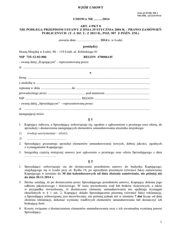 WZÓR UMOWY ZAŁĄCZNIK NR 2 NR SPR. AZ/233/19/14 UMOWA NR ……../2014 ART. 4 PKT 8 NIE PODLEGA PRZEPISOM USTAWY Z DNIA 29 STYCZNIA 2004 R. - PRAWO ZAMÓWIEŃ PUBLICZNYCH (T. J. DZ. U. Z 2013 R., POZ. 907 Z PÓŹN. ZM.) zawarta dnia ………………… 2014 r. w Łodzi pomiędzy Strażą Miejską w Łodzi, 90 – 119 Łódź, ul. Kilińskiego 81 NIP 725-12-02-006 REGON 470006145 - zwaną dalej „Kupującym” - reprezentowaną przez: ....................................................................................................................................................... a firmą ................................................................................................................................................... z siedzibą w ........................................................................................................................................ wpisaną w dniu .................................... do ........................................................................................ prowadzonego przez ............................................. pod numerem ..................................................... NIP ................................................................... REGON .................................................................. - zwaną dalej „Sprzedającym” - reprezentowaną przez: ...................................................................................................................................................... następującej treści: §1 1. Kupujący nabywa, a Sprzedający zobowiązuje się, zgodnie z ogłoszeniem o przetargu oraz ofertą, do sprzedaży i dostarczenia następujących elementów umundurowania strażnika miejskiego: 1) (rodzaj asortymentu) – (ilość), 2) ………………………………… . 2. Sprzedający gwarantuje sprzedaż elementów umundurowania nowych, dobrej jakości, zgodnych z wymaganiami Kupującego. 3. Integralną częścią niniejszej umowy jest ogłoszenie o przetargu oraz oferta Sprzedającego z dnia ………………………, §2 1. Sprzedający zobowiązuje się do dostarczenia przedmiotu umowy do budynku Kupującego, znajdującego się w Łodzi przy ul. Rydla 19, po uprzednim pisemnym (również faks) zamówieniu Kupującego w terminie do 30 dni kalendarzowych od dnia złożenia zamówienia, nie później niż do dnia 30.11.2014 r. 3. Strony ustalają, że po dostarczeniu przez Sprzedającego przedmiotu umowy, Kupujący dokona jego odbioru jakościowego i ilościowego. W razie stwierdzenia wad lub braków ilościowych, a także w przypadku stwierdzenia, iż dostarczone elementy umundurowania nie spełniają wymagań określonych w § 1 ust. 2, Kupujący składa Sprzedającemu pisemną (również faks) reklamację, a Sprzedający zobowiązany jest niezwłocznie, nie później jednak niż w terminie 7 dni licząc od dnia złożenia reklamacji, dokonać wymiany wadliwych elementów umundurowania lub dostarczyć ich brakującą ilość. 4. Koszty związane z dostarczeniem elementów umundurowania oraz z ich ewentualną wymianą ponosi Sprzedający. 1 WZÓR UMOWY §3 Kupujący przekaże Sprzedającemu tabelę rozmiarów elementów umundurowania, stanowiących przedmiot niniejszej umowy, łącznie z zamówieniem, o którym mowa w § 2 ust. 2. §4 1. Za dostarczone elementy umundurowania Kupujący zobowiązuje się zapłacić Sprzedającemu cenę w wysokości: 1) (rodzaj asortymentu) – (ilość) – (cena jednostkowa brutto) – (wartość brutto) 2) …………………………………………………………………………………. 2. Ceny, określone w ust. 1, uważa się za niezmienne przez cały okres obowiązywania niniejszej umowy 3. Ogółem wartość elementów umundurowania zakupionych na podstawie niniejszej umowy wynosi ………………. zł. brutto, słownie: ………………………………………................, w tym podatek VAT …… %, tj. ……………………….. zł., słownie ………………………………….. . §5 1. Strony ustalają, że rozliczenie z tytułu wykonania niniejszej umowy nastąpi na podstawie faktury VAT wystawionej przez Sprzedającego w dniu dostarczenia elementów umundurowania Kupującemu. 2. Zapłata wynagrodzenia należnego Sprzedającemu nastąpi przelewem na konto bankowe wskazane w treści faktury VAT w terminie do 30 dni od dnia doręczenia faktury VAT. W przypadku zwłoki w zapłacie wynagrodzenia Sprzedający ma prawo naliczyć Kupującemu ustawowe odsetki. 3. Kupujący upoważnia Sprzedającego do wystawienia faktury VAT z tytułu realizacji niniejszej umowy bez podpisu osoby przez niego upoważnionej na następujący Numer Identyfikacji Podatkowej - 725-12-02-006. §6 1. Sprzedający udziela Kupującemu ……. miesięcy gwarancji na dostarczone elementy umundurowania. Okres gwarancji rozpoczyna swój bieg od dnia dostarczenia przedmiotu umowy do budynku Kupującego. 2. W przypadku wystąpienia w okresie gwarancji wad w przedmiocie umowy, Kupujący zawiadamia Sprzedającego – na piśmie - o powstałych wadach, jednocześnie przesyłając wadliwe elementy umundurowania do siedziby Sprzedającego, a Sprzedający zobowiązuje się do bezpłatnego usunięcia stwierdzonych wad w terminie 14 dni od dnia otrzymania wadliwych elementów umundurowania. Koszty przesłania wadliwych elementów umundurowania ponosi Sprzedający. 3. Wykonanie zobowiązań wynikających z gwarancji może nastąpić poprzez usunięcie stwierdzonych wad lub wymianę wadliwych elementów umundurowania na nowe i wolne od wad. §7 1. W razie nie wykonania lub nienależytego wykonania umowy Sprzedający zapłaci Kupującemu kary umowne w następujących wypadkach: a. w przypadku jednostronnego rozwiązania umowy przez Sprzedającego – 10 % kwoty, o której mowa w § 4 ust. 3; b. w przypadku wypowiedzenia umowy przez Kupującego z powodu okoliczności, za które ponosi odpowiedzialność Sprzedający,