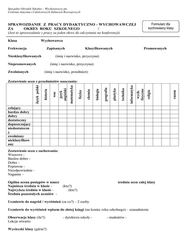 Specjalny Ośrodek Szkolno – Wychowawczy pn. Centrum Autyzmu i Całościowych Zaburzeń Rozwojowych Formularz dla wychowawcy klasy SPRAWOZDANIE Z PRACY DYDAKTYCZNO - WYCHOWAWCZEJ ZA OKRES ROKU SZKOLNEGO / (Jest to sprawozdanie z pracy za jeden okres do odczytania na konferencji) Klasa Wychowawca Frekwencja Zapisanych Klasyfikowanych Promowanych (imię i nazwisko, przyczyna): Niesklasyfikowanych (imię i nazwisko, przyczyna): Niepromowanych (imię i nazwisko, przedmiot): Zwolnionych celujący bardzo dobry dobry dostateczny dopuszczający niedostateczn y zwolniony nieklasyfikow any Zestawienie ocen z zachowania: Wzorowe Bardzo dobre Dobre Poprawne Nieodpowiednie Naganne – Ogólna ocena postępów w nauce Najniższa średnia w klasie (kto?) Najwyższa średnia w klasie (kto?) Średnia pozostałych uczniów - średnia ocen całej klasy Uczniowie do nagród / wyróżnień (za co?) – 2 osoby Uczniowie do wyróżnień wpisem do złotej księgi (na koniec roku szkolnego) – uzasadnienie Obserwacje klasy (ile?): Lekcje otwarte: Wycieczki klasy (gdzie?) - dyrektora szkoły - - studentów - razem religia wych. fizyczne informatyka technika plastyka geografia biologia chemia fizyka matematyka język angielski wos historia Język polski Zestawienie ocen z przedmiotów nauczania: - bliższe: - dalsze: Współpraca z rodzicami w klasie: W mojej klasie za najważniejsze osiągnięcie uważam: W mojej klasie napotkałam/em trudności w postaci: Inne uwagi: Wnioski do pracy z klasą: