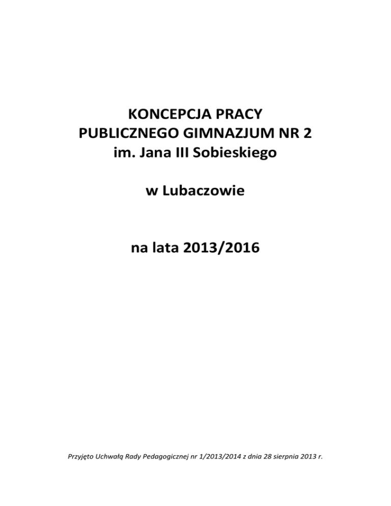 KONCEPCJA PRACY PUBLICZNEGO GIMNAZJUM NR 2 im. Jana III Sobieskiego w Lubaczowie na lata 2013/2016 Przyjęto Uchwałą Rady Pedagogicznej nr 1/2013/2014 z dnia 28 sierpnia 2013 r. Spis treści I. Proces tworzenia koncepcji pracy szkoły 1.1. Podstawy prawne 1.2. Dokumentacja szkolna wykorzystana do opracowania koncepcji 1.3. Sposób utworzenia koncepcji 1.4. Sposób zapoznania z koncepcją 1.5. Sposób upublicznienia koncepcji II. Charakterystyka szkoły 2.1 Informacje ogólne 2.2 Historia szkoły 2.3 Kadra szkoły 2.4 Uczniowie 2.5 Baza szkoły 2.6 Otoczenie szkoły III. Wizja i misja szkoły 3.1 Wizja 3.2 Misja IV. Model absolwenta V. Cele strategiczne szkoły VI. Wymagania spełniane przez szkołę VII. Monitorowanie realizacji celów 2 I. Proces tworzenia koncepcji pracy szkoły 1.1 Podstawa prawna opracowania koncepcji Ustawa z 7 września 1991 r. o systemie oświaty (Dz. U. z 2004 r. Nr 256, poz. 2572 z późn. zm.) Ustawa z 26 stycznia 1982 r. Karta Nauczyciela (Dz. U . z 2006 r. Nr 97, poz. 674 z późn. zm.), Rozporządzenie Ministra Edukacji Narodowej z 7 października 2009 r. w sprawie nadzoru pedagogicznego (Dz. U. z 2009 r. Nr 168, poz. 1324 z późn. zm.), Rozporządzenie Ministra Edukacji Narodowej z 23 grudnia 2008 r. w sprawie podstawy programowej wychowania przedszkolnego oraz kształcenia ogólnego w poszczególnych typach szkół (Dz. U . z 2009 r. Nr 4, poz. 17), Statut Publicznego Gimnazjum nr 2 im. Jana III Sobieskiego w Lubaczowie. 1.2 Dokumentacja szkolna wykorzystana do opracowania koncepcji Statut Publicznego Gimnazjum nr 2 im. Jana III Sobieskiego w Lubaczowie, Wnioski z nadzoru pedagogicznego Dyrektora szkoły, Wnioski i uwagi Rady Rodziców, Wnioski i uwagi uczniów, Wnioski Zespołu Wychowawczego, Wnioski Zespołów Przedmiotowych, Wyniki ewaluacji wewnętrznej w roku szkolnym 2012/2013. 1.3 Sposób utworzenia koncepcji Powołanie przez Dyrektora szkoły Zespołu zadaniowego do opracowania Koncepcji pracy szkoły, przedstawienie analizy projektu „Koncepcja pracy szkoły” na zebraniu z Samorządem Uczniowskim, • Przedstawienie i analiza projektu „Koncepcja pracy szkoły” na zebraniu z Radą Rodziców, • Przedstawienie projektu „Koncepcja pracy szkoły” Radzie Pedagogicznej, • Przyjęcie projektu „Koncepcja pracy szkoły” uchwałą Rady Pedagogicznej. 1.4 Sposób zapoznania z koncepcją Uczniowie – na godzinach wychowawczych, Samorząd Uczniowski – w trakcie zebrań, Rada Rodziców – w trakcie zebrań, Rodzice – podczas zebrań informacyjnych. 1.5 Sposób upublicznienia koncepcji Zamieszczenie na stronie internetowej szkoły, Udostępnienie w pokoju nauczycielskim, Udostępnienie w bibliotece szkolnej, Umieszczenie na tablicy informacyjnej na terenie szkoły. 3 II CHARAKTERYSTYKA SZKOŁY 2.1. Dane ogólne szkoły Nazwa szkoły: Publiczne Gimnazjum nr 2 w Lubaczowie im. Jana III Sobieskiego w Lubaczowie Adres szkoły: ul. Mikołaja Kopernika 22, 37-600 Lubaczów Telefon/fax: 16 632 94 27 Strona internetowa: www.pg2.lubaczow.com.pl e-mail: [email protected] Publiczne Gimnazjum nr 2 w Lubaczowie im. Jana III Sobieskiego jest nowoczesną placówką edukacyjną położoną w województwie podkarpackim w mieście powiatowym Lubaczów. Organem prowadzącym szkołę jest Burmistrz Miasta Lubaczowa. Nadzór pedagogiczny nad szkołą sprawuje Kurator Oświaty w Rzeszowie. Szkoła mieści się w jednopiętrowym budynku, z halą sportową, wybudowanym w 1961 r., położnym w centrum miasta. Usytuowanie takie jest szczególnie korzystne, ponieważ szkoła jest placówką skupiającą młodzież z całego miasta i okolic. /Załuże, Horyniec Zdrój, Wólka Krowicka, Basznia Dolna, Mokrzyca, Opaka, Dąbków/ 2.2. Historia szkoły Publiczne Gimnazjum nr 2 w Lubaczowie powstało 1 września 1999 roku. Dyrektorem szkoły została pani Maria Magoń. Naukę rozpoczęło 163 uczniów, a pracę 21 nauczycieli. W pierwszym roku działalności trwała dyskusja nad wyborem patrona. Zgodnym głosem społeczności szkolnej: uczniów, nauczycieli i rodziców został nim Jan III Sobieski. Za datę obchodów Święta Szkoły przyjęliśmy 12 września - rocznicę odsieczy wiedeńskiej. Co roku młodzieży przybywa. Najwięcej uczniów- 447 było w roku szkolnym 2001/2002. Mamy już 1168 absolwentów. W roku 2007 pani dyrektor Maria Magoń przekazała kierowanie gimnazjum panu dyrektorowi Ryszardowi Antonikowi, a od roku szkolnego 2013/2014 jest pan Witold Dubanik. Szkoła cały czas tętni życiem. Uczniowie i nauczyciele nie marnują czasu, uczymy się i rozwijamy talenty. Możemy się poszczycić licznymi osiągnięciami. Co roku uczniowie klas trzecich uzyskują dobre wyniki z egzaminu gimnazjalnego ponad ogólną średnią. Najlepsi uczniowie biorą udział w konkursach przedmiotowych. Na szczeblu wojewódzkim nasi uczniowie wywalczyli 11 miejsc laureatów i 35 miejsc finalistów. Nieobce są nam sprawy Unii Europejskiej - mamy laureatów w ogólnopolskim konkursie „Moja szkoła w Unii Europejskiej”. Gimnazjalistom nie brakuje ducha walki sportowej i w tej dziedzinie odnosimy znaczące sukcesy. Piłka nożna, ręczna, koszykówka, siatkówka, biegi to dyscypliny, w których jesteśmy mistrzami. Mamy świetnych trenerów i sportowców, o czym świadczy ilość zdobytych pucharów. Nasi artyści promują szkołę w środowisku. Co roku objawia się wiele talentów plastycznych. Ich prace prezentowane są na wystawach, zdobywają liczne nagrody w różnych konkursach, są sprzedawane na kiermaszach. Uzdolnienia muzyczne i aktorskie wyniosły naszych uczniów na sceny krajowe, a nawet zagraniczne. Szkoła dwukrotnie otrzymała tytuł „Szkoły z klasą” i raz „Nauczyciela z klasą”. Nic dziwnego, młodzież działa bardzo aktywnie także na niwie społecznej: prężnie pracuje Samo4 rząd Szkolny wybierany co roku w demokratycznych wyborach; chętni udzielają się w szkolnym wolontariacie - organizują akcje charytatywne, pracują z niepełnospraw