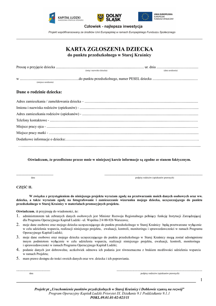 KARTA ZGŁOSZENIA DZIECKA do punktu przedszkolnego w Starej Kraśnicy Proszę o przyjęcie dziecka ................................................................................................. ur. dnia .............................................. (imię i nazwisko dziecka) (data urodzenia) w .................................................................do punktu przedszkolnego, numer PESEL dziecka .................................................. (miejsce urodzenia) Dane o rodzinie dziecka: Adres zamieszkania / zameldowania dziecka – ............................................................................................................................. Imiona i nazwiska rodziców (opiekunów) - ................................................................................................................................... Adres zamieszkania rodziców (opiekunów) - ................................................................................................................................ Telefony kontaktowe - ................................................................................................................................................................... Miejsce pracy ojca - ....................................................................................................................................................................... Miejsce pracy matki - ..................................................................................................................................................................... Dodatkowe informacje o dziecku:………………………………………………………..………………………………………. …..................................................................................................................................................................................................... Oświadczam, że przedłożone przeze mnie w niniejszej karcie informacje są zgodne ze stanem faktycznym. .................................. data .......................................................................................... podpisy rodziców (opiekunów prawnych) CZĘŚĆ II. W związku z przystąpieniem do niniejszego projektu wyrażam zgodę na przetwarzanie moich danych osobowych oraz ww. dziecka, a także wyrażam zgodę na fotografowanie i zamieszczanie wizerunku mojego dziecka, uczęszczającego do punktu przedszkolnego w Starej Kraśnicy w materiałach promocyjnych projektu. Oświadczam, iż przyjmuję do wiadomości, że: 1. administratorem tak zebranych danych osobowych jest Minister Rozwoju Regionalnego pełniący funkcję Instytucji Zarządzającej dla Programu Operacyjnego Kapitał Ludzki –ul. Wspólna 2/4 00-926 Warszawa; 2. moje dane osobowe oraz mojego dziecka uczęszczającego do punktu przedszkolnego w Starej Kraśnicy będą przetwarzane wyłącznie w celu udzielenia wsparcia, realizacji niniejszego projektu, ewaluacji, kontroli, monitoringu i sprawozdawczości w ramach Programu Operacyjnego Kapitał Ludzki; 3. moje dane osobowe oraz mojego dziecka uczęszczającego do punktu przedszkolnego w Starej Kraśnicy mogą zostać udostępnione innym podmiotom wyłącznie w celu udzielenia wsparcia, realizacji niniejszego projektu, ewaluacji, kontroli, monitoringu i sprawozdawczości w ramach Programu Operacyjnego Kapitał Ludzki; 4. podanie danych jest dobrowolne, aczkolwiek odmowa ich podania jest równoznaczna z brakiem możliwości udzielenia wsparcia w ramach Projektu; 5. mam prawo dostępu do treści swoich danych oraz ww. dziecka i ich poprawiania. .................................. data ...................................................................................... podpisy rodziców (opiekunów prawnych) 1 Projekt pt „Uruchomienie punktów przedszkolnych w Starej Kraśnicy i Dobkowie szansą na rozwój” Program Operacyjny Kapitał Ludzki Priorytet IX. Działanie 9.1 Poddziałanie 9.1.1 POKL.09.01.01-02-023/11 CZĘŚĆ III. Oświadczenie rodziców w przypadku upoważnienia innych osób do odbioru dziecka z punktu przedszkolnego (upoważnić można tylko osoby pełnoletnie) Upoważniamy do odbioru naszego dziecka z punktu przedszkolnego w Starej Kraśnicy następujące osoby: L.p. Imię i nazwisko osoby upoważnionej / miejsce zamieszkania Seria i nr dowodu osobistego Numer telefonu 1. 2. 3. 4. Bierzemy na siebie pełną odpowiedzialność prawną za bezpieczeństwo odebranego dziecka od momentu jego odbioru przez wskazaną powyżej, upoważnioną przez nas osobę. .................................. data ......................................................................................... podpisy rodziców (opiekunów prawnych) 2 Projekt pt „Uruchomienie punktów przedszkolnych w Starej Kraśnicy i Dobkowie szansą na rozwój” Program Operacyjny Kapitał Ludzki Priorytet IX. Działanie 9.1 Poddziałanie 9.1.1 POKL.09.01.01-02-023/11