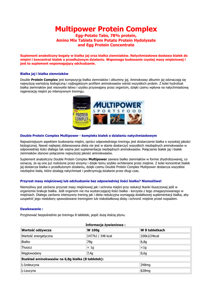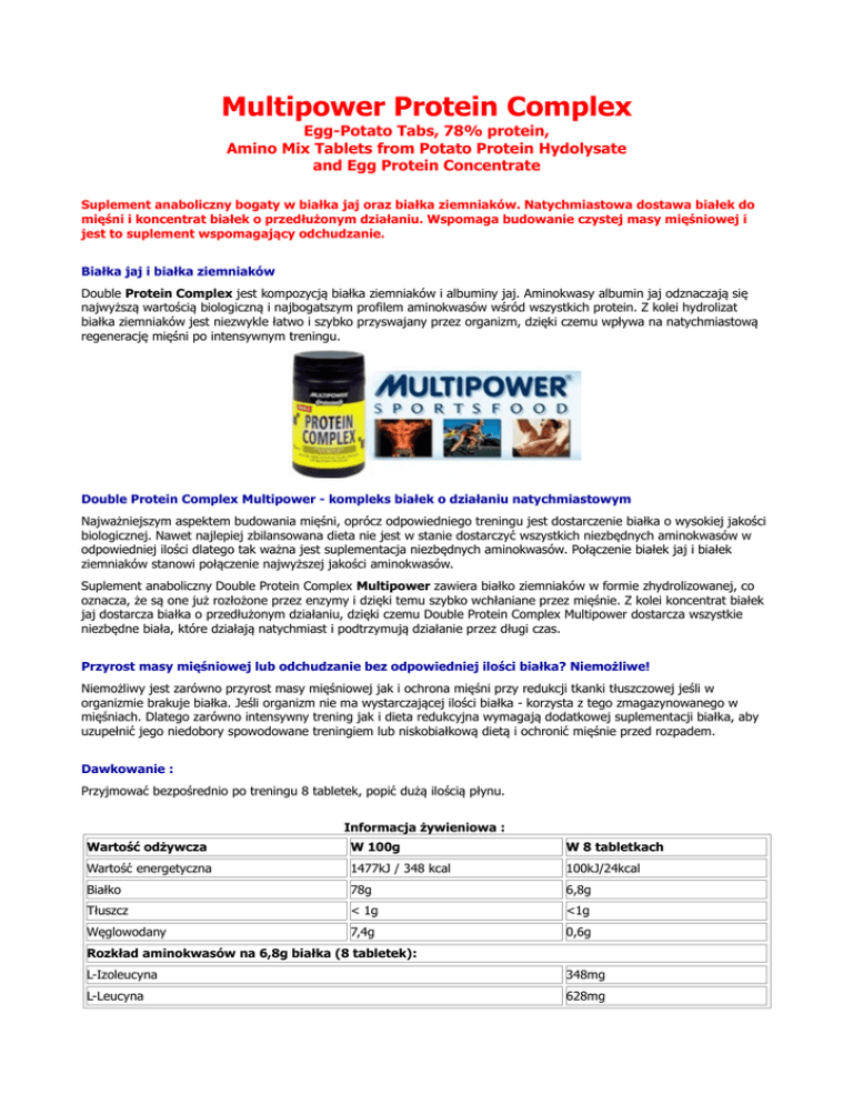 Multipower Protein Complex Egg-Potato Tabs, 78% protein, Amino Mix Tablets from Potato Protein Hydolysate and Egg Protein Concentrate Suplement anaboliczny bogaty w białka jaj oraz białka ziemniaków. Natychmiastowa dostawa białek do mięśni i koncentrat białek o przedłużonym działaniu. Wspomaga budowanie czystej masy mięśniowej i jest to suplement wspomagający odchudzanie. Białka jaj i białka ziemniaków Double Protein Complex jest kompozycją białka ziemniaków i albuminy jaj. Aminokwasy albumin jaj odznaczają się najwyższą wartością biologiczną i najbogatszym profilem aminokwasów wśród wszystkich protein. Z kolei hydrolizat białka ziemniaków jest niezwykle łatwo i szybko przyswajany przez organizm, dzięki czemu wpływa na natychmiastową regenerację mięśni po intensywnym treningu. Double Protein Complex Multipower - kompleks białek o działaniu natychmiastowym Najważniejszym aspektem budowania mięśni, oprócz odpowiedniego treningu jest dostarczenie białka o wysokiej jakości biologicznej. Nawet najlepiej zbilansowana dieta nie jest w stanie dostarczyć wszystkich niezbędnych aminokwasów w odpowiedniej ilości dlatego tak ważna jest suplementacja niezbędnych aminokwasów. Połączenie białek jaj i białek ziemniaków stanowi połączenie najwyższej jakości aminokwasów. Suplement anaboliczny Double Protein Complex Multipower zawiera białko ziemniaków w formie zhydrolizowanej, co oznacza, że są one już rozłożone przez enzymy i dzięki temu szybko wchłaniane przez mięśnie. Z kolei koncentrat białek jaj dostarcza białka o przedłużonym działaniu, dzięki czemu Double Protein Complex Multipower dostarcza wszystkie niezbędne biała, które działają natychmiast i podtrzymują działanie przez długi czas. Przyrost masy mięśniowej lub odchudzanie bez odpowiedniej ilości białka? Niemożliwe! Niemożliwy jest zarówno przyrost masy mięśniowej jak i ochrona mięśni przy redukcji tkanki tłuszczowej jeśli w organizmie brakuje białka. Jeśli organizm nie ma wystarczającej ilości białka - korzysta z tego zmagazynowanego w mięśniach. Dlatego zarówno intensywny trening jak i dieta redukcyjna wymagają dodatkowej suplementacji białka, aby uzupełnić jego niedobory spowodowane treningiem lub niskobiałkową dietą i ochronić mięśnie przed rozpadem. Dawkowanie : Przyjmować bezpośrednio po treningu 8 tabletek, popić dużą ilością płynu. Informacja żywieniowa : Wartość odżywcza W 100g W 8 tabletkach Wartość energetyczna 1477kJ / 348 kcal 100kJ/24kcal Białko 78g 6,8g Tłuszcz < 1g <1g Węglowodany 7,4g 0,6g Rozkład aminokwasów na 6,8g białka (8 tabletek): L-Izoleucyna 348mg L-Leucyna 628mg L-Lizyna 417mg L-Metionina 205mg L-Fenyloalanina 382mg L-Treonina* 355mg L-Tryptofan* 150mg L-Walina* 423mg L-Arginina 348mg L-Cystyna 178mg L-Histydyna 109mg L-Tyrozyna 328mg L-Alanina 417mg L-Kwas asparaginowy 738mg L-Kwas glutaminowy 840mg L-Glicyna 273mg L-Prolina 259mg L-Seryna 430mg • • Inne składniki : sorbitol, stearynian magnezu. www.kulturystyka.sklep.pl