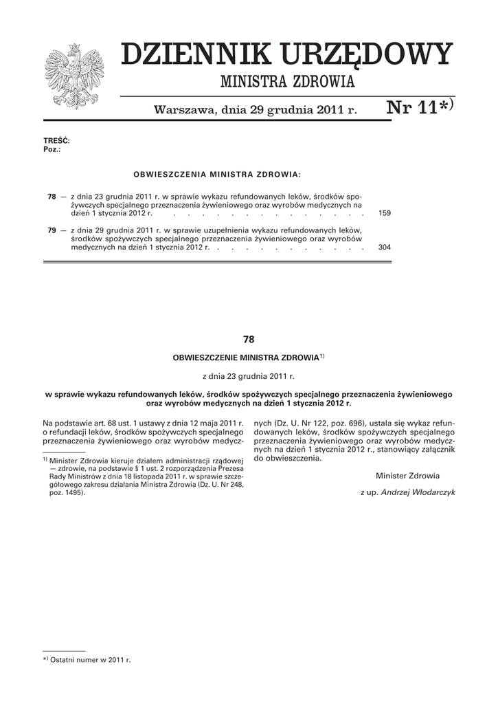 DZIENNIK URZĘDOWY MINISTRA ZDROWIA Warszawa, dnia 29 grudnia 2011 r. Nr 11*) TREŚĆ: Poz.: OBWIESZCZENIA MINISTRA ZDROWIA: 78 — z dnia 23 grudnia 2011 r. w sprawie wykazu refundowanych leków, środków spożywczych specjalnego przeznaczenia żywieniowego oraz wyrobów medycznych na dzień 1 stycznia 2012 r. . . . . . . . . . . . . . .159 79 — z dnia 29 grudnia 2011 r. w sprawie uzupełnienia wykazu refundowanych leków, środków spożywczych specjalnego przeznaczenia żywieniowego oraz wyrobów medycznych na dzień 1 stycznia 2012 r. . . . . . . . . . . .304 78 OBWIESZCZENIE MINISTRA ZDROWIA1) z dnia 23 grudnia 2011 r. w sprawie wykazu refundowanych leków, środków spożywczych specjalnego przeznaczenia żywieniowego oraz wyrobów medycznych na dzień 1 stycznia 2012 r. Na podstawie art. 68 ust. 1 ustawy z dnia 12 maja 2011 r. o refundacji leków, środków spożywczych specjalnego przeznaczenia żywieniowego oraz wyrobów medycz1) inister Zdrowia kieruje działem administracji rządowej M — zdrowie, na podstawie § 1 ust. 2 rozporządzenia Prezesa Rady Ministrów z dnia 18 listopada 2011 r. w sprawie szczegółowego zakresu działania Ministra Zdrowia (Dz. U. Nr 248, poz. 1495). *) Ostatni numer w 2011 r. nych (Dz. U. Nr 122, poz. 696), ustala się wykaz refundowanych leków, środków spożywczych specjalnego przeznaczenia żywieniowego oraz wyrobów medycznych na dzień 1 stycznia 2012 r., stanowiący załącznik do obwieszczenia. Minister Zdrowia z up. Andrzej Włodarczyk Substancja czynna Acarbosum Acarbosum Acarbosum Acebutololum Acebutololum Acenocoumarolum Aciclovirum Aciclovirum Aciclovirum Aciclovirum Aciclovirum Aciclovirum Aciclovirum Acidum alendronicum Acidum alendronicum Acidum alendronicum Acidum alendronicum Acidum alendronicum Acidum alendronicum Acidum alendronicum Acidum alendronicum Acidum alendronicum Acidum alendronicum Acidum alendronicum lp 1 2 3 4 5 6 7 8 9 10 11 12 13 14 15 16 17 18 19 20 21 22 23 24 Ostolek, tabl. powl., 70 mg 4 tabl. (blister) 6 tabl. (blister w pudełku) 4 tabl. (blister w pudełku) 5909991032517 5909991087425 5909991087418 5909991081713 5909990036653 5909990693726 5909990566297 5909990566303 5909990623112 5909990072156 5909990919017 5909990053049 5909990273317 5909990840229 5909990840113 5909990840014 5909991052218 5909991049515 5909990055715 5909990110018 5909990109920 5909990335541 5909990285419 5909990285518 2012-01-01 2012-01-01 2012-01-01 2012-01-01 2012-01-01 2012-01-01 2012-01-01 2012-01-01 2012-01-01 2012-01-01 2012-01-01 2012-01-01 2012-01-01 2012-01-01 2012-01-01 2012-01-01 2012-01-01 2012-01-01 2012-01-01 2012-01-01 2012-01-01 2012-01-01 2012-01-01 2012-01-01 2 lata 2 lata 2 lata 2 lata 2 lata 2 lata 2 lata 2 lata 2 lata 2 lata 2 lata 2 lata 2 lata 2 lata 2 lata 2 lata 2 lata 2 lata 2 lata 2 lata 2 lata 2 lata 2 lata 2 lata Okres Kod EAN lub inny Termin wejścia w obowiąkod odpowiadający życie decyzji zywania kodowi EAN decyzji 8,32 9,9 16,76 12,1 21,6 38,88 32,18 24,3 21.0, Leki przeciwzakrzepowe z grupy antagonistów witaminy K 115.2, Leki przeciwwirusowe - acyklowir postacie do stosowania doustnego 115.2, Leki przeciwwirusowe - acyklowir postacie do stosowania doustnego 115.2, Leki przeciwwirusowe - acyklowir postacie do stosowania doustnego 115.2, Leki przeciwwirusowe - acyklowir postacie do stosowania doustnego 115.2, Leki przeciwwirusowe - acyklowir postacie do stosowania doustnego 115.1, Leki przeciwwirusowe do stosowania do oczu - acyklowir 115.1, Leki przeciwwirusowe do stosowania do oczu - acyklowir 17,77 27,95 19,02 22,68 22,82 34,87 24,16 28,08 19,47 14,21 9,72 14,63 20,22 54,48 14,21 15,37 15,53 32,41 40,84 50,26 28,73 16,52 23,56 14,17 12,07 18,38 9,72 41,1 15,34 43,72 9,72 10,8 10,8 15,74 40.0, Leki beta-adrenolityczne - selektywne do stosowania doustnego 147.0, Leki stosowane w chorobach kości bisfosfoniany doustne - kwas alendronowy i ryzendronowy 147.0, Leki stosowane w chorobach kości bisfosfoniany doustne - kwas alendronowy i ryzendronowy 147.0, Leki stosowane w chorobach kości bisfosfoniany doustne - kwas alendronowy i ryzendronowy 147.0, Leki stosowane w chorobach kości bisfosfoniany doustne - kwas alendronowy i ryzendronowy 147.0, Leki stosowane w chorobach kości bisfosfoniany doustne - kwas alendronowy i ryzendronowy 147.0, Leki stosowane w chorobach kości bisfosfoniany doustne - kwas alendronowy i ryzendronowy 147.0, Leki stosowane w chorobach kości bisfosfoniany doustne - kwas alendronowy i ryzendronowy 147.0, Leki stosowane w chorobach kości bisfosfoniany doustne - kwas alendronowy i ryzendronowy 147.0, Leki stosowane w chorobach kości bisfosfoniany doustne - kwas alendronowy i ryzendronowy 147.0, Leki stosowane w chorobach kości bisfosfoniany doustne - kwas alendronowy i ryzendronowy 147.0, Leki stosowane w chorobach kości bisfosfoniany doustne - kwas alendronowy i ryzendronowy 8,36 32,94 19,38 14,52 13,93 Cena detaliczna 11,02 Urzędowa cena zbytu 40.0, Leki beta-adrenolityczne - selektywne do stosowania doustnego 17.0, Doustne leki przeciwcukrzycowe inhibitory alfaglukozydazy - akarboza 17.0, Doustne leki przeciwcukrzycowe inhibitory alfaglukozydazy - akarboza 17.0, Doustne leki przeciwcukrzycowe inhibitory alfaglukozydazy - akarboza Grupa limitowa 15,37 23,06 15,37 15,37 15,37 14,21 15,37 46,11 14,21 15,37 15,53 32,41 32,41 50,26 25,13 12,57 23,56 12,57 12,07 5,4 2,7 29,07 9,69 19,38 Wysokość limitu finansowania Osteoporoza Osteoporoza Osteoporoza Osteoporoza Osteoporoza Osteoporoza Osteoporoza Osteoporoza Osteoporoza Osteoporoza Osteoporoza We wszystkich zarejestrowanych wskazaniach na dzień wydania decyzji We wszystkich zarejestrowanych wskazaniach na dzień wydania decyzji We wszystkich zarejestrowanych wskazaniach na dzień wydania decyzji We wszystkich zarejestrowanych wskazaniach na dzień wydania decyzji We wszystkich zarejestrowanych wskazaniach na dzień wydania decyzji We wszystkich zarejestrowanych wskazaniach na dzień wydania decyzji We wszystkich zarejestro