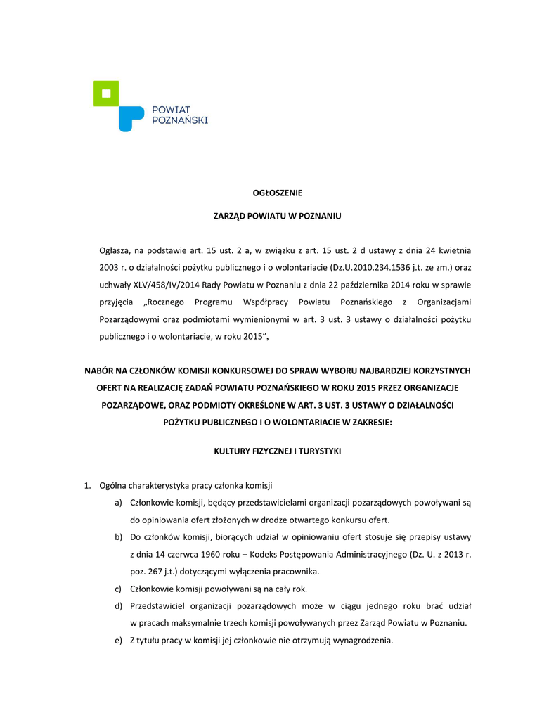 OGŁOSZENIE ZARZĄD POWIATU W POZNANIU Ogłasza, na podstawie art. 15 ust. 2 a, w związku z art. 15 ust. 2 d ustawy z dnia 24 kwietnia 2003 r. o działalności pożytku publicznego i o wolontariacie (Dz.U.2010.234.1536 j.t. ze zm.) oraz uchwały XLV/458/IV/2014 Rady Powiatu w Poznaniu z dnia 22 października 2014 roku w sprawie przyjęcia „Rocznego Programu Współpracy Powiatu Poznańskiego z Organizacjami Pozarządowymi oraz podmiotami wymienionymi w art. 3 ust. 3 ustawy o działalności pożytku publicznego i o wolontariacie, w roku 2015”, NABÓR NA CZŁONKÓW KOMISJI KONKURSOWEJ DO SPRAW WYBORU NAJBARDZIEJ KORZYSTNYCH OFERT NA REALIZACJĘ ZADAŃ POWIATU POZNAŃSKIEGO W ROKU 2015 PRZEZ ORGANIZACJE POZARZĄDOWE, ORAZ PODMIOTY OKREŚLONE W ART. 3 UST. 3 USTAWY O DZIAŁALNOŚCI POŻYTKU PUBLICZNEGO I O WOLONTARIACIE W ZAKRESIE: KULTURY FIZYCZNEJ I TURYSTYKI 1. Ogólna charakterystyka pracy członka komisji a) Członkowie komisji, będący przedstawicielami organizacji pozarządowych powoływani są do opiniowania ofert złożonych w drodze otwartego konkursu ofert. b) Do członków komisji, biorących udział w opiniowaniu ofert stosuje się przepisy ustawy z dnia 14 czerwca 1960 roku – Kodeks Postępowania Administracyjnego (Dz. U. z 2013 r. poz. 267 j.t.) dotyczącymi wyłączenia pracownika. c) Członkowie komisji powoływani są na cały rok. d) Przedstawiciel organizacji pozarządowych może w ciągu jednego roku brać udział w pracach maksymalnie trzech komisji powoływanych przez Zarząd Powiatu w Poznaniu. e) Z tytułu pracy w komisji jej członkowie nie otrzymują wynagrodzenia. 2. Wymagania kwalifikacyjne: a) doświadczenie w pracy w organizacji pozarządowej. 3. Wymagane dokumenty: a) CV kandydata na członka komisji, b) uzasadnienie wyboru kandydata opatrzone pieczątką organizacji zgłaszającej i podpisane przez upoważnionych przedstawicieli organizacji pozarządowej, c) oświadczenie kandydata na członka komisji o wyrażaniu zgody na przetwarzanie danych zawartych w przedstawionych dokumentach, zgodnie z ustawą z dnia 29 sierpnia 1997 roku o ochronie danych osobowych. 4. Termin, miejsce i tryb składania dokumentów: Wymagane dokumenty można składać osobiście lub drogą pocztową w nieprzekraczalnym terminie do dnia 8 grudnia 2014 roku do godziny 12.00 w Kancelarii Ogólnej Starostwa Powiatowego w Poznaniu, ul. Jackowskiego 18, 60-509 Poznań (pokój 002) w zamkniętej kopercie opatrzonej nazwą Wydziału Promocji i Aktywności Społecznej. Decyduje data wpływu do urzędu.