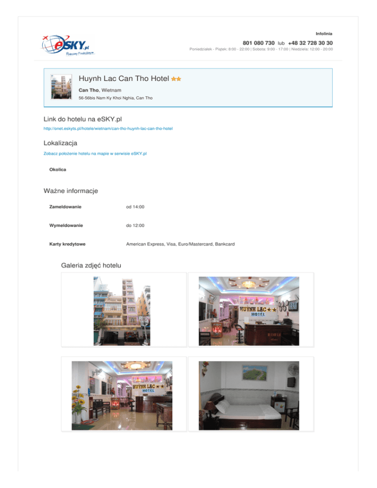 Infolinia 801 080 730 lub +48 32 728 30 30 Poniedziałek - Piątek: 8:00 - 22:00 | Sobota: 9:00 - 17:00 | Niedziela: 12:00 - 20:00 Huynh Lac Can Tho Hotel Can Tho, Wietnam 56-56bis Nam Ky Khoi Nghia, Can Tho Link do hotelu na eSKY.pl http://onet.eskyts.pl/hotele/wietnam/can-tho-huynh-lac-can-tho-hotel Lokalizacja Zobacz położenie hotelu na mapie w serwisie eSKY.pl Okolica Ważne informacje Zameldowanie od 14:00 Wymeldowanie do 12:00 Karty kredytowe American Express, Visa, Euro/Mastercard, Bankcard Galeria zdjęć hotelu Hotele – Bilety lotnicze – Tanie linie lotnicze – Ubezpieczenia Podróżne