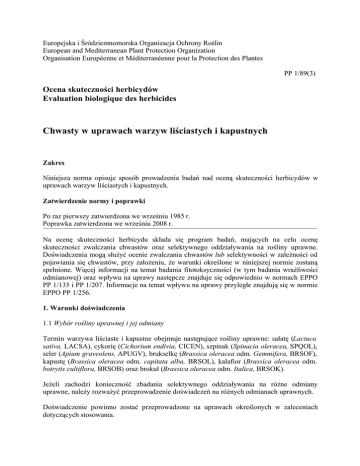 Europejska i Śródziemnomorska Organizacja Ochrony Roślin European and Mediterranean Plant Protection Organization Organisation Européenne et Méditerranéenne pour la Protection des Plantes PP 1/89(3) Ocena skuteczności herbicydów Evaluation biologique des herbicides Chwasty w uprawach warzyw liściastych i kapustnych Zakres Niniejsza norma opisuje sposób prowadzenia badań nad oceną skuteczności herbicydów w uprawach warzyw liściastych i kapustnych. Zatwierdzenie normy i poprawki Po raz pierwszy zatwierdzona we wrześniu 1985 r. Poprawka zatwierdzona we wrześniu 2008 r. Na ocenę skuteczności herbicydu składa się program badań, mających na celu ocenę skuteczności zwalczania chwastów oraz selektywnego oddziaływania na rośliny uprawne. Doświadczenia mogą służyć ocenie zwalczania chwastów lub selektywności w zależności od pojawiania się chwastów, przy założeniu, że warunki określone w niniejszej normie zostaną spełnione. Więcej informacji na temat badania fitotoksyczności (w tym badania wrażliwości odmianowej) oraz wpływu na uprawy następcze znajduje się odpowiednio w normach EPPO PP 1/135 i PP 1/207. Informacje na temat wpływu na uprawy przyległe znajdują się w normie EPPO PP 1/256. 1. Warunki doświadczenia 1.1 Wybór rośliny uprawnej i jej odmiany Termin warzywa liściaste i kapustne obejmuje następujące rośliny uprawne: sałatę (Lactuca sativa, LACSA), cykorię (Cichorium endivia, CICEN), szpinak (Spinacia oleracea, SPQOL), seler (Apium graveolens, APUGV), brukselkę (Brassica oleracea odm. Gemmifera, BRSOF), kapustę (Brassica oleracea odm. capitata alba, BRSOL), kalafior (Brassica oleracea odm. botrytis cultiflora, BRSOB) oraz brokuł (Brassica oleracea odm. Italica, BRSOK). Jeżeli zachodzi konieczność zbadania selektywnego oddziaływania na różne odmiany uprawne, należy rozważyć przeprowadzenie doświadczeń na różnych odmianach uprawnych. Doświadczenie powinno zostać przeprowadzone na uprawach określonych w zaleceniach dotyczących stosowania. 1.2 Chwasty 1.2.1 Badania dotyczące zwalczania chwastów Poletka doświadczalne powinny być porośnięte zróżnicowaną, ale jednolitą populacją chwastów charakterystycznych dla upraw warzyw liściastych i kapustnych. Populacja chwastów powinna odpowiadać zakresowi działania badanego środka (np. rośliny jednoliścienne i/lub rośliny dwuliścienne, rośliny jednoroczne i/lub wieloletnie).. 1.2.2 Badanie selektywności oddziaływania Zalecane jest maksymalne odchwaszczenie poletek doświadczalnych. Pozostałe chwasty mogą być usunięte ręcznie lub mechanicznie. Inne herbicydy można stosować tylko wówczas, gdy nie oddziałują negatywnie na warzywa liściaste i kapustne i nie ma wzajemnego oddziaływania między nimi a badanym preparatem lub preparatem porównawczym. Inne herbicydy można dodawać do zbiornika z mieszaniną tylko przy zachowaniu odpowiedniej kolejności. Dodatkowe herbicydy należy równomiernie rozprowadzać na całym badanym obszarze, w tym również na poletkach, które nie są poddawane działaniu preparatu. Takie herbicydy powinny być dobrze udokumentowane. 1.3 Warunki doświadczenia Doświadczenie powinno być przeprowadzone w warunkach polowych. Warunki uprawowe (np. typ gleby, stosowane nawozy, zabiegi uprawowe) powinny być jednakowe dla wszystkich poletek objętych doświadczeniem i dostosowane do miejscowych praktyk rolniczych. Należy odnotować wcześniejszą roślinę uprawną oraz wszelkie herbicydy stosowane podczas jej uprawy oraz w późniejszych okresach. Należy unikać miejsc, w których stosowano herbicydy znane z fitotoksycznego działania na uprawy następcze. Doświadczenie powinno być częścią serii badań prowadzonych w różnych regionach o odmiennych warunkach środowiskowych i najlepiej w różnych latach lub okresach wegetacji. Zob. Normy EPPO PP 1/181 Prowadzanie i opis badań oceniających skuteczność, w tym dobrej praktyki eksperymentalnej [Conduct and reporting of efficacy evaluation trials, including good experimental practice] i PP1/226 Liczba badań oceniających skuteczność działania [Number of efficacy trials]. 1.4 Projekt i układ doświadczenia Kombinacje doświadczenia: poletka chronione badanym(i) preparatem(i), preparatem(i) porównawczym(i) i poletko kontrolne, powinny być rozmieszczone według odpowiedniego układu statystycznego. W przypadku badań prowadzonych na roślinach wieloletnich, może zajść konieczność zastosowania nieregularnie rozmieszczonych poletek doświadczalnych, w celu objęcia badaniami oddzielnie położonych zachwaszczonych obszarów. Rozmiar poletka doświadczalnego (bez pasów ochronnych): w zależności od rodzaju badanego warzywa liściastego lub kapustnego, rozstawy rzędów, gęstości siewów/przesadzania roślin. Poletko powinno być ze wszystkich stron otoczone roślinami ochronnymi. W przypadku upraw sianych: co najmniej 5 m2. W przypadku upraw przesadzanych: co najmniej 10 m2. W przypadku roślin sianych zbiory należy przeprowadzić na całym obszarze poletka (bez pasów ochronnych). W przypadku roślin przesadzanych należy zebrać co najmniej 20 roślin, Liczba powtórzeń: co najmniej 4. W celu uzyskania dalszych informacji na temat projektu badań, w tym na temat przypadków, w których liczbę powtórzeń w przypadku badania skuteczności zwalczania chwastów można ograniczyć do 3, zob. normę EPPO PP 1/152 Planowanie i analiza badań oceniających skuteczność [Design and analysis of efficacy evaluation trials]. 2. Stosowanie zabiegów 2.1 Badany(e) preparat(y) Badany preparat powinien być konkretnym herbicydem o określonej formulacji, stosowanym zgodnie z zaleceniami (np. z adjuwantem). Zob. Norma EPPO PP 1/181 Prowadzenie i opis badań oceniających skuteczność [Conduct and reporting of efficacy evaluation trials], w tym dobrej praktyki eksperymentalnej. 2.2 Preparat(y) porównawczy(e) Preparat porównawczy powinien być środkiem, któ