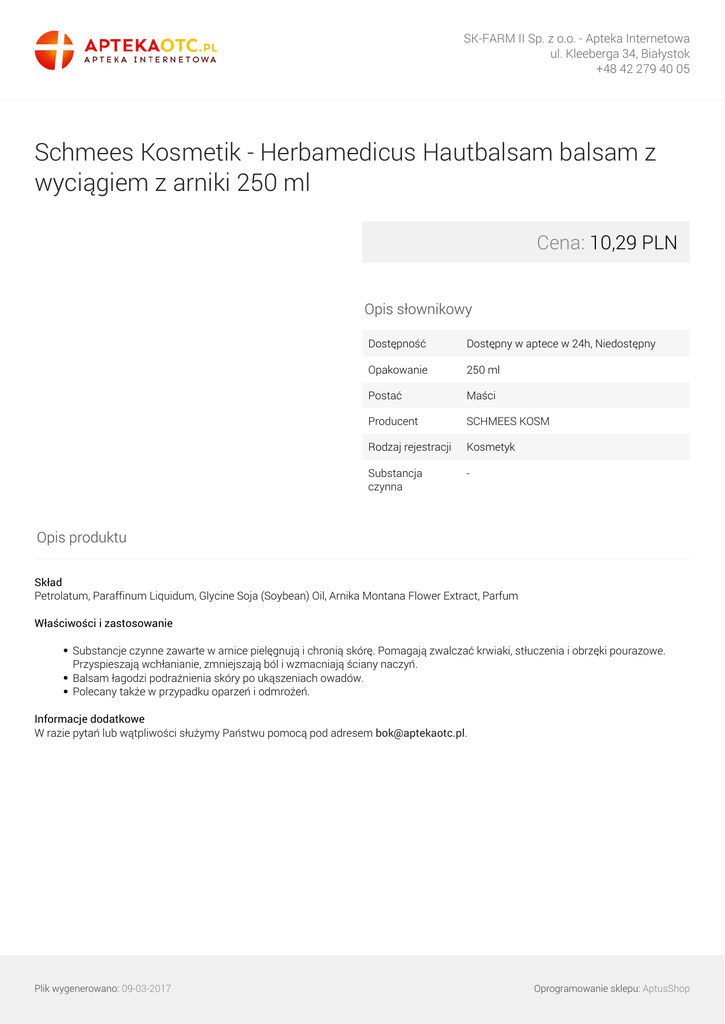SK-FARM II Sp. z o.o. - Apteka Internetowa ul. Kleeberga 34, Białystok +48 42 279 40 05 Schmees Kosmetik - Herbamedicus Hautbalsam balsam z wyciągiem z arniki 250 ml Cena: 10,29 PLN Opis słownikowy Dostępność Dostępny w aptece w 24h, Niedostępny Opakowanie 250 ml Postać Maści Producent SCHMEES KOSM Rodzaj rejestracji Kosmetyk Substancja czynna - Opis produktu Skład Petrolatum, Paraffinum Liquidum, Glycine Soja (Soybean) Oil, Arnika Montana Flower Extract, Parfum Właściwości i zastosowanie Substancje czynne zawarte w arnice pielęgnują i chronią skórę. Pomagają zwalczać krwiaki, stłuczenia i obrzęki pourazowe. Przyspieszają wchłanianie, zmniejszają ból i wzmacniają ściany naczyń. Balsam łagodzi podrażnienia skóry po ukąszeniach owadów. Polecany także w przypadku oparzeń i odmrożeń. Informacje dodatkowe W razie pytań lub wątpliwości służymy Państwu pomocą pod adresem [email protected]. Plik wygenerowano: 09-03-2017 Powered by TCPDF (www.tcpdf.org) Oprogramowanie sklepu: AptusShop