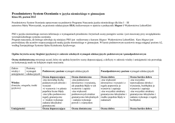 Przedmiotowy System Oceniania w języka niemieckiego w gimnazjum Klasa III, poziom III.0 Przedmiotowy System Oceniania opracowano na podstawie Programu Nauczania języka niemieckiego dla klas I – III autorstwa Marty Wawrzyniak, na poziomie edukacyjnym III.0, realizowanym w oparciu o podręcznik Magnet 3 Wydawnictwa LektorKlett PSO z języka niemieckiego zawiera informacje o wymaganiach przedmiotu i kryteriach oceny postępów ucznia i jest stosowany przy uwzględnieniu wewnątrzszkolnego systemu oceniania. Program nauczania, do którego odwołuje się niniejszy PSO jest realizowany z kursem Magnet Wydawnictwa LektorKlett. Kurs Magnet jest przewidziany dla uczniów rozpoczynających naukę języka niemieckiego w gimnazjum. W kursie podstawowym uczniowie mogą osiągnąć poziom A2, według Europejskiego Systemu Opisu Kształcenia Językowego. Ogólne kryteria oceny biegłości językowej w zakresie szkolnych wymagań edukacyjnych: podstawowym i ponadpodstawowym Ocenę niedostateczną otrzymuje uczeń, który nie spełnia kryteriów oceny dopuszczającej, a deficyty w zakresie wiedzy i umiejętności nie pozwalają na kontynuację nauki na kolejnym etapie nauczania. Zakres Poziomy wiedzy i wymagań Podstawowy poziom wymagań edukacyjnych umiejętności edukacyjnych Ocena dopuszczająca Ocena dostateczna -zna niewielką liczbę -zna podstawowe Wiedza podstawowych słówek i słownictwo i wyrażenia, (fonetyka, ortografia, środki wyrażeń ale popełnia błędy w ich językowe) -w wymowie i w piśmie wymowie i zapisie popełnia liczne błędy -zna większość -zna tylko podstawowe podstawowych struktur reguły gramatyczne gramatyczno-leksykalnych -z trudem wykonuje - zadania wykonuje zadania leksykalnopowoli i z namysłem gramatyczne Umiejętności Ocena dopuszczająca Ocena dostateczna Ponadpodstawowy poziom wymagań edukacyjnych Ocena dobra -zna większość słownictwa i wyrażeń i z reguły poprawnie je wymawia i zapisuje -zna wszystkie struktury gramatyczno-leksykalne i rzadko popełnia błędy w zadaniach Ocena bardzo dobra -zna wszystkie wprowadzone słówka i wyrażenia, bezbłędnie je wymawia i zapisuje -zna wszystkie struktury gramatyczno-leksykalne i zadania wykonuje z reguły bezbłędnie Ocena dobra Ocena bardzo dobra 1. receptywne (słuchanie/czytanie) 2. produktywne (mówienie/pisanie) -rozumie podstawowe polecenia nauczyciela i bardzo proste i krótkie teksty odsłuchowe -rozumie ogólny sens tekstów pisanych -nie potrafi lub wykonuje częściowo zadania odsłuchowe i na czytanie _____ -wypowiada się krótkimi zdaniami i frazami -wypowiada się bardzo powoli -tworzy niespójne i proste teksty pisane - niewielki zakres słownictwa i struktur ogranicza wypowiedź -błędy leksykalnogramatyczne często zakłócają komunikację -rozumie polecenia nauczyciela - potrafi częściowo wykonać bezbłędnie zadania odsłuchowe i na rozumienie tekstów pisanych -rozumie wszystkie polecenia nauczyciela i poprawnie wykonuje zadania odsłuchowe i na rozumienie tekstów pisanych -rozumie wszystkie polecenia nauczyciela i bezbłędnie wykonuje zadania odsłuchowe i na rozumienie tekstów pisanych _____ -wypowiada się dość powoli, ale dłuższymi zdaniami -tworzy bardzo proste, teksty pisane, z niewielką liczbą błędów -posiada wystarczający zasób słownictwa i struktur, żeby przekazać bardzo prostą informację -potrafi wypowiedzieć się logicznie i spójnie, choć z błędami, nie zakłócającymi ogólnego sensu wypowiedzi _____ -wypowiada się dość płynnie, odpowiednio długimi zdaniami -tworzy proste spójne teksty pisane -posiada urozmaicony zasób słownictwa, umożliwiający przekazanie prostej informacji w logiczny i spójny sposób -popełnia nieliczne błędy nie zakłócające komunikacji _____ -wypowiada się płynnie stosując poznane struktury gramatyczno-leksykalne -tworzy proste, logiczne i spójne teksty pisane, wykorzystując poznane słownictwo i struktury -nie popełnia błędów gramatycznych i leksykalnych Ocenę celującą otrzymuje uczeń, który spełnia wszystkie kryteria oceny bardzo dobrej, a także wykazuje się dodatkowymi umiejętnościami i wiedzą wykraczającą poza wymagania oceny bardzo dobrej. Uczeń bierze udział w pozalekcyjnych formach doskonalenia umiejętności i poszerzania wiedzy np. przez udział w projektach, olimpiadach językowych lub konkursach wiedzy o krajach niemieckojęzycznych. III. Zakresy tematyczne podlegające ocenie na poziomie III.0 (podstawowym) - człowiek (np. dane personalne, wygląd zewnętrzny, cechy charakteru, uczucia, emocje, zainteresowania); - dom (np. miejsce zamieszkania, opis domu, pomieszczeń domu i ich wyposażenia) - szkoła (np. przedmioty nauczania, życie szkoły); - praca (np. popularne zawody i związane z nimi czynności, miejsce pracy) - życie rodzinne i towarzyskie (np.członkowie rodziny, koledzy, przyjaciele, czynności życia codziennego, formy spędzania czasu wolnego); - żywienie (np. artykuły spożywcze, posiłki, lokale gastronomiczne); - zakupy i usługi (np. rodzaje sklepów, towary, sprzedawanie i kupowanie, korzystanie z usług); - podróżowanie i turystyka (np. środki transportu, orientacja w terenie, informacja turystyczna, zwiedzanie); - kultura (np. dziedziny kultury, uczestnictwo w kulturze); - sport (np. popularne dyscypliny sportu, sprzęt sportowy, imprezy sportowe); - zdrowie (np. samopoczucie, choroby, ich objawy i leczenie); - technika (np. korzystanie z podstawowych urządzeń technicznych); - świat przyrody (np. pogoda, rośliny i zwierzęta, krajobraz) - elementy wiedzy o krajach obszaru języka niemieckiego oraz o kraju ojczystym, z uwzględnieniem kontekstu międzykulturowego oraz tematyki integracji europejskiej IV. Struktury gramatyczne podlegające ocenie Treści gramatyczne są podstawą skutecznej komunikacji. Poniższe zestawienie struktur gramatycznych ma charakter informacyjny. Struktur gramatycznych należy używać do realizacji tych funkcj