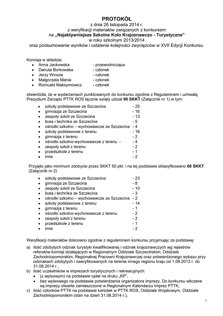 PROTOKÓŁ z dnia 26 listopada 2014 r. z weryfikacji materiałów związanych z konkursem na „Najaktywniejsze Szkolne Koło Krajoznawczo - Turystyczne” w roku szkolnym 2013/2014 oraz podsumowanie wyników i ustalenie kolejności zwycięzców w XVII Edycji Konkursu. Komisja w składzie: Anna Jackowska Danuta Borkowska Jerzy Winsze Małgorzata Mania Romuald Maksymowicz - przewodnicząca - członek - członek - członek - członek stwierdziła, że w wydarzeniach punktowanych do konkursu zgodnie z Regulaminem i uchwałą Prezydium Zarządu PTTK ROS łącznie wzięły udział 90 SKKT (Załącznik nr 1) w tym: szkoły podstawowe ze Szczecina gimnazja ze Szczecina zespoły szkół ze Szczecina licea i technika ze Szczecina ośrodki szkolno – wychowawcze ze Szczecina szkoły podstawowe z terenu gimnazja z terenu ośrodki szkolno-wychowawcze z terenu zespoły szkół z terenu przedszkole z terenu inne - 25 - 16 - 13 -5 -4 - 16 -2 -4 -2 -1 -2 Przyjęto jako minimum zdobycie przez SKKT 50 pkt. i na tej podstawie sklasyfikowano 68 SKKT (Załącznik nr 2) szkoły podstawowe ze Szczecina gimnazja ze Szczecina zespoły szkół ze Szczecina licea i technika ze Szczecina ośrodki szkolno – wychowawcze ze Szczecina szkoły podstawowe z terenu gimnazja z terenu ośrodki szkolno-wychowawcze z terenu zespoły szkół z terenu przedszkole z terenu inne - 23 -8 - 10 -3 -2 - 14 -1 -2 -2 -1 -2 Weryfikacji materiałów dokonano zgodnie z regulaminem konkursu przyjmując za podstawę: a) ilość zdobytych odznak turystyki kwalifikowanej i odznak krajoznawczych wg rejestrów referatów komisji działających w Regionalnym Oddziale Szczecińskim, Oddziale Zachodniopomorskim, Regionalnej Pracowni Krajoznawczej oraz potwierdzonego wykazu przy odznakach zdobytych i zweryfikowanych na terenie innego regionu kraju od 1.09.2013 r. do 31.08.2014 r., b) ilość uczestników w imprezach turystycznych i rekreacyjnych: (z wpisowym) na podstawie opłat na druku „KP”, bez wpisowego na podstawie potwierdzenia organizatora imprezy. Do konkursu wliczane są imprezy otwarte zamieszczone w Regionalnym Kalendarzu Imprez PTTK, c) ilość członków PTTK na podstawie kartotek w PTTK ROS, Oddziale Wojskowym, Oddziale Zachodniopomorskim (stan na dzień 31.08.2014 r.), 1 d) udział w Ogólnopolskim Młodzieżowym Turnieju Turystyczno Krajoznawczym na podstawie potwierdzenia RPK (obowiązek zakończenia eliminacji miejskich), e) ilość wykupionych zweryfikowanych odznak turystyki kwalifikowanej i krajoznawczej oraz książeczek turystyki kwalifikowanej na podstawie druku „KP”, f) ilość uzyskanych uprawnień turystyki kwalifikowanej – na podstawie dzienników szkoleń, g) udział młodzieży z SKKT w pracach organizacyjnych lub porządkowych imprez plenerowych PTTK ROS potwierdzone przez organizatora, h) materiały przedłożone przez opiekunów SKKT, i) materiały z Pałacu Młodzieży dotyczące "Leśnych Sobót", j) materiały z Oddziału Zachodniopomorskiego Polskiego Towarzystwa Schronisk Młodzieżowych, k) zorganizowanie przez SKKT lub szkołę imprezy turystycznej ogólnodostępnej zgłoszonej do Regionalnego Kalendarza Imprez PTTK lub zorganizowanej przez Szkołę (SKKT) i zamieszczonej w kronice – wycieczki, l) kronika, fotoreportaż, wydarzenie krajoznawczo-turystyczne, strona internetowa. Wykaz uzyskanych wyników stanowi załącznik nr 2 do niniejszego protokołu. W wyniku podliczenia punktów uzyskanych przez poszczególne SKKT komisja postanowiła przyznać nagrody i wyróżnienia. SZKOŁY PODSTAWOWE ZE SZCZECINA I miejsce: Puchar oraz dyplom za I miejsce otrzymuje SKKT SP 71 - 3880 pkt. Dyplom i materiały krajoznawcze dla 2 opiekunów SKKT nagrody dla 3 uczniów I miejsce: Puchar oraz dyplom za I miejsce otrzymuje SKKT SP 74 - 3872 pkt. Dyplom i materiały krajoznawcze dla 5 opiekunów SKKT nagrody dla 3 uczniów II miejsce: Puchar oraz dyplom za II miejsce otrzymuje SKKT SP 37 - 3728 pkt. Dyplom i materiały krajoznawcze dla 2 opiekunów SKKT III miejsce: Puchar oraz dyplom za III miejsce otrzymuje SKKT SP 18 -2242 pkt. Dyplom i materiały krajoznawcze dla 2 opiekunów SKKT IV miejsce: Puchar oraz dyplom za IV miejsce otrzymuje SKKT SP 42 - 1752 pkt. Dyplom i materiały krajoznawcze dla 2 opiekunów SKKT. V miejsce: Puchar oraz dyplom za V miejsce otrzymuje SKKT SP 11 - 1470 pkt. Dyplom i materiały krajoznawcze dla 4 opiekunów SKKT VI miejsce: Puchar oraz dyplom za VI miejsce otrzymuje SKKT SP ”TAK” – 1154 pkt. Dyplom i materiały krajoznawcze dla opiekuna SKKT Dyplomy za udział otrzymują SKKT z następujących szkół: miejsce 7 miejsce 8 miejsce 9 miejsce 10 miejsce 11 miejsce 12 miejsce 13 miejsce 14 miejsce 15 miejsce 16 miejsce 17 SP 7 SP 12 SP 47 SP 14 SP 55 SP 54 SP 1 SP 48 SP 41 SP 9 SP 10 - 688 pkt. - 582 pkt. - 516 pkt. - 498 pkt. - 306 pkt. - 264 pkt. - 252 pkt. - 221 pkt. - 189 pkt. - 174 pkt. - 159 pkt. 2 miejsce 18 miejsce 19 miejsce 20 miejsce 21 miejsce 22 SP 23 - 138 pkt. SP 20 - 136 pkt. SP Katolicka - 80 pkt. SP 68 - 78 pkt. SP 35 - 67 pkt. GIMNAZJA ZE SZCZECINA I miejsce: Puchar oraz dyplom za I miejsce otrzymuje SKKT Gim. 29 - 2829 pkt. Dyplom i materiały krajoznawcze dla opiekuna SKKT nagrody dla 3 uczniów II miejsce: Puchar oraz dyplom za II miejsce otrzymuje SKKT Gim. 43 - 1909 pkt. Dyplom i materiały krajoznawcze dla opiekuna SKKT III miejsce: Puchar oraz dyplom za III miejsce otrzymuje SKKT Gim. 20 - 1593 pkt. Dyplom i materiały krajoznawcze dla opiekuna SKKT IV miejsce: Puchar oraz dyplom za IV miejsce otrzymuje SKKT Gim. Katolickim – 1426 pkt. Dyplom i materiały krajoznawcze dla opiekuna SKKT. Dyplomy za udział otrzymują SKKT z następujących szkół: miejsce 5 miejsce 6 miejsce 7 miejsce 7 miejsce 8 Gim. 14 - 185 pkt. Gim. 18 - 156 pkt. Gim. 21 - 108 pkt. Gim. 12 - 108 pkt. Gim. 26 - 60 pkt. LICEA OGÓLNOKSZTAŁCĄCE I TECHNIKA ZE SZCZECINA I miejsce: Puchar oraz dyplom za I miejsce otrzymuje SKKT IV LO - 4764 pkt. Dyplom i materiały krajoznawcze dla 