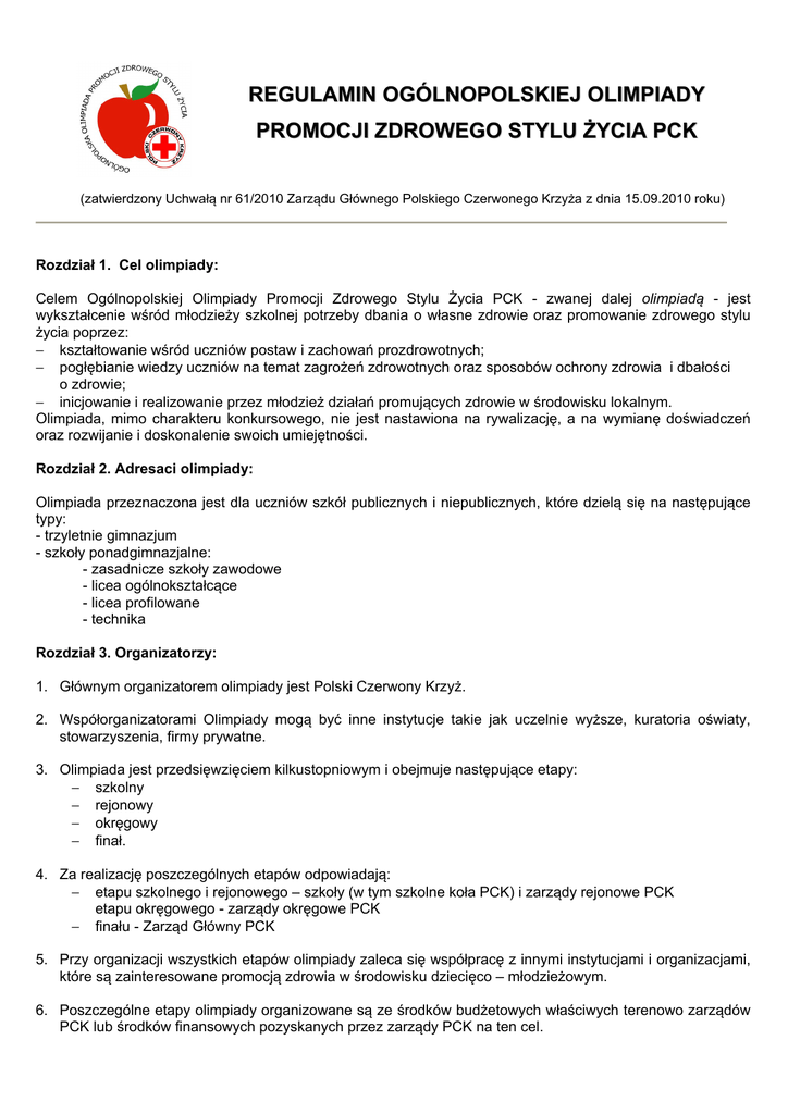 REGULAMIN OGÓLNOPOLSKIEJ OLIMPIADY PROMOCJI ZDROWEGO STYLU ŻYCIA PCK (zatwierdzony Uchwałą nr 61/2010 Zarządu Głównego Polskiego Czerwonego Krzyża z dnia 15.09.2010 roku) Rozdział 1. Cel olimpiady: Celem Ogólnopolskiej Olimpiady Promocji Zdrowego Stylu Życia PCK - zwanej dalej olimpiadą - jest wykształcenie wśród młodzieży szkolnej potrzeby dbania o własne zdrowie oraz promowanie zdrowego stylu życia poprzez: − kształtowanie wśród uczniów postaw i zachowań prozdrowotnych; − pogłębianie wiedzy uczniów na temat zagrożeń zdrowotnych oraz sposobów ochrony zdrowia i dbałości o zdrowie; − inicjowanie i realizowanie przez młodzież działań promujących zdrowie w środowisku lokalnym. Olimpiada, mimo charakteru konkursowego, nie jest nastawiona na rywalizację, a na wymianę doświadczeń oraz rozwijanie i doskonalenie swoich umiejętności. Rozdział 2. Adresaci olimpiady: Olimpiada przeznaczona jest dla uczniów szkół publicznych i niepublicznych, które dzielą się na następujące typy: - trzyletnie gimnazjum - szkoły ponadgimnazjalne: - zasadnicze szkoły zawodowe - licea ogólnokształcące - licea profilowane - technika Rozdział 3. Organizatorzy: 1. Głównym organizatorem olimpiady jest Polski Czerwony Krzyż. 2. Współorganizatorami Olimpiady mogą być inne instytucje takie jak uczelnie wyższe, kuratoria oświaty, stowarzyszenia, firmy prywatne. 3. Olimpiada jest przedsięwzięciem kilkustopniowym i obejmuje następujące etapy: − szkolny − rejonowy − okręgowy − finał. 4. Za realizację poszczególnych etapów odpowiadają: − etapu szkolnego i rejonowego – szkoły (w tym szkolne koła PCK) i zarządy rejonowe PCK etapu okręgowego - zarządy okręgowe PCK − finału - Zarząd Główny PCK 5. Przy organizacji wszystkich etapów olimpiady zaleca się współpracę z innymi instytucjami i organizacjami, które są zainteresowane promocją zdrowia w środowisku dziecięco – młodzieżowym. 6. Poszczególne etapy olimpiady organizowane są ze środków budżetowych właściwych terenowo zarządów PCK lub środków finansowych pozyskanych przez zarządy PCK na ten cel. Rozdział 4. Założenia organizacyjne: 1. Decyzje o rozpoczęciu organizacji Olimpiady w danym roku szkolnym oraz o ramowych terminach poszczególnych etapów podejmuje i podaje do wiadomości, najpóźniej do końca września danego roku szkolnego, Zarząd Główny Polskiego Czerwonego Krzyża. 2. Olimpiada rozpoczyna się w październiku, a kończy w czerwcu, w trakcie jednego roku szkolnego. 3. Nad przebiegiem olimpiady czuwa Komitet Główny Olimpiady powoływany przez Zarząd Główny PCK. 4. Ogólnopolska Olimpiada Promocji Zdrowego Stylu Życia PCK może być organizowana na terenie poszczególnych okręgów PCK dla uczniów gimnazjów, szkół ponadgimnazjalnych, bądź równocześnie dla młodzieży z obu kategorii szkół. Uczestnicy startują w jednej z dwóch kategorii wiekowych: gimnazjalnej lub ponadgimnazjalnej. 5. Miejsce organizacji olimpiady ustalają: − dla etapów szkolnych – zarządy rejonowe PCK. Etap szkolny olimpiady odbywa się najpóźniej do końca października danego roku szkolnego. − dla etapów rejonowych – ustalają zarządy rejonowe PCK. Etap rejonowy olimpiady odbywa się najpóźniej do końca grudnia danego roku szkolnego. − dla etapów okręgowych – ustalają zarządy okręgowe PCK. Etap okręgowy olimpiady odbywa się najpóźniej do końca marca danego roku szkolnego. − dla finału – ustala i podaje do wiadomości, najpóźniej do końca kwietnia danego roku szkolnego, Zarząd Główny PCK. Etap centralny (finał) olimpiady odbywa się najpóźniej do końca pierwszej połowy czerwca danego roku szkolnego. 6. Terminy poszczególnych etapów olimpiady ustala i podaje do wiadomości Zarząd Główny PCK. 7. Podczas olimpiady sprawdzana jest wiedza i umiejętności uczestników z zakresu istniejących zagrożeń zdrowotnych, sposobów ochrony zdrowia, ochrony środowiska oraz zasad zdrowego stylu życia, a w szczególności: − zasad higieny osobistej i otoczenia ze szczególnym uwzględnieniem zdrowia i higieny jamy ustnej; − zasad zdrowego żywienia; − znaczenia aktywności ruchowej dla zdrowia człowieka; − prawidłowego rozkładu dnia ucznia i odpowiednich form wypoczynku; − problematyki ochrony środowiska naturalnego; − profilaktyki uzależnień (od nikotyny, alkoholu i narkotyków); − zapobiegania chorobom zakaźnym (szczególnie HIV/AIDS) i cywilizacyjnym; − zapobiegania urazom i wypadkom (w domu, szkole oraz w drodze); − zasad udzielania pierwszej pomocy; − podstawowych wiadomości o ruchu czerwonokrzyskim. 8. Komitet Główny Olimpiady może ustalić temat przewodni Olimpiady i obowiązuje on na wszystkich etapach w danym roku szkolnym. 9. Zasady organizacji etapu szkolnego olimpiady. Podczas etapu szkolnego zadaniem uczestników jest rozwiązanie testu składającego się z 20 pytań testowych (zarówno z jedną poprawną odpowiedzią, jak i pytań o charakterze „prawda-fałsz”). Jeżeli więcej niż jedna osoba uzyska taką samą ilość punktów należy przeprowadzić dogrywkę między tymi osobami. Za przygotowanie pytań dogrywki odpowiada nauczyciel organizujący etap szkolny olimpiady lub przedstawiciel Zarządu Rejonowego PCK. Protokół z przebiegu etapu rejonowego Olimpiady należy dostarczyć do biura Zarządu Rejonowego PCK w terminie określonym stosownym pismem, wzór protokołu stanowi załącznik nr 1. 2 10. Zasady organizacji etapu rejonowego olimpiady. Etap rejonowy obejmuje: − test składający się z 30 pytań testowych (zarówno z jedną poprawną odpowiedzią, jak i pytań o charakterze „prawda-fałsz”); Jeżeli więcej niż jedna osoba uzyska taką samą ilość punktów należy przeprowadzić dogrywkę między tymi osobami. Za przygotowanie pytań dogrywki odpowiada Zarząd Rejonowy PCK. Protokół z przebiegu etapu rejonowego Olimpiady należy dos