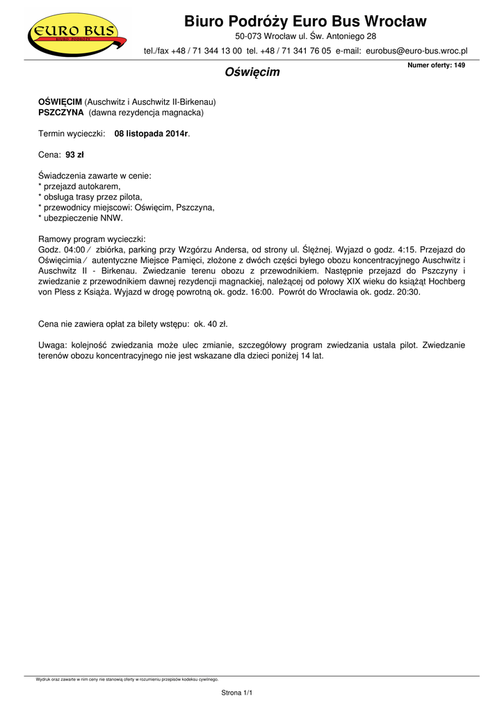 Biuro Podróży Euro Bus Wrocław 50-073 Wrocław ul. Św. Antoniego 28 tel./fax +48 / 71 344 13 00 tel. +48 / 71 341 76 05 e-mail: [email protected] Oświęcim Numer oferty: 149 OŚWIĘCIM (Auschwitz i Auschwitz II-Birkenau) PSZCZYNA (dawna rezydencja magnacka) Termin wycieczki: 08 listopada 2014r. Cena: 93 zł Świadczenia zawarte w cenie: * przejazd autokarem, * obsługa trasy przez pilota, * przewodnicy miejscowi: Oświęcim, Pszczyna, * ubezpieczenie NNW. Ramowy program wycieczki: Godz. 04:00 – zbiórka, parking przy Wzgórzu Andersa, od strony ul. Ślężnej. Wyjazd o godz. 4:15. Przejazd do Oświęcimia – autentyczne Miejsce Pamięci, złożone z dwóch części byłego obozu koncentracyjnego Auschwitz i Auschwitz II - Birkenau. Zwiedzanie terenu obozu z przewodnikiem. Następnie przejazd do Pszczyny i zwiedzanie z przewodnikiem dawnej rezydencji magnackiej, należącej od połowy XIX wieku do książąt Hochberg von Pless z Książa. Wyjazd w drogę powrotną ok. godz. 16:00. Powrót do Wrocławia ok. godz. 20:30. Cena nie zawiera opłat za bilety wstępu: ok. 40 zł. Uwaga: kolejność zwiedzania może ulec zmianie, szczegółowy program zwiedzania ustala pilot. Zwiedzanie terenów obozu koncentracyjnego nie jest wskazane dla dzieci poniżej 14 lat. Wydruk oraz zawarte w nim ceny nie stanowią oferty w rozumieniu przepisów kodeksu cywilnego. Strona 1/1