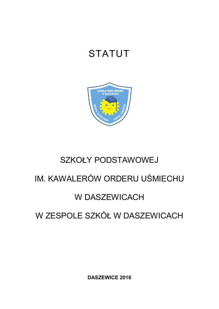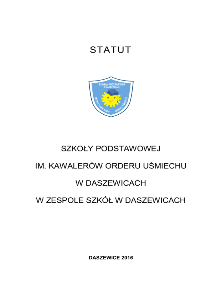 STATUT SZKOŁY PODSTAWOWEJ IM. KAWALERÓW ORDERU UŚMIECHU W DASZEWICACH W ZESPOLE SZKÓŁ W DASZEWICACH DASZEWICE 2016 Szkoła Podstawowa im. Kawalerów Orderu Uśmiechu w Daszewicach Statut Strona 2 z 61 SPIS TREŚCI Rozdział I PODSTAWOWE INFORMACJE O SZKOLE ................................................ 3 Rozdział II CELE I ZADANIA SZKOŁY ............................................................................ 6 Rozdział III ORGANY SZKOŁY I ICH ZADANIA ............................................................ 11 Rozdział IV ORGANIZACJA SZKOŁY ............................................................................ 22 Rozdział V ORGANIZACJA NAUCZANIA, WYCHOWANIA I OPIEKI DLA UCZNIÓW NIEPEŁNOSPRAWNYCH I NIEDOSTOSOWANYCH SPOŁECZNIE ......... 32 Rozdział VI NAUCZYCIELE I INNI PRACOWNICY SZKOŁY ......................................... 38 Rozdział VII UCZNIOWIE SZKOŁY ................................................................................. 47 Rozdział VIII TRADYCJA SZKOLNA ................................................................................ 60 Rozdział IX POSTANOWIENIA KOŃCOWE................................................................... 61 ZAŁĄCZNIKI NR 1 SZKOLNY SYSTEM OCENIANIA Szkoła Podstawowa im. Kawalerów Orderu Uśmiechu w Daszewicach Statut Strona 3 z 61 Statut Szkoły Podstawowej im. Kawalerów Orderu Uśmiechu w Daszewicach opracowano w oparciu o zapisy Ustawy o systemie oświaty z dnia 7 września 1991 r. (tekst jednolity Dz.U. z 2015 r., poz. 2156 ze zm. ), Rozporządzenie Ministra Edukacji Narodowej z dnia 21 maja 2001 r. w sprawie ramowych statutów publicznego przedszkola oraz publicznych szkół, Konwencję o Prawach Dziecka z dnia 20 listopada 1989 r. Pod określeniem Szkoła należy rozumieć Szkołę Podstawową im. Kawalerów Orderu Uśmiechu w Daszewicach w Zespole Szkół w Daszewicach. Obowiązkiem Szkoły jest zapewnienie niezbędnych warunków umożliwiających pełną realizację postanowień niniejszego Statutu. . Rozdział I PODSTAWOWE INFORMACJE O SZKOLE § 1. Nazwa Szkoły: Zespół Szkół w Daszewicach, Szkoła Podstawowa im. Kawalerów Orderu Uśmiechu w Daszewicach. Typ szkoły: sześcioletnia szkoła podstawowa. Nazwa szkoły jest używana w pełnym brzmieniu. § 2. Siedzibą Szkoły jest budynek przy ul. Szkolnej 16, 61 - 160 Daszewice. § 3. Szkoła jest szkołą publiczną w rozumieniu art.7 Ustawy o systemie z dnia 7 września 1991r. § 4. oświaty Szkoła Podstawowa im. Kawalerów Orderu Uśmiechu w Daszewicach Statut Strona 4 z 61 Organem prowadzącym Szkołę jest Gmina Mosina. § 5. Organem prowadzącym nadzór pedagogiczny nad Szkołą jest Wielkopolski Kurator Oświaty. § 6. Cykl kształcenia trwa 6 lat. § 7. Szkoła może prowadzić - w zależności od specjalnych potrzeb edukacyjnych uczniów klasy specjalne, integracyjne, terapeutyczne lub wyrównawcze, po uzyskaniu zgody organu prowadzącego Szkołę, stosując odpowiednie w tym zakresie przepisy. § 8. W Szkole może być prowadzona przez organizacje i stowarzyszenia wspomagające proces nauczania i wychowania dzieci działalność opiekuńczo-wychowawcza w formie świetlic za zgodą organu prowadzącego Szkołę i po zapewnieniu przez tę organizacje niezbędnych środków rzeczowych i finansowych. Podjęcie przez stowarzyszenie lub inną organizację działalności wymaga uzyskania zgody Dyrektora, wyrażonej po uprzednim uzgodnieniu warunków tej działalności oraz po uzyskaniu pozytywnej opinii Rady Rodziców. § 9. Szkoła może prowadzić w czasie wolnym od nauki placówkę wypoczynku dla dzieci i młodzieży po uzyskaniu zgody organu prowadzącego Szkołę zgodnie z odrębnymi przepisami. § 10. Szkoła może prowadzić kursy i szkolenia dla uczniów i osób dorosłych jako pozaszkolną formę nauczania zgodnie z odrębnymi przepisami. Szkoła Podstawowa im. Kawalerów Orderu Uśmiechu w Daszewicach Statut Strona 5 z 61 § 11. W budynku Zespołu Szkół znajdują się: 1) Szkoła Podstawowa im. Kawalerów Orderu Uśmiechu w Daszewicach, 2) Gimnazjum im. Orła Białego w Daszewicach, 3) Filia Biblioteki Publicznej w Mosinie, 4) Oddział przedszkolny, 5) Biblioteka szkolna, 6) Świetlica opiekuńczo-wychowawcza, 7) Świetlica szkolna. Szkoła Podstawowa im. Kawalerów Orderu Uśmiechu w Daszewicach Statut Rozdział II Strona 6 z 61 CELE I ZADANIA SZKOŁY § 12. Szkoła realizuje cele i zadania określone w ustawie o systemie oświaty z dnia 7 września 1991 r. (tekst jednolity - Dz.U. z 2015 r., poz. 2156 ze zm. ) oraz przepisach wydanych na jej podstawie. W szczególności zapewnia uczniom pełen rozwój umysłowy, moralny, emocjonalny i fizyczny w zgodzie z ich potrzebami i możliwościami psychofizycznymi, w warunkach poszanowania ich godności osobistej oraz wolności światopoglądowej i wyznaniowej. W realizacji tego zadania szkoła respektuje zasady nauk pedagogicznych, przepisy prawa, a także zobowiązania, wynikające z Powszechnej Deklaracji Praw Człowieka ONZ, Deklaracji Praw Dziecka ONZ oraz Konwencji o Prawach Dziecka. § 13. Szkoła umożliwia uczniom realizację obowiązku szkolnego, a dzieciom 6-letnim realizację rocznego obowiązkowego przygotowania przedszkolnego oraz kontroluje ich spełnianie. § 14. Szkoła umożliwia uczniom zdobycie wiedzy i umiejętności niezbędnych do uzyskania świadectwa ukończenia szkoły; umożliwia rozwój ich talentów i zainteresowań poznawczych, społecznych, artystycznych i sportowych. § 15. Szkoła umożliwia absolwentom kształtowanie świadomego wyboru dalszego kierunku kształcenia. § 16. Szkoła umożliwia uczniom podtrzymanie poczucia tożsamości narodowej, językowej i religijnej, a w szczególności nauki języka polskiego oraz własnej historii i kultury. § 17. Rodzice kierują swoje dzieci na naukę religii w momencie podjęcia przez nie nauki Szkoła Podstawowa im. Kawalerów Orderu Uśmiechu w Daszewicach Statut Strona 7 z 61 w Szkole. Dla uczniów 