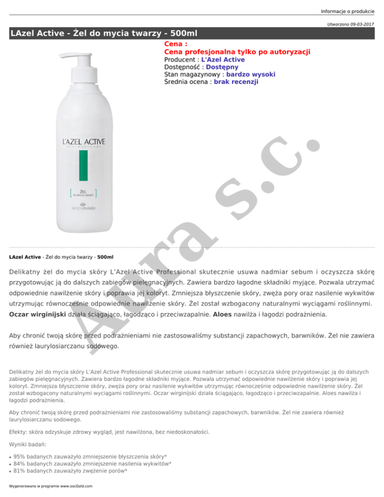 Informacje o produkcie Utworzono 09-03-2017 LAzel Active - Żel do mycia twarzy - 500ml Cena : Cena profesjonalna tylko po autoryzacji Au r LAzel Active - Żel do mycia twarzy - 500ml a s. c. Producent : L'Azel Active Dostępność : Dostępny Stan magazynowy : bardzo wysoki Średnia ocena : brak recenzji Delikatny żel do mycia skóry L’Azel Active Professional skutecznie usuwa nadmiar sebum i oczyszcza skórę przygotowując ją do dalszych zabiegów pielęgnacyjnych. Zawiera bardzo łagodne składniki myjące. Pozwala utrzymać odpowiednie nawilżenie skóry i poprawia jej koloryt. Zmniejsza błyszczenie skóry, zwęża pory oraz nasilenie wykwitów utrzymując równocześnie odpowiednie nawilżenie skóry. Żel został wzbogacony naturalnymi wyciągami roślinnymi. Oczar wirginijski działa ściągająco, łagodząco i przeciwzapalnie. Aloes nawilża i łagodzi podrażnienia. Aby chronić twoją skórę przed podrażnieniami nie zastosowaliśmy substancji zapachowych, barwników. Żel nie zawiera również laurylosiarczanu sodowego. Delikatny żel do mycia skóry L’Azel Active Professional skutecznie usuwa nadmiar sebum i oczyszcza skórę przygotowując ją do dalszych zabiegów pielęgnacyjnych. Zawiera bardzo łagodne składniki myjące. Pozwala utrzymać odpowiednie nawilżenie skóry i poprawia jej koloryt. Zmniejsza błyszczenie skóry, zwęża pory oraz nasilenie wykwitów utrzymując równocześnie odpowiednie nawilżenie skóry. Żel został wzbogacony naturalnymi wyciągami roślinnymi. Oczar wirginijski działa ściągająco, łagodząco i przeciwzapalnie. Aloes nawilża i łagodzi podrażnienia. Aby chronić twoją skórę przed podrażnieniami nie zastosowaliśmy substancji zapachowych, barwników. Żel nie zawiera również laurylosiarczanu sodowego. Efekty: skóra odzyskuje zdrowy wygląd, jest nawilżona, bez niedoskonałości. Wyniki badań: ● ● ● 95% badanych zauważyło zmniejszenie błyszczenia skóry* 84% badanych zauważyło zmniejszenie nasilenia wykwitów* 81% badanych zauważyło zwężenie porów* Wygenerowano w programie www.oscGold.com ● 94% badanych zauważyło poprawę kolorytu skóry* * Samoocena po 4 tygodniach stosowania Sposób użycia: Codziennie rano i wieczorem nałożyć równomiernie na wilgotną twarz i szyję, rozprowadzić kolistymi ruchami. Następnie spłukać letnią wodą. Au r a s. c. Dla osiągnięcia optymalnych efektów kuracji zaleca się stosowanie łączne z kremem przeciwtrądzikowym oraz płynem do pielęgnacji skóry L’Azel Active Professional.