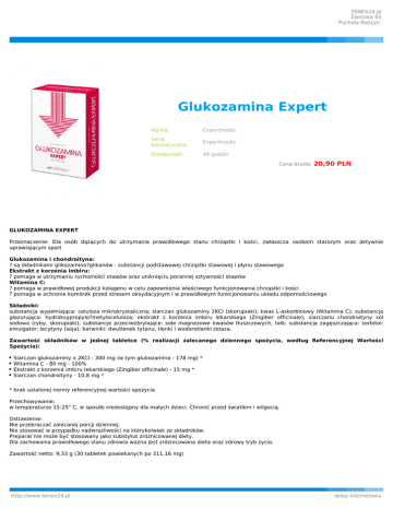 TENEX24.pl Żwirowa 65 Puchały-Raszyn Glukozamina Expert Marka: Expertmedic Seria kosmetyczna: Expertmedic Dostępność: 48 godzin Cena brutto: 20,90 PLN GLUKOZAMINA EXPERT Przeznaczenie: Dla osób dążących do utrzymania prawidłowego stanu chrząstki i kości, zwłaszcza osobom starszym oraz aktywnie uprawiającym sport Glukozamina i chondroityna: ? są składnikami glikozamino?glikanów - substancji podstawowej chrząstki stawowej i płynu stawowego Ekstrakt z korzenia imbiru: ? pomaga w utrzymaniu ruchomości stawów oraz uniknięciu porannej sztywności stawów Witamina C: ? pomaga w prawidłowej produkcji kolagenu w celu zapewnienia właściwego funkcjonowania chrząstki i kości ? pomaga w ochronie komórek przed stresem oksydacyjnym i w prawidłowym funkcjonowaniu układu odpornościowego Składniki: substancja wypełniająca: celuloza mikrokrystaliczna; siarczan glukozaminy 2KCl (skorupiaki); kwas L-askorbinowy (Witamina C); substancja glazurująca: hydroksypropylo?metyloceluloza; ekstrakt z korzenia imbiru lekarskiego (Zingiber officinale); siarczanu chondroityny sól sodowa (ryby, skorupiaki); substancje przeciwzbrylające: sole magnezowe kwasów tłuszczowych, talk; substancja zagęszczająca: sorbitol; emulgator: lecytyny (soja); barwniki: dwutlenek tytanu, tlenki i wodorotlenki żelaza. Zawartość składników w jednej tabletce (% realizacji zalecanego dziennego spożycia, według Referencyjnej Wartości Spożycia): Siarczan glukozaminy x 2KCI - 300 mg (w tym glukozamina - 178 mg) * Witamina C - 80 mg - 100% Ekstrakt z korzenia imbiru lekarskiego (Zingiber officinale) - 15 mg * Siarczan chondroityny - 10,8 mg * * brak ustalonej normy referencyjnej wartości spożycia Przechowywanie: w temperaturze 15-25° C, w sposób niedostępny dla małych dzieci. Chronić przed światłem i wilgocią. Ostrzeżenie: Nie przekraczać zalecanej porcji dziennej. Nie stosować w przypadku nadwrażliwości na którykolwiek ze składników. Preparat nie może być stosowany jako substytut zróżnicowanej diety. Dla zachowania prawidłowego stanu zdrowia ważna jest zróżnicowana dieta oraz zdrowy tryb życia. Zawartość netto: 9,33 g (30 tabletek powlekanych po 311,16 mg) http://www.tenex24.pl sklep internetowy
