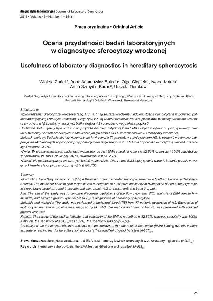 diagnostyka laboratoryjna Journal of Laboratory Diagnostics 2012 • Volume 48 • Number 1 • 25-31 Praca oryginalna • Original Article Ocena przydatności badań laboratoryjnych w diagnostyce sferocytozy wrodzonej Usefulness of laboratory diagnostics in hereditary spherocytosis Wioleta Żarlak1, Anna Adamowicz-Salach2, Olga Ciepiela1, Iwona Kotuła1, Anna Szmydki-Baran2, Urszula Demkow1 1 Zakład Diagnostyki Laboratoryjnej i Immunologii Klinicznej Wieku Rozwojowego, Warszawski Uniwersytet Medyczny, 2Katedra i Klinika Pediatrii, Hematologii i Onkologii, Warszawski Uniwersytet Medyczny Streszczenie Wprowadzenie: Sferocytoza wrodzona (ang. HS) jest najczęstszą wrodzoną niedokrwistością hemolityczną w populacji północnoeuropejskiej i Ameryce Północnej. Przyczyną HS są zaburzenia ilościowe i/lub jakościowe białek cytoszkieletu krwinek czerwonych: α i β spektryny, ankyryny, białka prążka 4.2 i przezbłonowego białka prążka 3. Cel badań: Celem pracy było porównanie przydatności diagnostycznej testu EMA z użyciem cytometru przepływowego oraz testu hemolizy krwinek czerwonych w zakwaszonym glicerolu AGLT50w rozpoznawaniu sferocytozy wrodzonej. Materiał i metody: Badania zostały wykonane we krwi pełnej u 77 pacjentów z podejrzeniem HS. U pacjentów oceniano ekspresję białek błonowych erytrocytów przy pomocy cytometrycznego testu EMA oraz oporność osmotyczną krwinek czerwonych testem AGLT50. Wyniki: W przeprowadzonych badaniach wykazano, że test EMA charakteryzuje się 92,86% czułością i 100% swoistością w porównaniu ze 100% czułością i 66,6% swoistością testu AGLT50. Wnioski: Na podstawie przeprowadzonych badań można stwierdzić, że test EMA lepiej spełnia warunki badania przesiewowego w kierunku sferocytozy wrodzonej niż test AGLT50. Summary Introduction: Hereditary spherocytosis (HS) is the most common inherited hemolytic anaemia in Northern Europe and Northern America. The molecular basis of spherocytosis is a quantitative or qualitative deficiency or dysfunction of one of the erythrocyte’s membrane proteins: α and β spectrin, ankyrin, protein 4.2 or transmembrane band 3 protein. Aim: The aim of the study was to compare diagnostic usefulness of the flow cytometric (FC) analysis of EMA (eosin-5-maleimide) and acidified glycerol lysis test (AGLT50) in diagnostics of hereditary spherocytosis. Materials and methods: The study was performed in peripheral blood (PB) from 77 patients suspected of HS. Expression of erythrocytes membrane proteins was analyzed by FC EMA dye method and osmotic fragility was measured with acidified glycerol lysis test. Results: The results of the studies indicate, that sensitivity of the EMA dye method is 92,86%, whereas specificity was 100%. Although, the sensitivity of AGLT50 was 100%, the specificity was only 66,6%. Conclusions: On the basis of obtained results it can be concluded, that the eosin-5-maleimide (EMA) binding dye test is more accurate screening test for hereditary spherocytosis than acidified glycerol lysis test (AGLT50). Słowa kluczowe:sferocytoza wrodzona, test EMA, test hemolizy krwinek czerwonych w zakwaszonym glicerolu (AGLT50) Key words:hereditary spherocytosis, the EMA test, acidified glycerol lysis test (AGLT50) 25