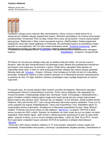 Kupony rabatowe Wpisany przez Jaro wtorek, 25 czerwca 2013 13:21 Uwielbiam zakupy przez internet. Bez wychodzenia z domu można o wiele taniej niż w stacjonarnym sklepie zakupić wypatrzone towary. Wirtualni sprzedawcy nie muszą utrzymywać przysłowiowej "znudzonej" Pani za ladą. Dzieki temu ceny są korzystne i można zaoszczędzić parę groszy. Większości z Was znane są pewnie kupony z McDonaldsa. Kiedyś papierowe książeczki, teraz jest nawet aplikacja na Androida. Na zachodzie kupony to prawdziwa moda i sposób na oszczędności. Na TLC jest nawet emitowany serial "Extreme Couponing" gdzie bohaterowie za pełen kosz towarów zapłacić kilka dolarów! Powstała teżpotrafią europejska strona Cuponation oraz jej jedynie amerykańskie odpowiedniki oferujące kupony: RetailMeNot , Coupons i CouponCode. W Polsce nie ma jeszcze takiego szału jak za wielką wodą ale widać, że coś się rusza w temacie. Jako fan gier komputerowych od pewnego czasu śledzę fora poświęcone wirtualnym promocjom oraz kuponom na stronach z grami. Dzięki temu zakupiłem kilka tytułów za naprawdę niską cenę. U Nas na razie dużą popularność zdobyły tak zwane zakupy grupowe. Serwisy takie jak Groupon , Gruper, InGroup i inne istnieją już od kilku lat ale ich czas jakby przemijał. Znalezione kupony w sieci ostatnio obniżyły mi o kilkanaście procent ubezpieczenie w podróży do Azji. Do tego niektóre markety od jakiegoś czasu wydają książeczki ze swoimi kuponami. Przyszedł czas, że muszę zakupić kilka nowych ciuchów do biegania. Naturalnie zacząłem przekopywać internet w poszukiwaniu promocji. Znam rzeczy biegowe i tak naprawdę nie muszę korzystać z tradycyjnego sklepu aby "pomacać" towar. Korzystając z doświadczenia z grami chciałem znaleźć miejsca gdzie mogę tanio kupić sprzęt ale przy okazji wykorzystać jakieś kupony aby obniżyć cenę. Okazuje się, że drgnęło i w tym temacie. Szlak przetarł serwis Hotprice, który pod koniec 2011 roku zaczął oferować darmowe kupony rabatowe. Teraz już na rynku pojawiło się więcej: KodyRabatowe, Tanio oraz KuponKing i inne. Natrafiłem także na nową polską stronę Cuponation. Działają oni w kilkunastu państwach Europy, Rosji, Brazyli i Indiach. Przykuła mój wzrok oferta na rejs statkiem StenaLine za jedyne 149 PLN w dwie strony na dwa dni (50% zniżki). Szkoda, że chwilowo nie mam czasu bo już raz byłem na takim wyjeździe i było bardzo fajnie. Jeśli chodzi o ofertę kuponów sportowych to jest na razie dość słabo - jedynie 3 oferty, za to w innych działach jest lepiej - zniżki do C&A, Euro RTV i innych. Na Cuponation znalazłem kupon wartości 40 PLN do wydania w sklepie internetowym Zalando . Dużo się o Nim słyszy ostatnio (reklamy w TV oraz prasie), koleżanki z pracy nawet coś zamawiały. Postanowiłem skorzystać z promocji i przetestować obydwa serwisy. Zamówienie w 1/2 Kupony rabatowe Wpisany przez Jaro wtorek, 25 czerwca 2013 13:21 Zalando zrobiłem dzisiaj więc się dopiero okaże jak działa ale kupon z Cuponation przyjęty i 40 PLN zostało w kieszeni. 2/2