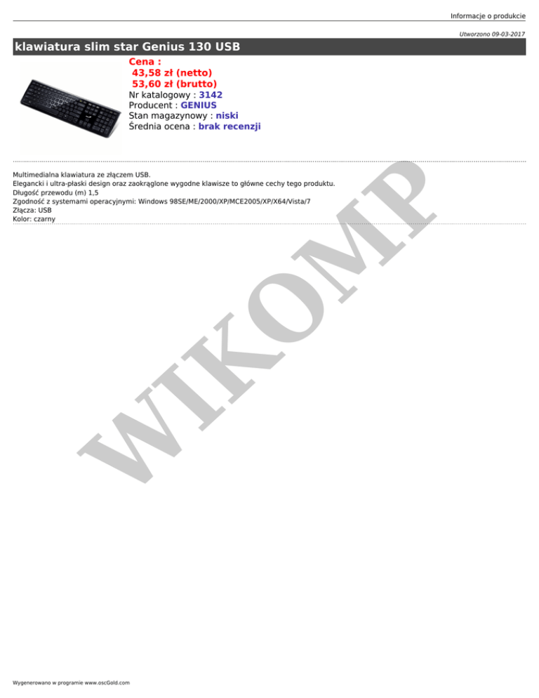 Informacje o produkcie Utworzono 09-03-2017 klawiatura slim star Genius 130 USB Cena : 43,58 zł (netto) 53,60 zł (brutto) Nr katalogowy : 3142 Producent : GENIUS Stan magazynowy : niski Średnia ocena : brak recenzji W IK O M P Multimedialna klawiatura ze złączem USB. Elegancki i ultra-płaski design oraz zaokrąglone wygodne klawisze to główne cechy tego produktu. Długość przewodu (m) 1,5 Zgodność z systemami operacyjnymi: Windows 98SE/ME/2000/XP/MCE2005/XP/X64/Vista/7 Złącza: USB Kolor: czarny Wygenerowano w programie www.oscGold.com