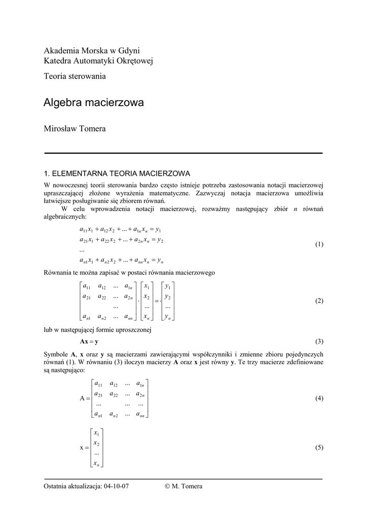 Akademia Morska w Gdyni Katedra Automatyki Okrętowej Teoria sterowania Algebra macierzowa Mirosław Tomera 1. ELEMENTARNA TEORIA MACIERZOWA W nowoczesnej teorii sterowania bardzo często istnieje potrzeba zastosowania notacji macierzowej upraszczającej złożone wyrażenia matematyczne. Zazwyczaj notacja macierzowa umożliwia łatwiejsze posługiwanie się zbiorem równań. W celu wprowadzenia notacji macierzowej, rozważmy następujący zbiór n równań algebraicznych: a11 x1 + a12 x 2 + ... + a1n x n = y1 a 21 x1 + a 22 x 2 + ... + a 2 n x n = y 2 (1) ... a n1 x1 + a n 2 x 2 + ... + a nn x n = y n Równania te można zapisać w postaci równania macierzowego a11 a 21 a n1 a12 a 22 an2 ... a1n x1 y1 ... a 2 n x 2 y 2 ⋅ =⋅ ... ... ... ... a nn x n y n (2) lub w następującej formie uproszczonej Ax = y (3) Symbole A, x oraz y są macierzami zawierającymi współczynniki i zmienne zbioru pojedynczych równań (1). W równaniu (3) iloczyn macierzy A oraz x jest równy y. Te trzy macierze zdefiniowane są następująco: a11 a 21 A= ... a n1 a12 a 22 an2 ... a1n ... a 2 n ... ... ... a nn (4) x1 x 2 x= ... xn Ostatnia aktualizacja: 04-10-07 (5) M. Tomera Teoria sterowania Algebra macierzowa y1 y 2 y= ... yn (6) 1.1. DEFINICJE MACIERZY Macierz jest zbiorem (kolekcją) elementów uporządkowanych w tablicę prostokątną lub kwadratową. Nawiasy kwadratowe, takie jak te z równań (2), (4), (5), (6) używane są do oznaczania macierzy. Ważne jest rozróżnienie pomiędzy macierzą i wyznacznikiem. Poniżej zebrane zostały podstawowe własności macierzy i wyznacznika. MACIERZ WYZNACZNIK ♦ Tablica pewnej liczby elementów zawartych w n wierszach i m kolumnach ♦ Tablica pewnej liczby elementów zawartych w n wierszach i n kolumnach (zawsze kwadratowa) ♦ Nie posiada pojedynczej wartości, nawet gdy jest kwadratowa. ♦ Ma pojedynczą wartość. Elementy macierzy. Kiedy macierz zapisana jest następująco: a11 A = a 21 a 31 a12 a 22 a 32 a13 a 23 a 33 (7) a ij jest elementem macierzy w i−tym wierszu i j−tej kolumnie. Pierwszy indeks odnosi się do wiersza, a drugi do kolumny. Rozmiar macierzy. Rozmiar macierzy odnosi się do całkowitej liczby wierszy i kolumn. Dla przykładu macierz (7) ma trzy wiersze i trzy kolumny i nazywana jest macierzą 3 × 3 (trzy na trzy). Macierz z n−wierszami i m−kolumnami określana jest n × m . Macierz kwadratowa. Macierz kwadratowa ma taką samą liczbę wierszy i kolumn. Macierz kolumnowa. Składa się z jednej kolumny i więcej niż jednego wiersza i określana jest macierzą n × 1 , n > 1. Bardzo często macierz kolumnowa nazywana jest wektorem kolumnowym. Macierz wierszowa. Posiada jeden wiersz i więcej niż jedną kolumnę i jest macierzą 1 × m , gdzie m > 1. Macierz wierszowa bardzo często nazywana jest wektorem wierszowym. Macierz diagonalna. Jest macierzą kwadratową z elementami a ij = 0, dla wszystkich i ≠ j . Przykładami macierzy diagonalnej są a11 A = 0 0 0 a 22 0 0 0 a 33 3 0 B= 0 4 Macierz jednostkowa. Macierzą jednostkowa jest macierzą diagonalną ze wszystkimi elementami na głównej przekątnej (i = j ) równymi 1. Macierz jednostkowa jest bardzo często oznaczana jaki I. 1 0 0 I = 0 1 0 0 0 1 Ostatnia aktualizacja: 04-10-07 (8) M. Tomera 2 Teoria sterowania Algebra macierzowa Macierz zerowa. Jest macierzą, której wszystkie elementy są równe zero. Macierz symetryczna. Jest macierzą symetryczną, której elementy spełniają następujący warunek a ij = a ji dla wszystkich i oraz j. Macierz symetryczna ma taką własność, że jeśli wiersze zamieniane są z kolumnami to uzyskiwana jest taka sama macierz. Dwa przykłady macierzy symetrycznej 4 5 6 A = 5 2 3 6 3 − 1 3 − 2 B= 4 − 2 Wyznacznik macierzy. Dla każdej macierzy kwadratowej może być zdefiniowany jej wyznacznik. Wyznacznik macierzy kwadratowej określany jest jako det A = ∆ A = A (9) Dla przykładu wyznacznikiem macierzy (7) jest a11 A = a 21 a 31 a12 a 22 a 32 a13 a 23 a 33 (10) Dopełnienie elementu wyznacznika. Aij będący dopełnieniem pewnego elementu a ij wyznacznika n−tego rzędu A , jest wyznacznikiem uzyskanym po wyeliminowaniu wszystkich elementów i−tego wiersza i j−tej kolumny pomnożonym przez (− 1)i+ j . Dla przykładu dopełnienie elementu a11 wyznacznika A z równania (10) jest następujące A11 = (− 1) 1+1 a 22 a 32 a 23 = a 22 a 33 − a 23 a 32 a 33 (11) Ogólnie wartość wyznacznika może zostać wyrażona w postaci dopełnień. Przyjmijmy, że A jest macierzą n × n , wówczas wyznacznik macierzy A może być wyrażony w postaci sumy iloczynów elementów pewnej kolumny lub wiersza i ich dopełnień. det A = m ∑a ij Aij (i = 1, lub 2,..., lub n) (12) ij Aij (j = 1, lub 2,..., lub m) (13) j =1 lub det A = n ∑a i =1 Przykład 1 Wartość wyznacznika z równania (10) jest następująca: det A = A = a11 A11 + a12 A12 + a13 A13 = a11 (a 22 a 33 − a 23 a 32 ) − a12 (a 21 a 33 − a 23 a 31 ) + a13 (a 21 a 32 − a 22 a 31 ) (1.1) Macierz osobliwa. O macierzy mówi się, że jest osobliwa jeśli wartość jego wyznacznika jest równa zero. Jeśli macierz kwadratowa ma niezerowy wyznacznik, wówczas nazywana jest macierzą nieosobliwą. Kiedy macierz jest osobliwa, oznacza to, że nie wszystkie wiersze i kolumny są Ostatnia aktualizacja: 04-10-07 M. Tomera 3 Teoria sterowania Algebra macierzowa niezależne od siebie. Jeśli macierz reprezentuje zbiór równań algebraicznych, to osobliwość macierzy oznacza, że równania te nie są niezależne od siebie. Przykład 2 Rozważmy następujący zbiór równań: 2 x1 − 3 x 2 + x3 = 0 − x1 + x 2 + x3 = 0 x1 − 2 x 2 + 2 x3 = 0 (2.1) Trzecie równanie jest równe sumie dwóm pierwszym. Więc te trzy równania nie są niezależne od siebie. W formie macierzowej te równania mogą zostać zapisane następująco: Ax = 0 (2.2) gdzie 2 − 3 1 A = − 1 1 1 1 − 2 2 0 0 = 0 0 x1 x = x 2 x3 (2.3) Wyznacznik macierzy A jest równy zero, więc macierz A jest macie