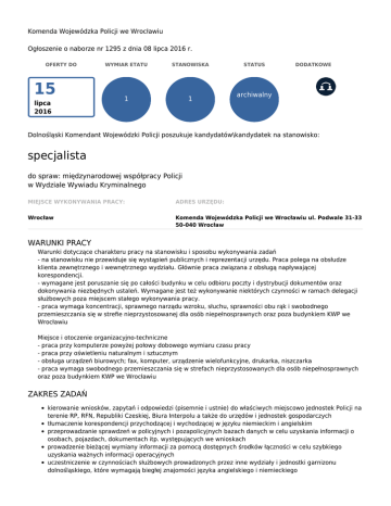 Komenda Wojewódzka Policji we Wrocławiu Ogłoszenie o naborze nr 1295 z dnia 08 lipca 2016 r. OFERTY DO 15 lipca 2016 WYMIAR ETATU STANOWISKA 1 1 STATUS DODATKOWE archiwalny Dolnośląski Komendant Wojewódzki Policji poszukuje kandydatów\kandydatek na stanowisko: specjalista do spraw: międzynarodowej współpracy Policji w Wydziale Wywiadu Kryminalnego MIEJSCE WYKONYWANIA PRACY: ADRES URZĘDU: Wrocław Komenda Wojewódzka Policji we Wrocławiu ul. Podwale 31-33 50-040 Wrocław WARUNKI PRACY Warunki dotyczące charakteru pracy na stanowisku i sposobu wykonywania zadań - na stanowisku nie przewiduje się wystąpień publicznych i reprezentacji urzędu. Praca polega na obsłudze klienta zewnętrznego i wewnętrznego wydziału. Głównie praca związana z obsługą napływającej korespondencji. - wymagane jest poruszanie się po całości budynku w celu odbioru poczty i dystrybucji dokumentów oraz dokonywania niezbędnych ustaleń. Wymagane jest też wykonywanie niektórych czynności w ramach delegacji służbowych poza miejscem stałego wykonywania pracy. - praca wymaga koncentracji, sprawnego narządu wzroku, słuchu, sprawności obu rąk i swobodnego przemieszczania się w strefie nieprzystosowanej dla osób niepełnosprawnych oraz poza budynkiem KWP we Wrocławiu Miejsce i otoczenie organizacyjno-techniczne - praca przy komputerze powyżej połowy dobowego wymiaru czasu pracy - praca przy oświetleniu naturalnym i sztucznym - obsługa urządzeń biurowych; fax, komputer, urządzenie wielofunkcyjne, drukarka, niszczarka - praca wymaga swobodnego przemieszczania się w strefach nieprzystosowanych dla osób niepełnosprawnych oraz poza budynkiem KWP we Wrocławiu ZAKRES ZADAŃ kierowanie wniosków, zapytań i odpowiedzi (pisemnie i ustnie) do właściwych miejscowo jednostek Policji na terenie RP, RFN, Republiki Czeskiej, Biura Interpolu a także do urzędów i jednostek gospodarczych tłumaczenie korespondencji przychodzącej i wychodzącej w języku niemieckim i angielskim przeprowadzanie sprawdzeń w policyjnych i pozapolicyjnych bazach danych w celu uzyskania informacji o osobach, pojazdach, dokumentach itp. występujących we wnioskach prowadzenie bieżącej wymiany informacji za pomocą dostępnych środków łączności w celu szybkiego uzyskania ważnych informacji operacyjnych uczestniczenie w czynnościach służbowych prowadzonych przez inne wydziały i jednostki garnizonu dolnośląskiego, które wymagają biegłej znajomości języka angielskiego i niemieckiego WYMAGANIA NIEZBĘDNE Wykształcenie: wyższe magisterskie znajomość języka niemieckiego na poziomie C1 znajomość ustawy o Policji w zakresie uprawnień Policji znajomość obsługi systemów informatycznych znajomość procedur i obiegu dokumentacji kancelaryjno-biurowej znajomość przepisów dotyczących archiwizacji dokumentów organizacja pracy własnej współpraca z innymi pracownikami, dzielenie się wiedzą oraz informacjami asertywność oraz umiejętność argumentowania i przekonywania, konsultacji kwestii drażliwych Posiadanie obywatelstwa polskiego Korzystanie z pełni praw publicznych Nieskazanie prawomocnym wyrokiem za umyślne przestępstwo lub umyślne przestępstwo skarbowe WYMAGANIA DODATKOWE znajomość języka angielskiego na poziomie B2 DOKUMENTY I OŚWIADCZENIA NIEZBĘDNE Życiorys/CV i list motywacyjny Kopie dokumentów potwierdzających spełnienie wymagania niezbędnego w zakresie wykształcenia kopie dokumentów potwierdzających spełnienie wymagania niezbędnego w zakresie znajomości języka niemieckiego na poziomie C1 Oświadczenie o posiadaniu obywatelstwa polskiego albo kopia dokumentu potwierdzającego posiadanie polskiego obywatelstwa Oświadczenie o wyrażeniu zgody na przetwarzanie danych osobowych do celów naboru Oświadczenie o korzystaniu z pełni praw publicznych Oświadczenie o nieskazaniu prawomocnym wyrokiem za umyślne przestępstwo lub umyślne przestępstwo skarbowe DOKUMENTY I OŚWIADCZENIA DODATKOWE kopie dokumentów potwierdzających spełnienie wymagania dodatkowego w zakresie znajomości języka angielskiego na poziomie B2 kopie innych dokumentów potwierdzających wymagane doświadczenie, przeszkolenie, umiejętności, uprawnienia itp. TERMINY I MIEJSCE SKŁADANIA DOKUMENTÓW Dokumenty należy złożyć do: 15 lipca 2016 r. Decyduje data: stempla pocztowego / osobistego dostarczenia oferty do urzędu Miejsce składania dokumentów: Dokumenty można przesyłać drogą pocztową na adres: Komenda Wojewódzka Policji we Wrocławiu Wydział Kadr i Szkolenia ul. Podwale 31-33 50-040 Wrocław lub składać osobiście-za potwierdzeniem odbioru-w siedzibie KWP we Wrocławiu–wejście ul. Podwale 31-33 od poniedziałku do piątku między g.8.00 a 15. INNE INFORMACJE: W miesiącu poprzedzającym datę upublicznienia ogłoszenia wskaźnik zatrudnienia osób niepełnosprawnych w urzędzie, w rozumieniu przepisów o rehabilitacji zawodowej i społecznej oraz zatrudnianiu osób niepełnosprawnych, wynosi co najmniej 6%. W aplikacji kandydaci powinni wskazać numer ogłoszenia o naborze. Wysokość proponowanego wynagrodzenia zasadniczego: mnożnik kwoty bazowej 1,4000 (co stanowi kwotę 2 623,38 zł brutto) O zakwalifikowaniu, niezakwalifikowaniu, sposobie rozparzenia aplikacji oraz zakończenia naboru kandydaci będą informowani drogą elektroniczną, w związku z tym w dokumentach należy podać adres poczty elektronicznej/e-mail. Kandydaci, którzy spełnią wymogi formalne określone w ogłoszeniu zostaną poinformowani drogą elektroniczną (telefonicznie w przypadku braku adresu e-mailowego) o terminie i miejscu przeprowadzenia kolejnych etapów naboru oraz o stosowanych technikach (metodach) selekcji (np. test wiedzy, rozmowa kwalifikacyjna, zadanie praktyczne). Uwaga! Weryfikacja spełnienia przez kandydatów wymagań formalnych dokonywana jest poprzez kryterium kompletności i terminowości, na podstawie dokumentów wymienionych w części „wymagane doku